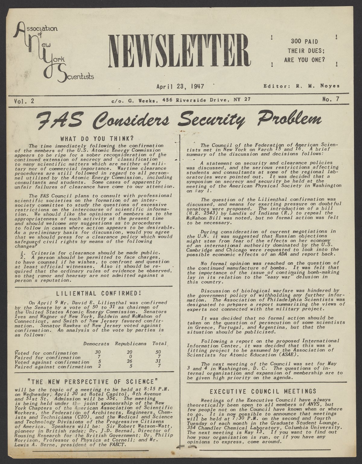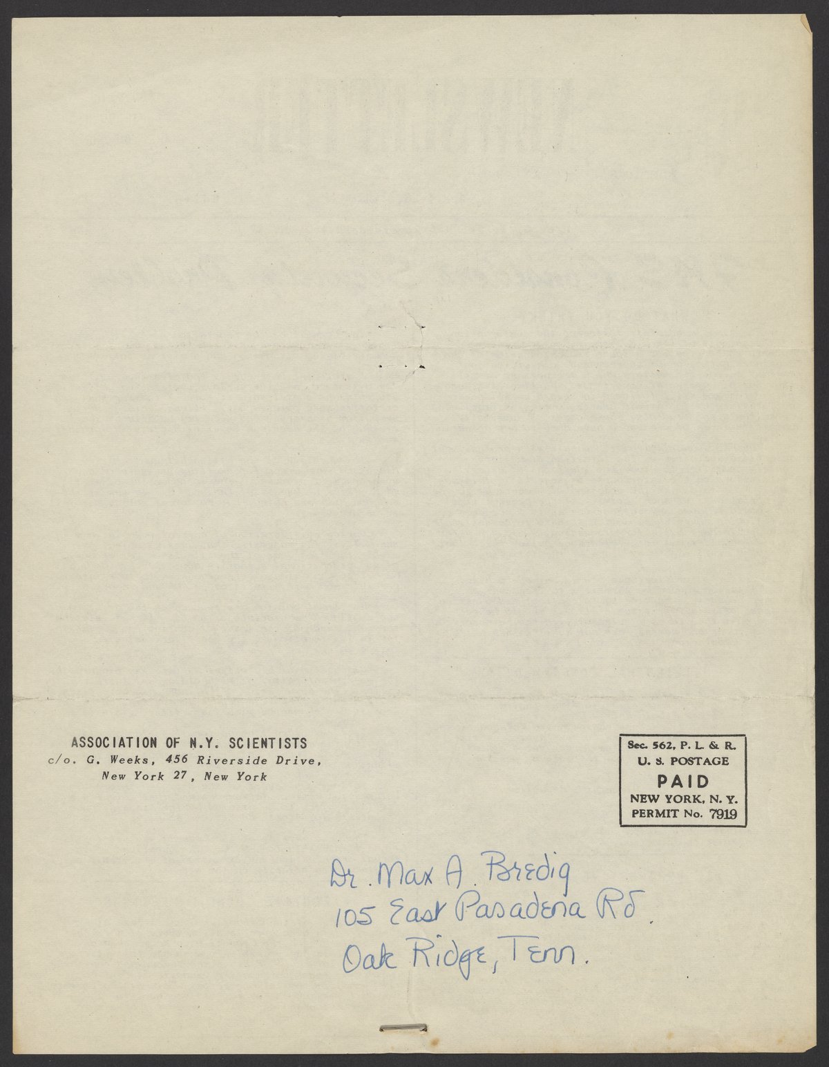 Association of New York Scientists. “Association of New York Scientists Newsletter, April 23, 1947,” April 23, 1947. Papers of Georg and Max Bredig, Box 10, Folder 3. Science History Institute. Philadelphia. https://digital.sciencehistory.org/works/j4ruiik.