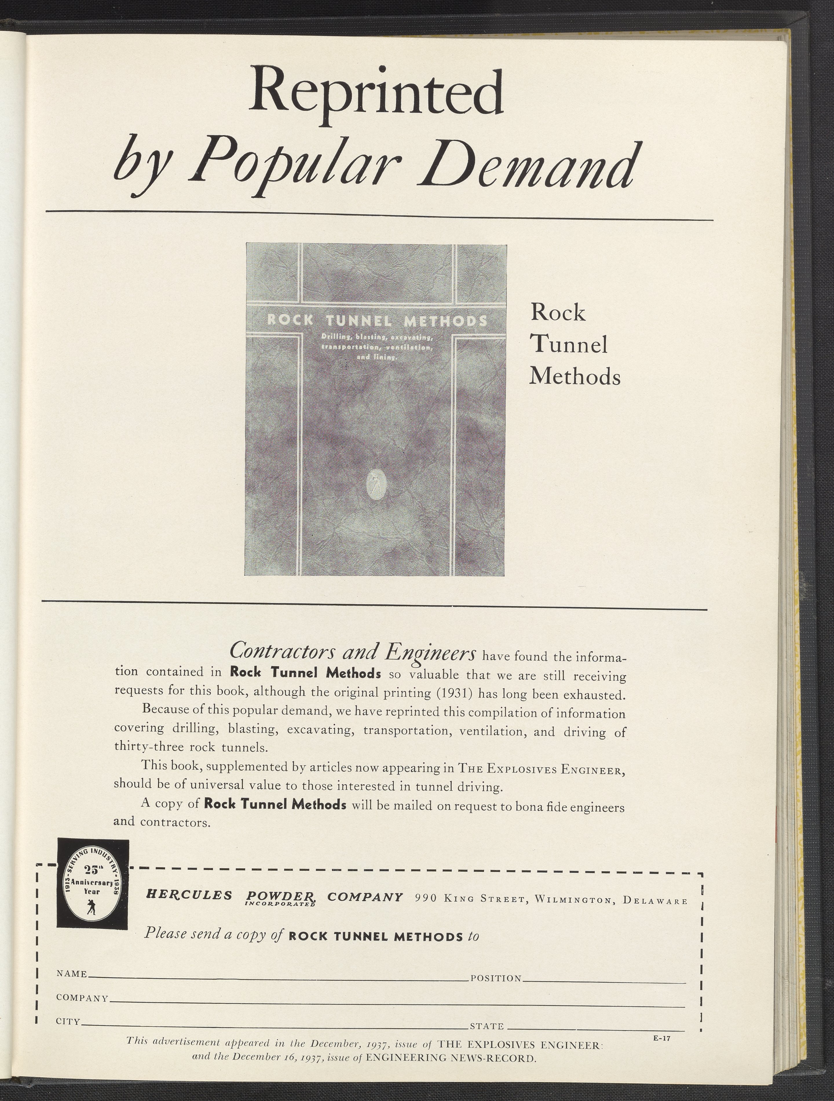 Hercules Incorporated. “Reprinted by Popular Demand: Rock Tunnel Methods.” 1937 Hercules Advertisements, 1937. Records of Hercules Incorporated, Volume 1937. Science History Institute. Philadelphia. https://digital.sciencehistory.org/works/j6731459s.