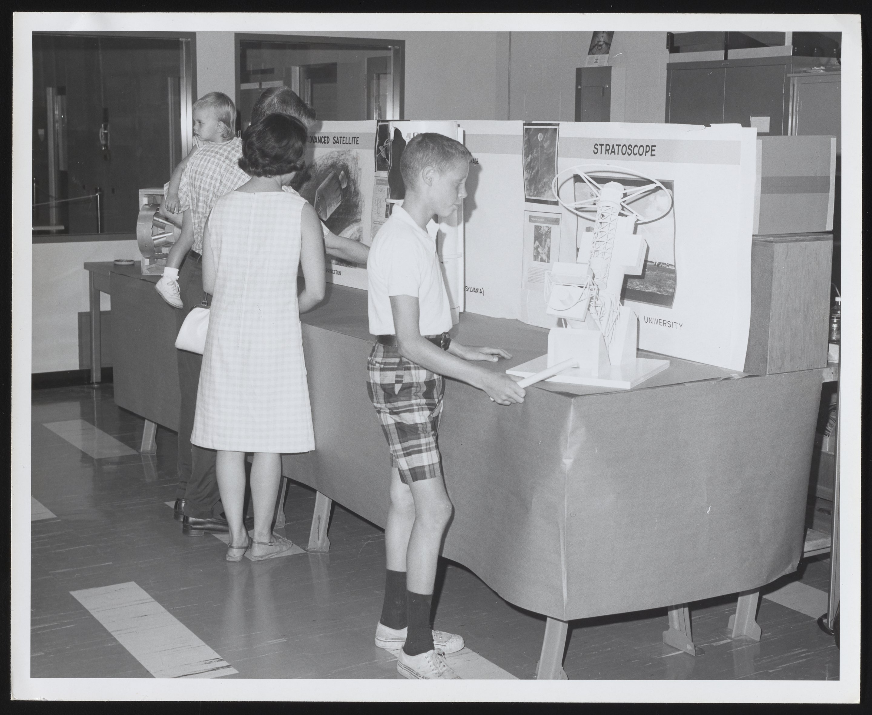 General view of a young boy examining a model of a stratoscope, a balloon-borne astronomical telescope designed to study the turbulence and granulation in the Sun's photosphere, as well as planetary atmospheres. Several other individuals and exhibit displays are visible in the background. Stratoscopes were conceived of by astrophysicist Martin Schwarzschild (1912-1997) and primarily flown from the 1950's to the 1970's.