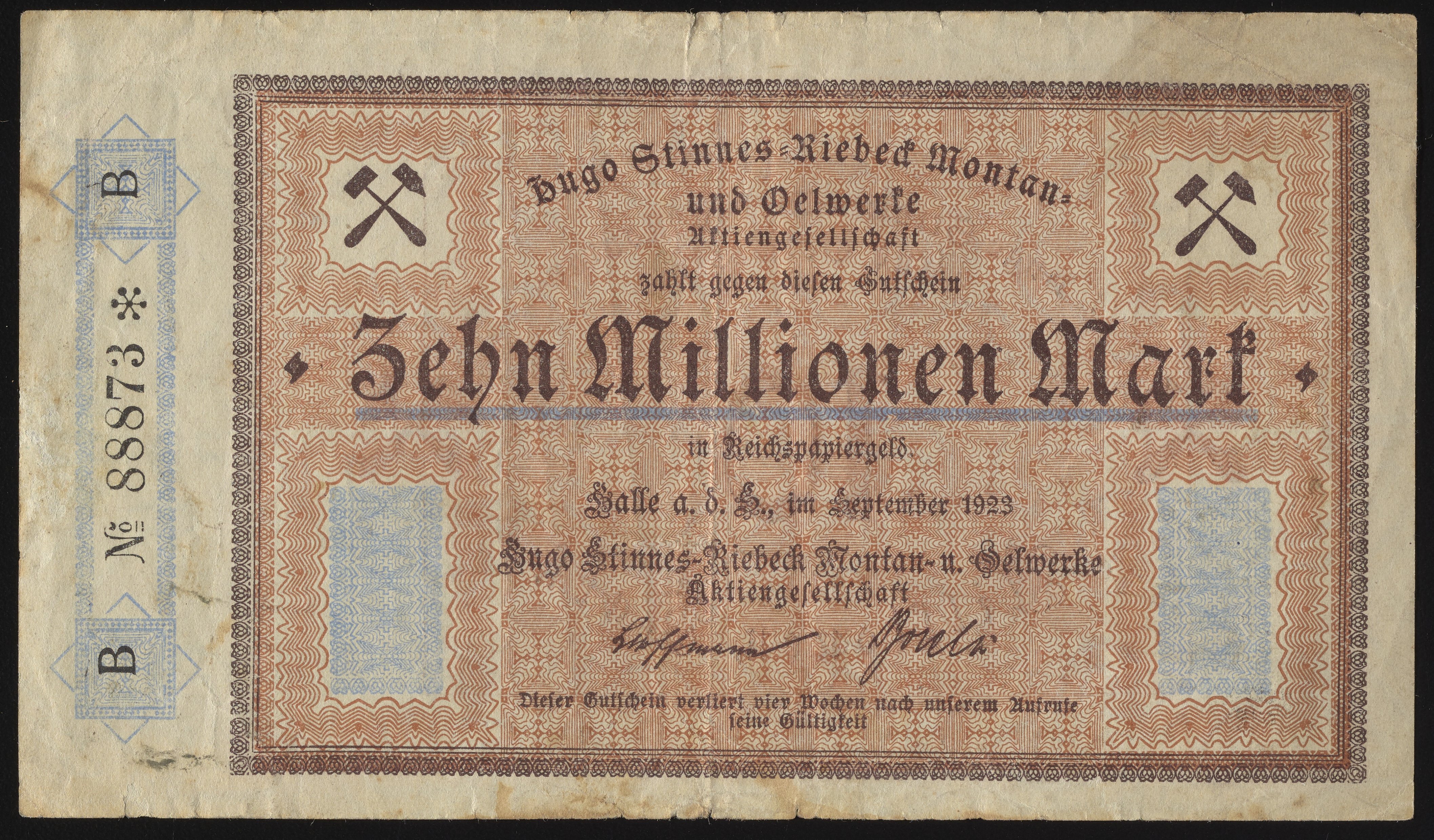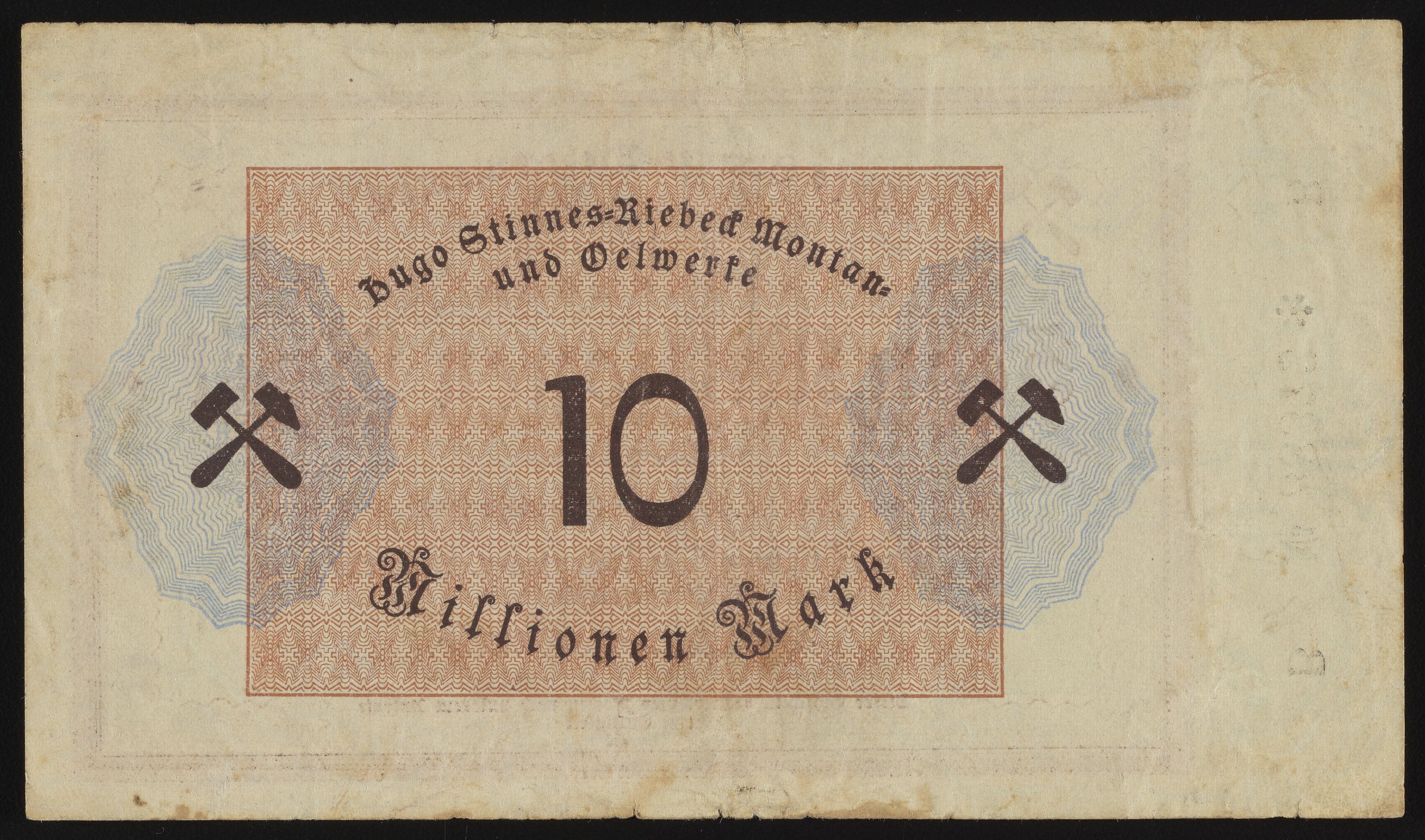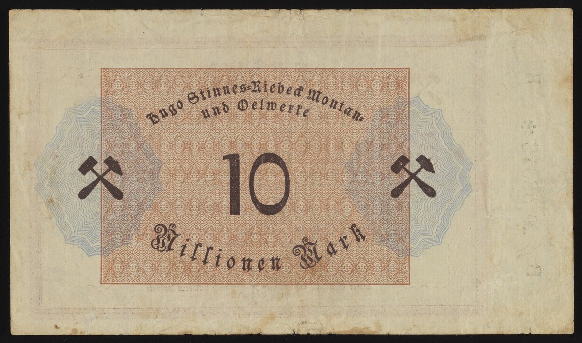 Small JPG1200 x 703px — 274 KBLarge JPG2880 x 1688px — 1.4 MBFull-sized JPG4231 x 2480px — 2.6 MBOriginal fileTIFF — 4231 x 2480px — 30.1 MBThis Zehn Millionen Mark Gutschein, or ten million Mark voucher, was issued by Hugo Stinnes-Riebeck Montan und Oelwerke (Hugo Stinnes-Riebeck Mining and Oil Works). Styled after a banknote, the rectp and verso of this company scrip include crossed hammer and pick symbols representing the mining industry. Paper features a watermark design.