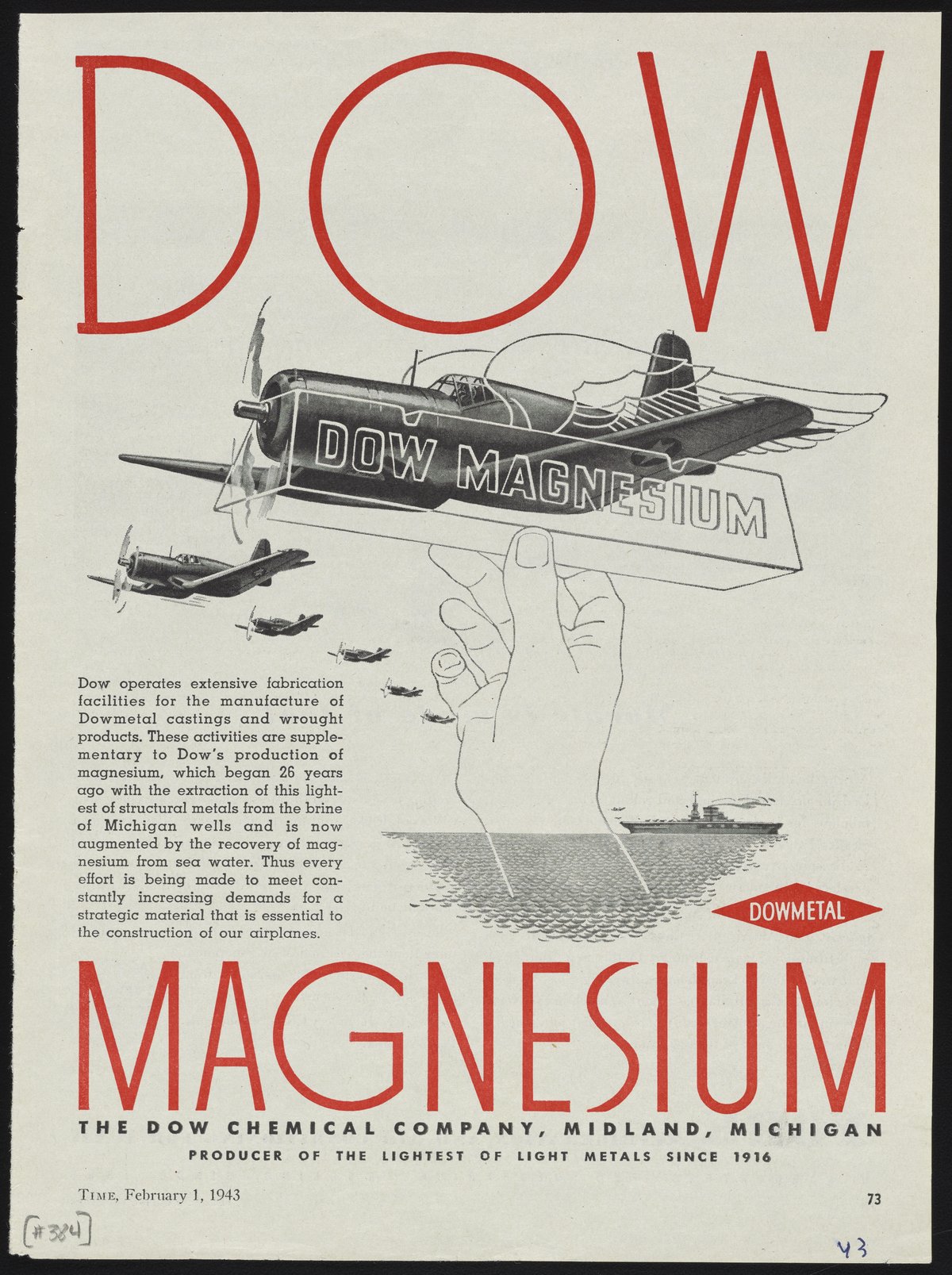 Dow Chemical Company. “Advertisement for Dowmetal Magnesium,” February 1, 1943. Advertisements from the Dow Chemical Historical Collection, Box 8. Science History Institute. Philadelphia. https://digital.sciencehistory.org/works/j7kwp71.