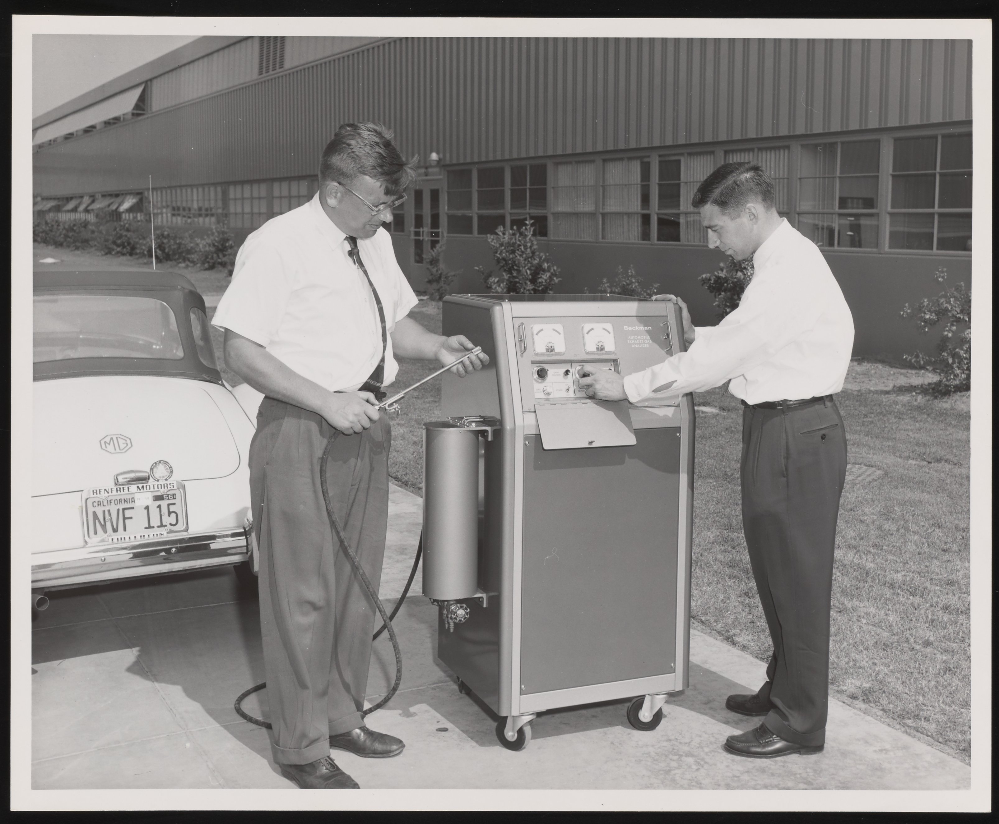 Dietrich, T. A. “Bill Houbin and an Unidentified Man with Beckman Automobile Exhaust Analyzer,” 1956. Beckman Historical Collection, Box 55, Folder 173. Science History Institute. Philadelphia. https://digital.sciencehistory.org/works/j9602064p.