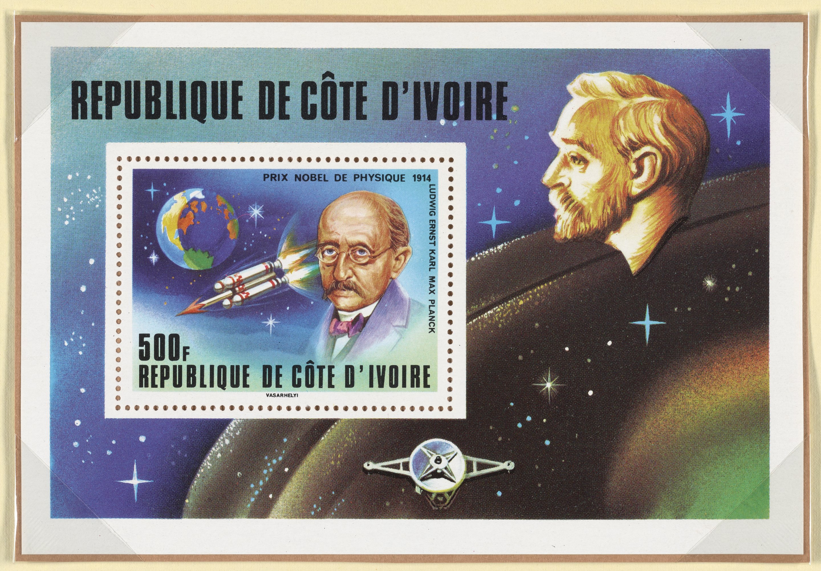 Postage stamp on souvenir sheet from the Ivory Coast commemorating Max Planck's Nobel Prize in Physics