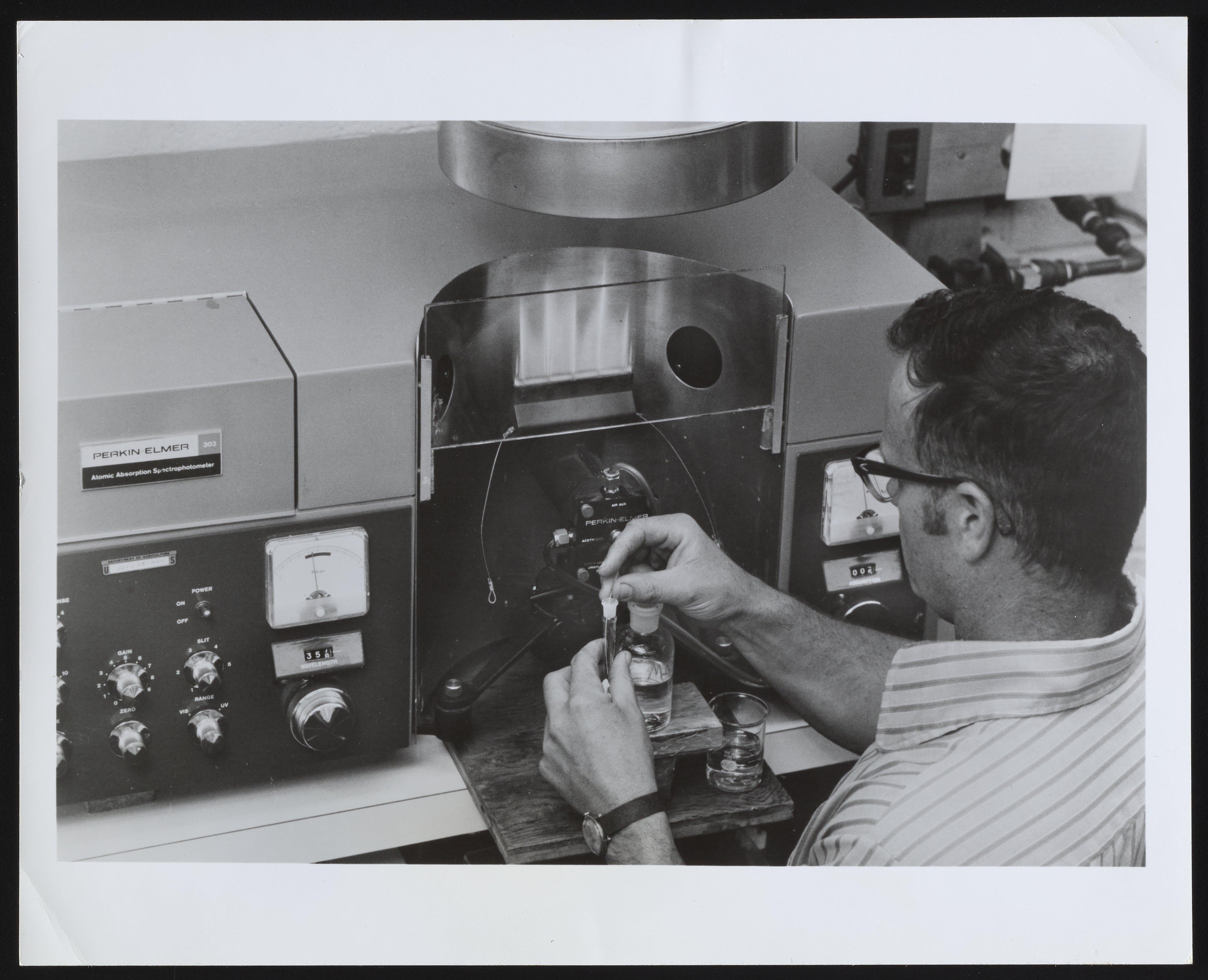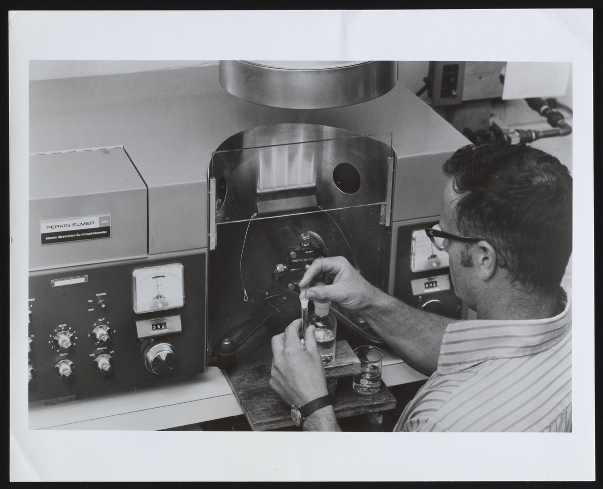 Close-up view of a Perkin-Elmer Model 303 Atomic Absorption Spectrophotometer in use at an unidentified facility. The individual visible in the photograph is also unidentified.