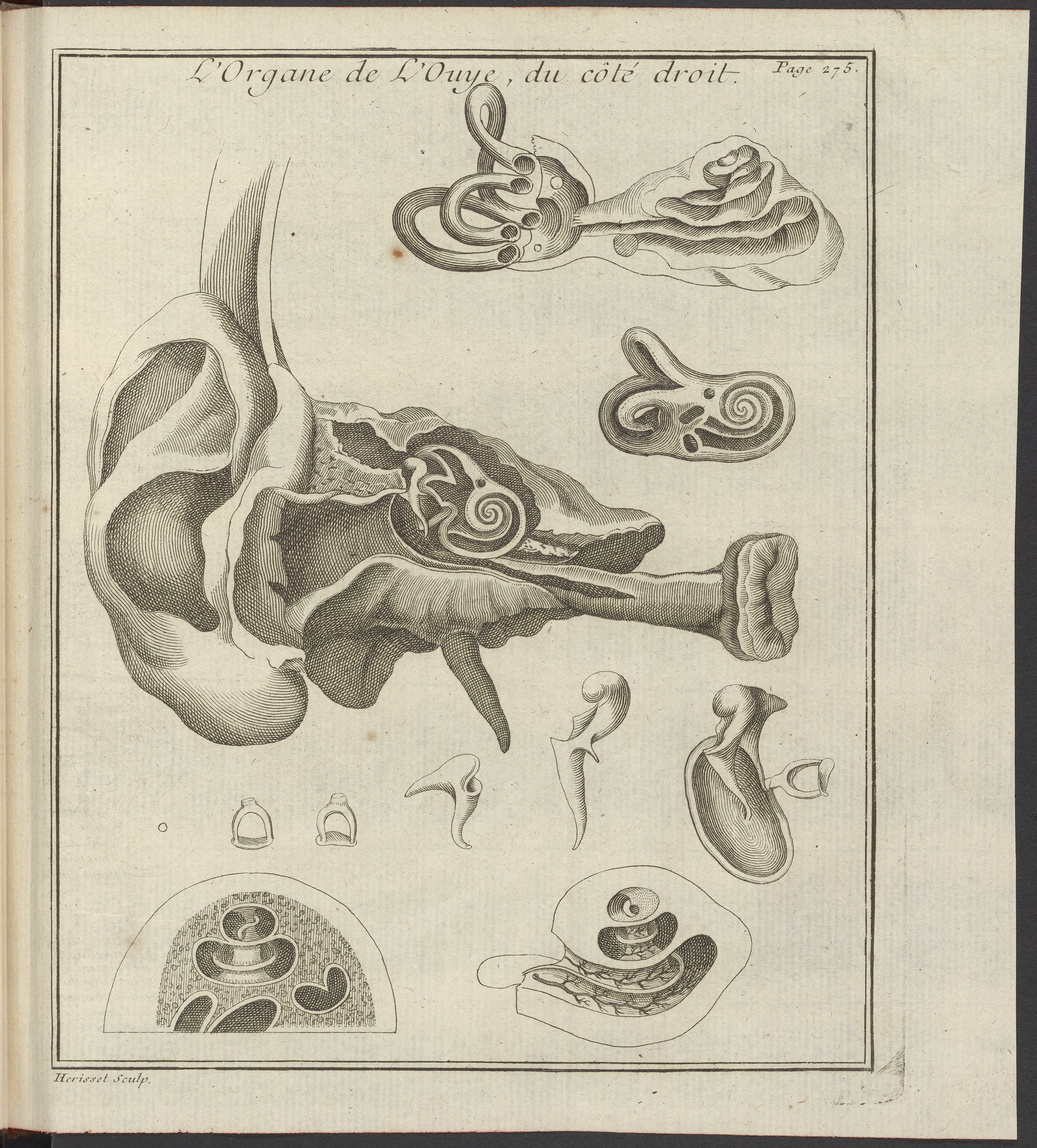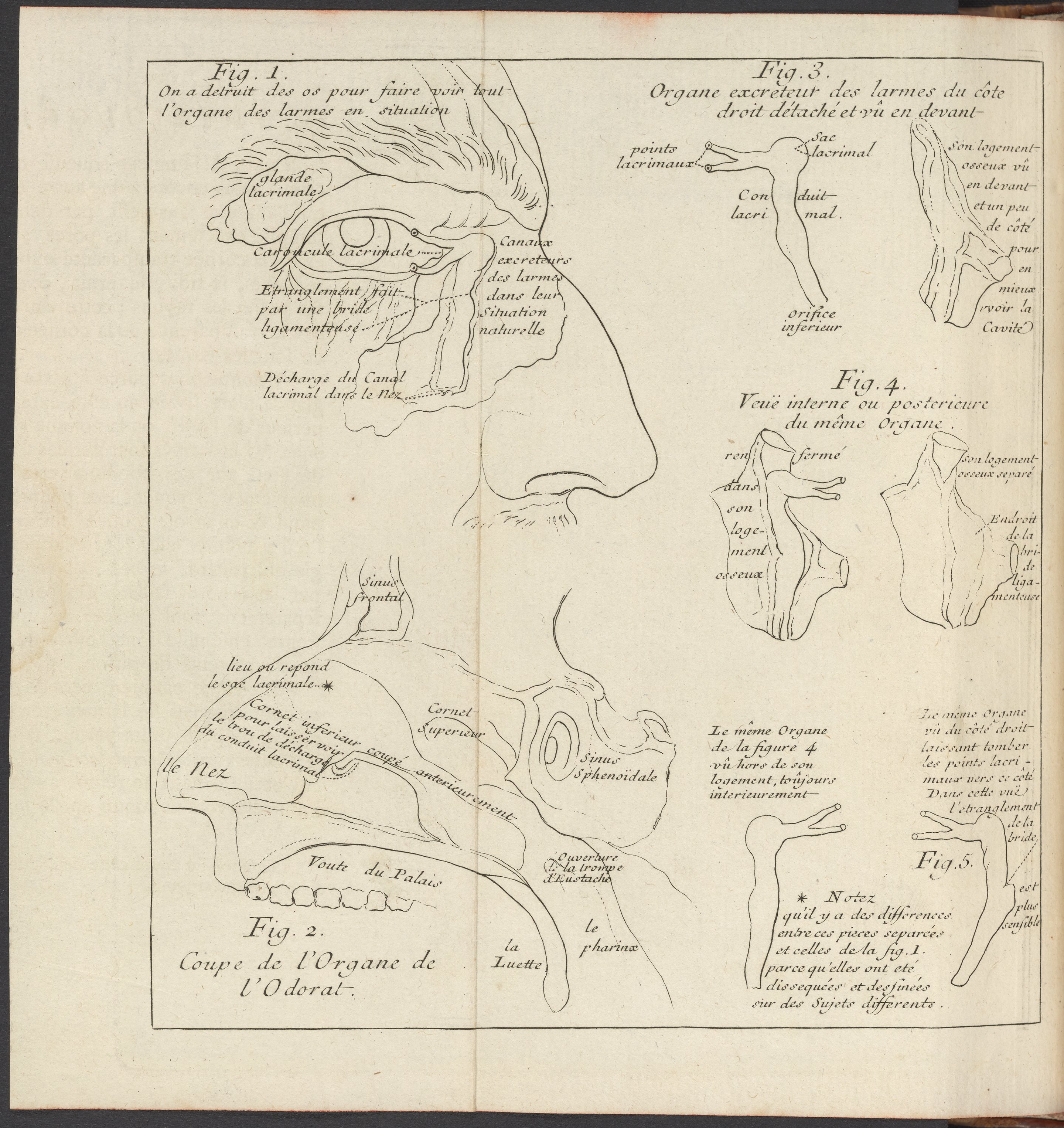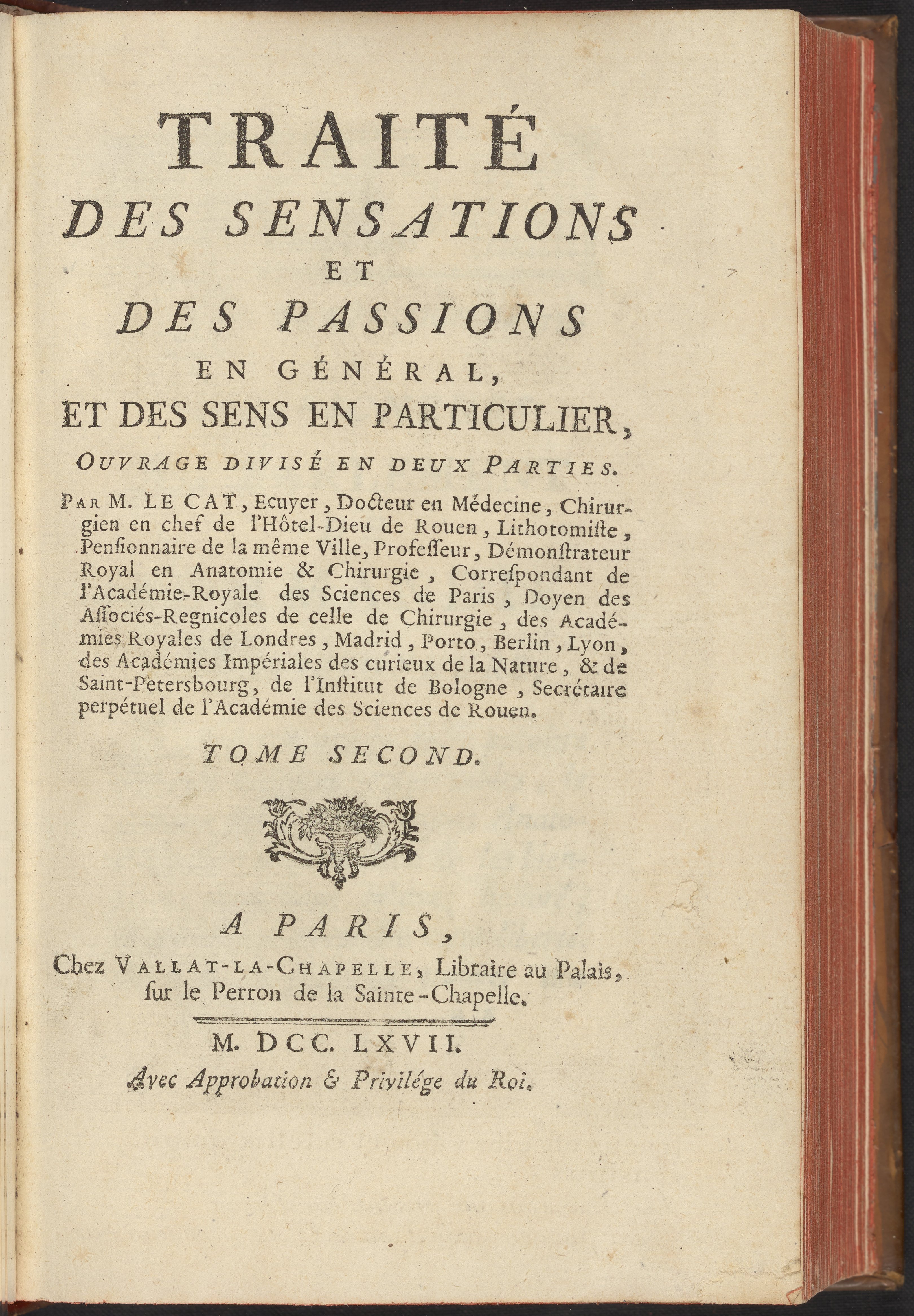 Small JPG1200 x 1728px — 399 KBLarge JPG2880 x 4146px — 2.1 MBFull-sized JPG3239 x 4663px — 2.6 MBOriginal fileTIFF — 3239 x 4663px — 43.2 MBThe second of three volumes by Claude-Nicolas Le Cat (1700-1768), a French surgeon, lithotomist, researcher, and science communicator. Volume two was originally published as the Traité des sens in Rouen in 1740, though—seeing as the pagination began at 201—it was always envisioned as part of the larger work. The work of which this eventually became the second volume did not appear until a full 27 years after its initial publication and at Paris rather than Rouen, though the plates and a number of the sheets are identical, indicating that the publisher still had what was left of the first printing. By that time, the first volume had swelled to over 200 pages, so the pagination between the first two volumes is inconsistent, and Le Cat had composed a lengthy addendum to volume two. By volume three he abandons any attempt at continuity and starts the pagination over at 1. The volumes discuss the anatomy and physiology of the sense organs - the eyes, ears, nose, tongue, and skin.