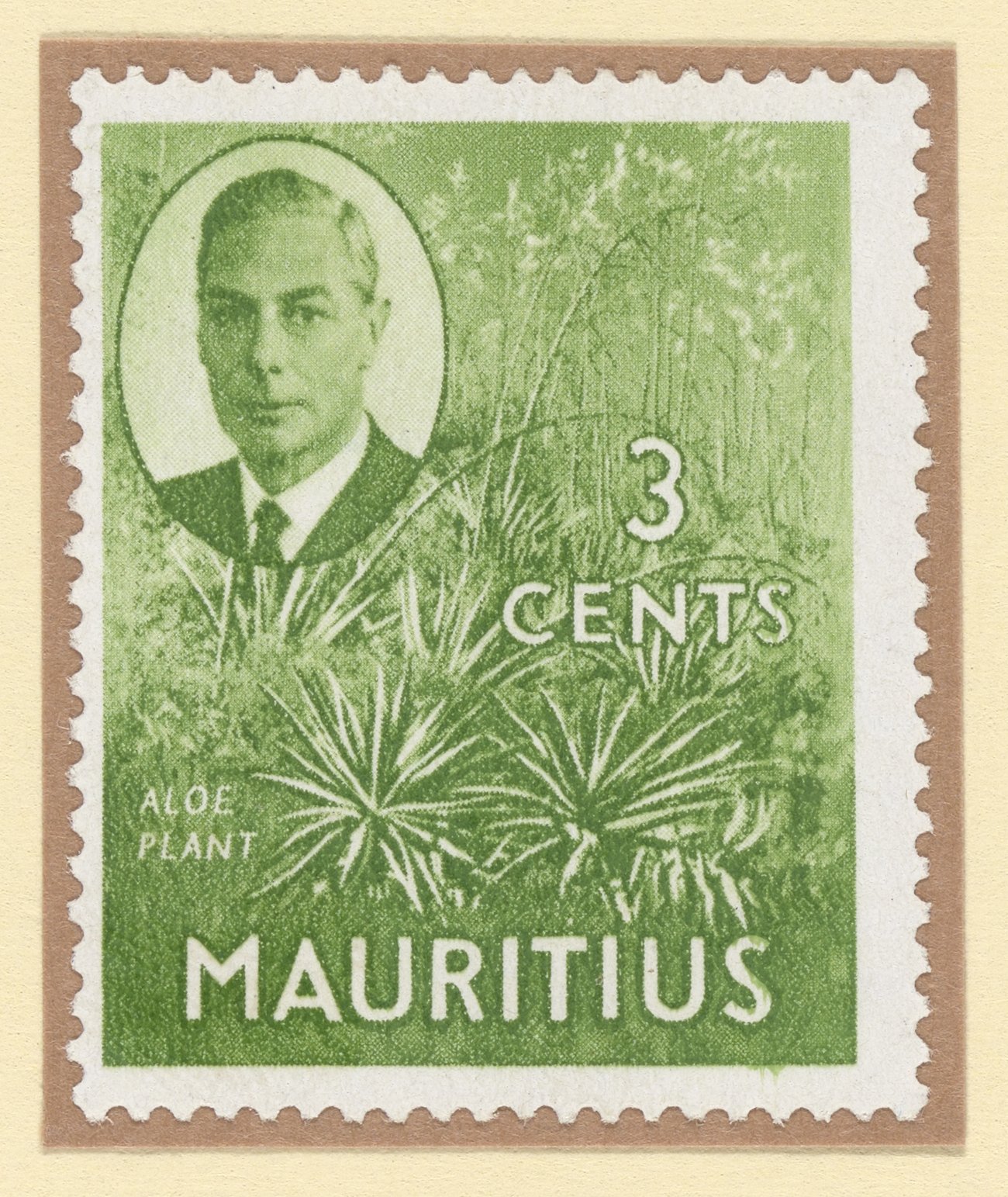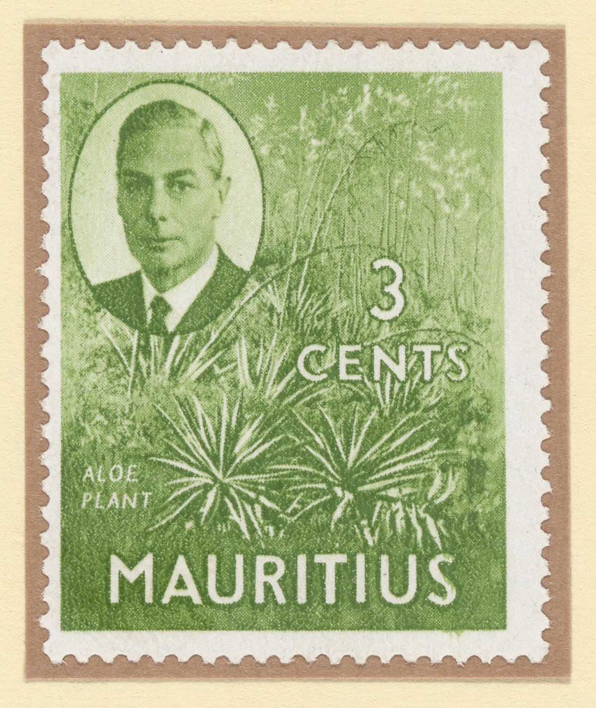 1950 postage stamp from Mauritius, featuring an illustration of an Aloe plant (Fourcroya gigantea) and a portrait of King George VI. Mauritius was a Crown colony, governed by the British from 1810 to 1968. The Aloe plant has been used in both traditional and modern medicine to treat topical skin issues, as well as digestive issues, arthritis, and infections.