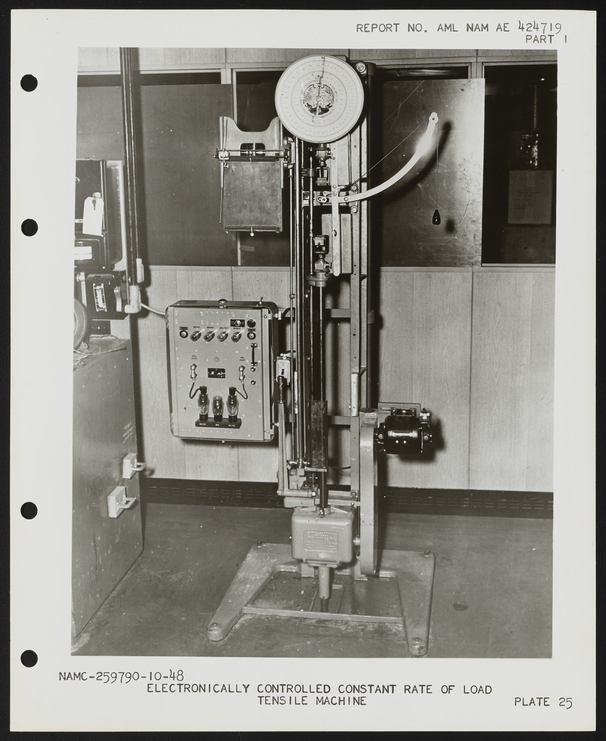 Naval Air Experimental Station, and United States. Navy. “Electronically Controlled Constant Rate of Load Tensile Machine,” circa 1949. Photographs from the Papers of J. Hartley Bowen, Box 1. Science History Institute. Philadelphia. https://digital.sciencehistory.org/works/jd472w463.