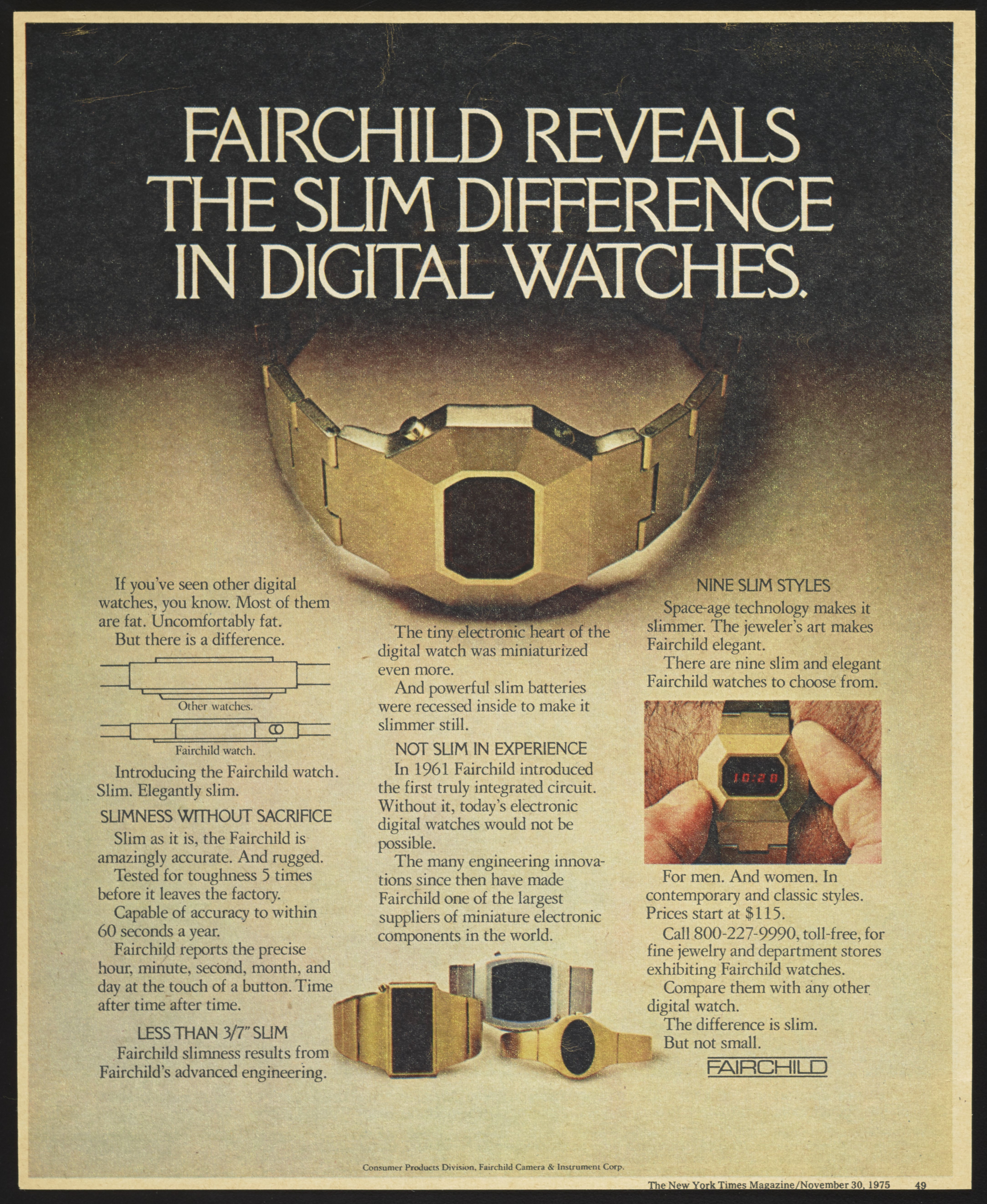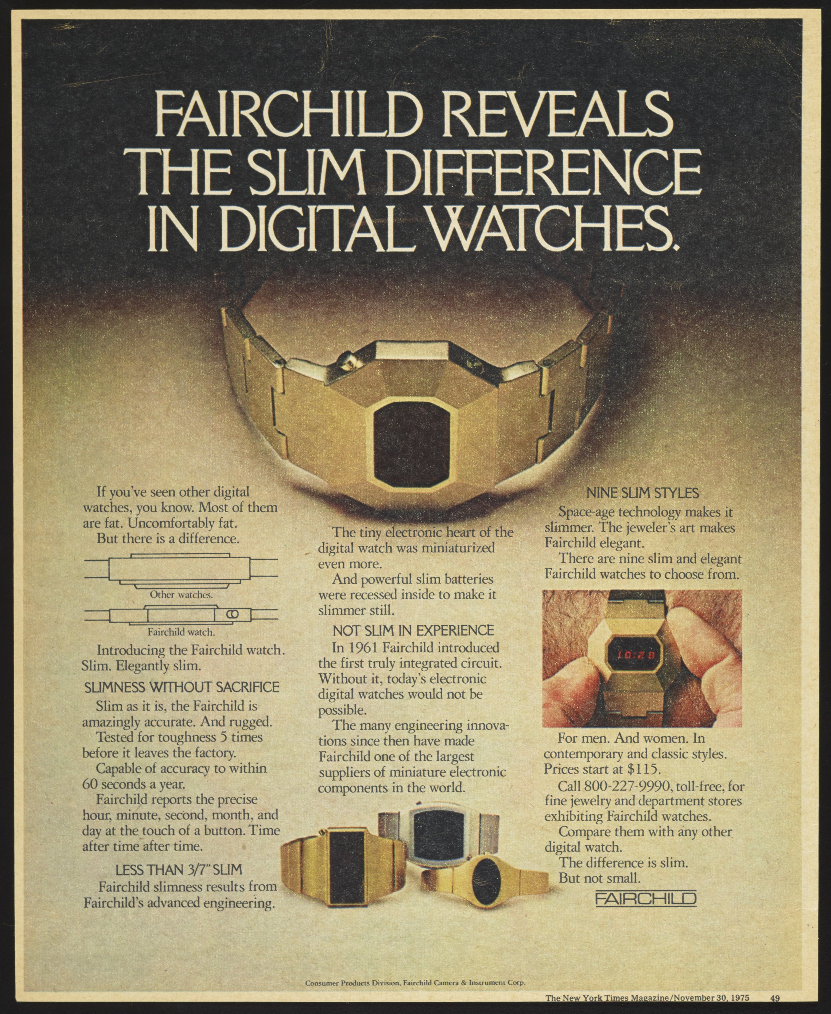 “Fairchild Reveals the Slim Difference in Digital Watches,” November 30, 1975. Science History Institute. Philadelphia. https://digital.sciencehistory.org/works/jd472w85s.