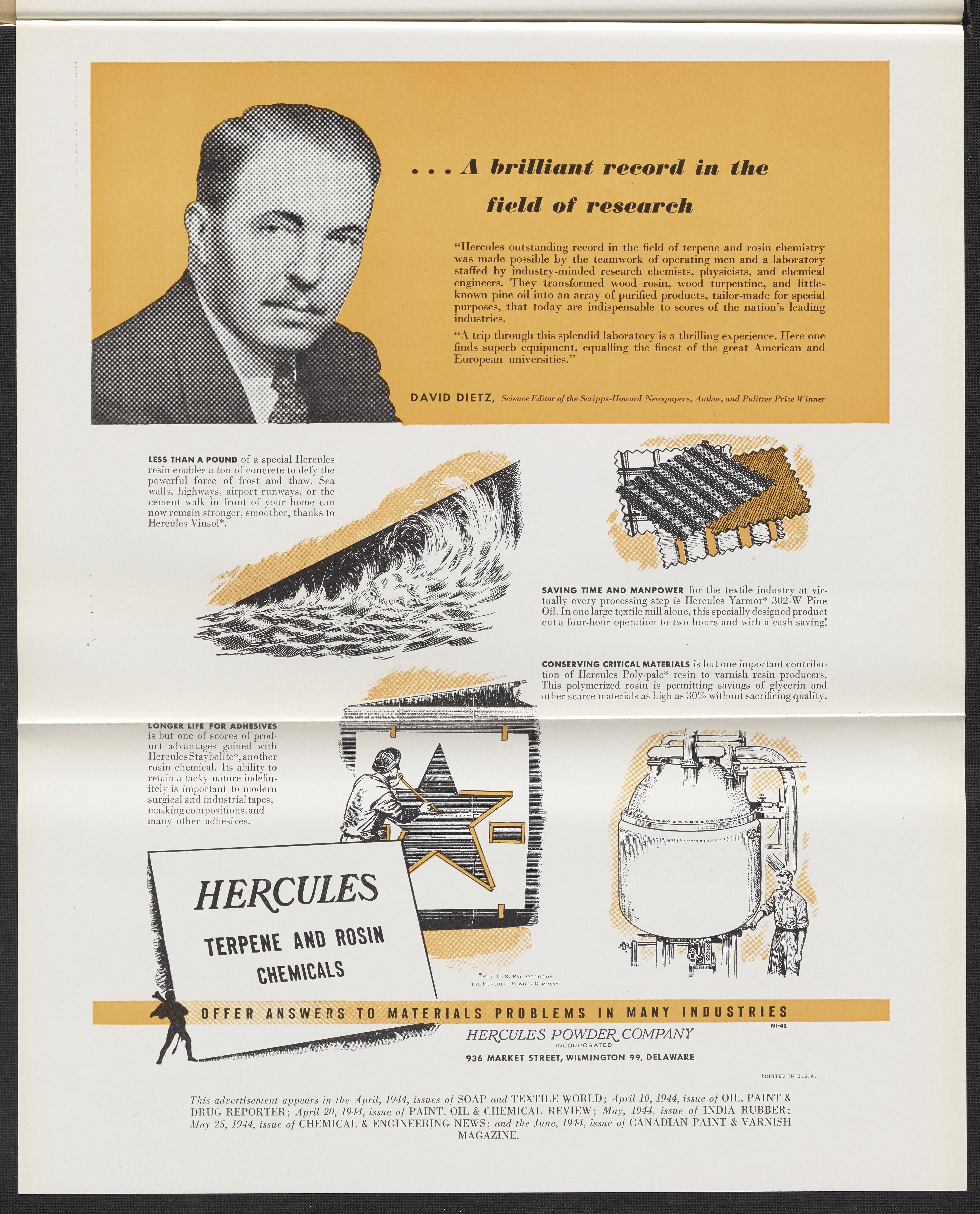 Hercules Incorporated. “...A Brilliant Record in the Field of Research.” 1944 Hercules Advertisements, 1944. Records of Hercules Incorporated, Volume 1944. Science History Institute. Philadelphia. https://digital.sciencehistory.org/works/jd472x184.