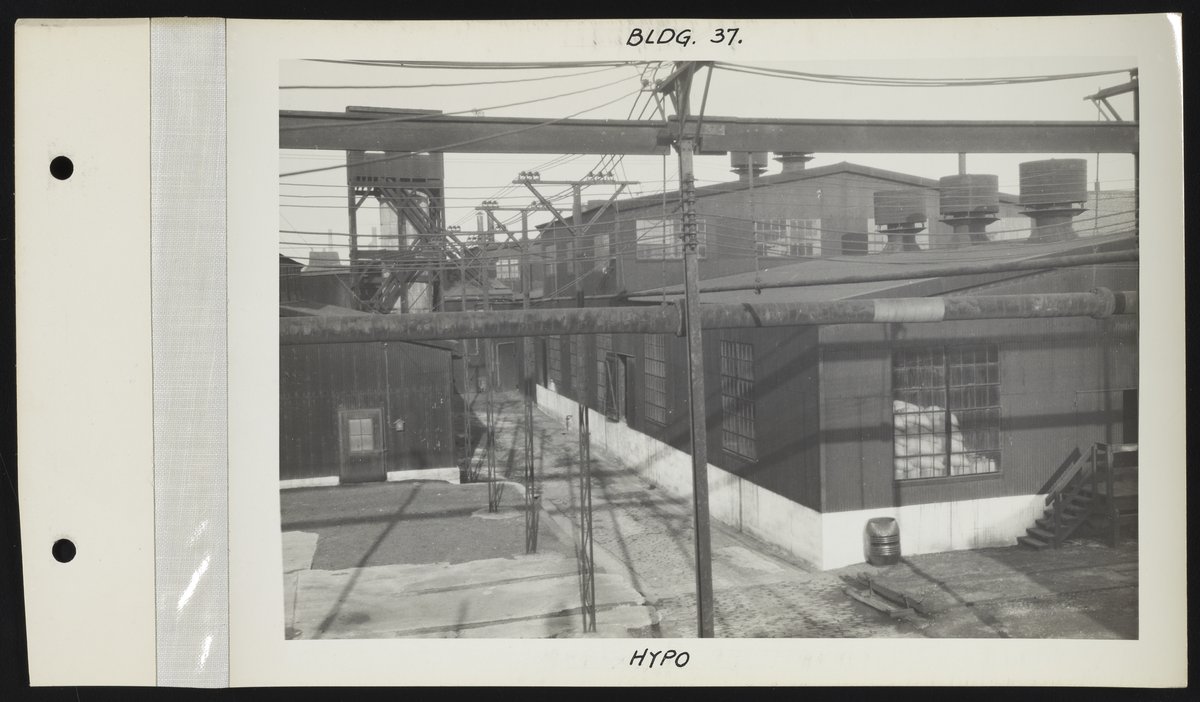 Rohm and Haas Company. “Hypo Department at Bridesburg Plant.” Exterior Views of Charles Lennig and Company Plant in Bridesburg, 1931. Rohm & Haas Company Archives, Box 27 (Photographs), Folder 8. Science History Institute. Philadelphia. https://digital.sciencehistory.org/works/jd472x37b.