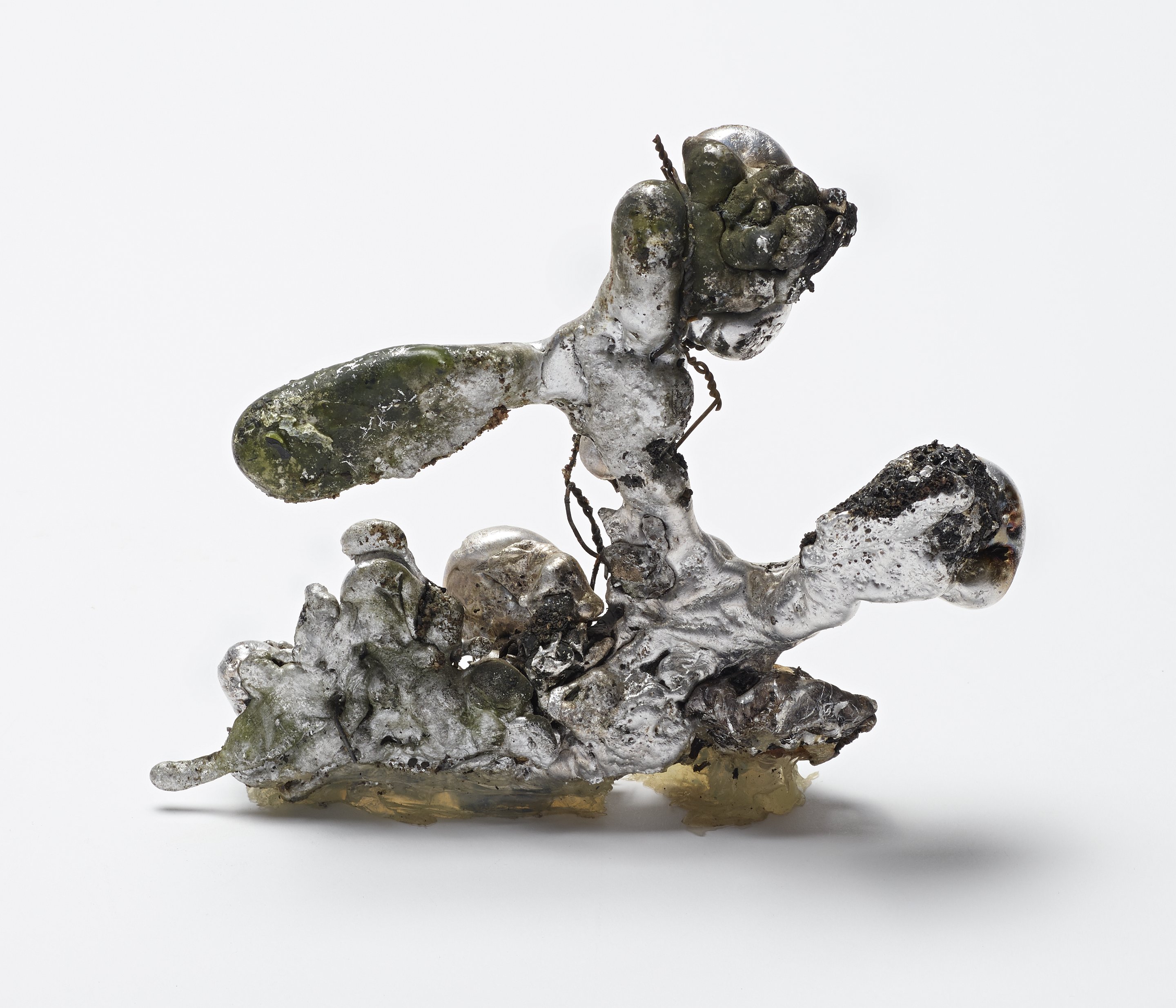 Small JPG1200 x 1028px — 149 KBLarge JPG2880 x 2468px — 684 KBFull-sized JPG3291 x 2820px — 874 KBOriginal fileTIFF — 3291 x 2820px — 26.6 MBIrregularly-shaped piece of foam-like silver plastic; pieces of twisted copper wire are holding some portions together; bottom has a wax or glue-like material coating it; some areas have a blackened, charred appearance.
