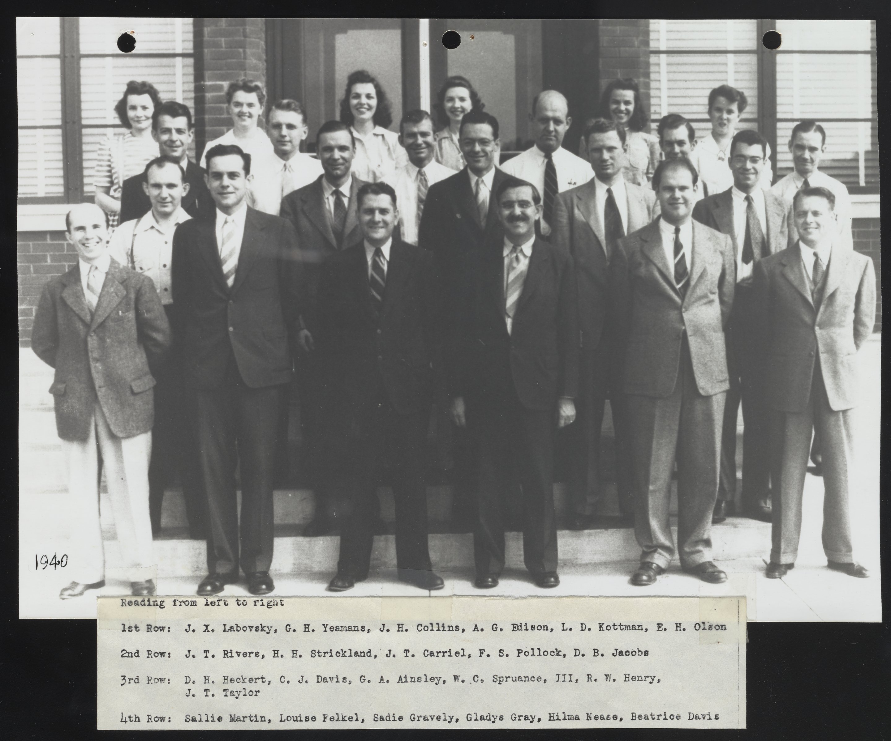 “Group Photograph of Martinsville Technical Staff,” 1940. Joseph X. Labovsky Collection of Nylon Photographs and Ephemera, Box 2. Science History Institute. Philadelphia. https://digital.sciencehistory.org/works/jm214p21q.