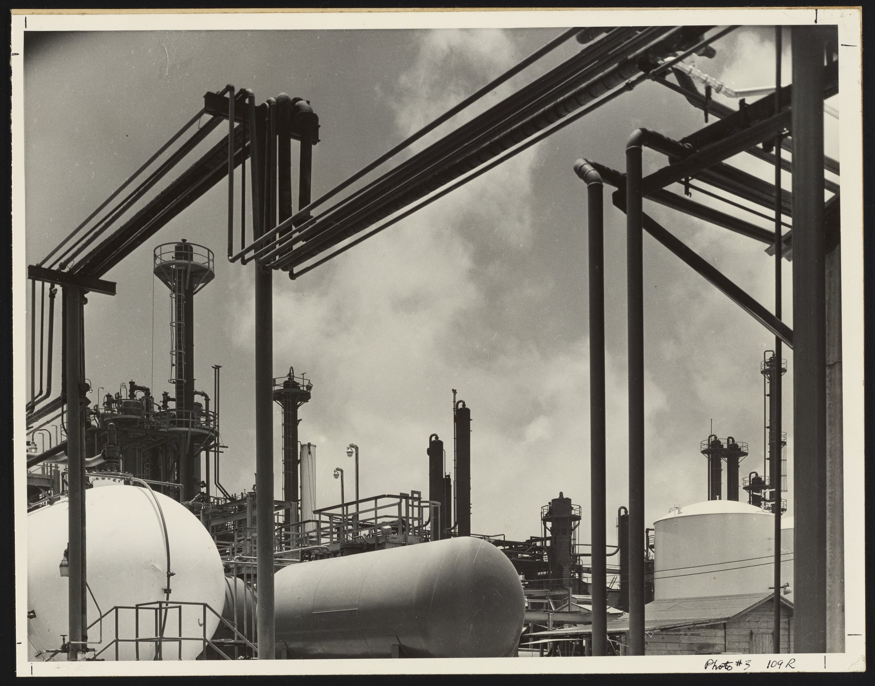 General view of the exterior of a section of the Dow Chemical Company Texas Division plant located in Freeport, Texas. A range of products and processes were researched, developed, and produced at the plant, including chlorination, phenol, and magnesium.