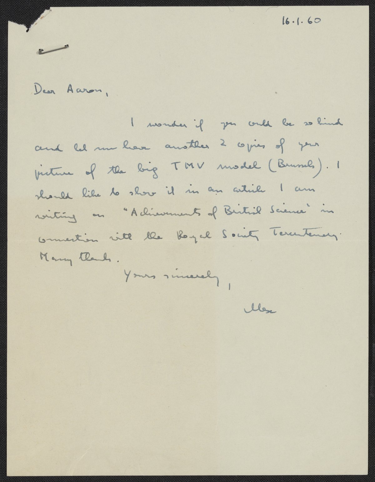 Letter from Max Perutz to Aaron Klug, January 16, 1960