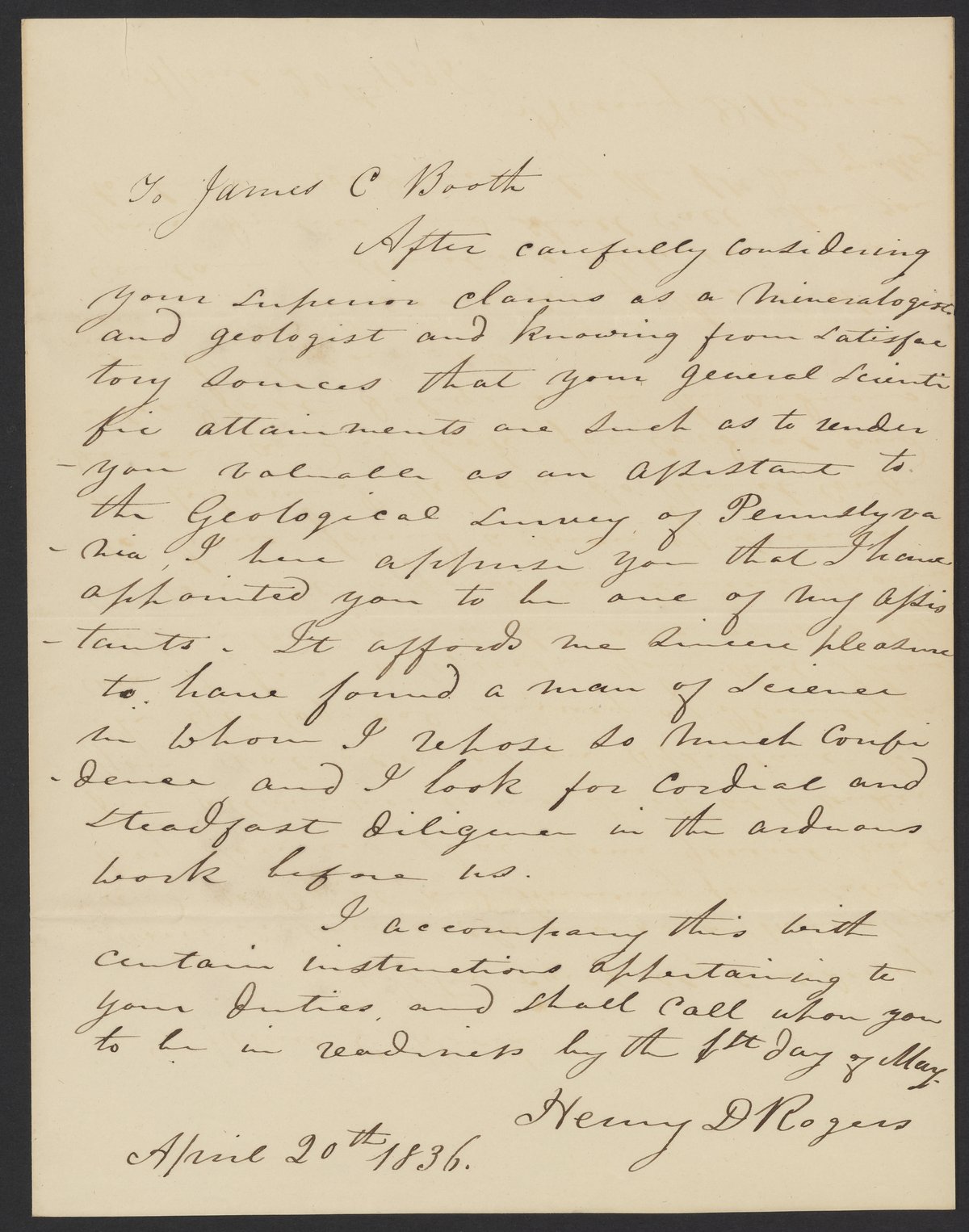 Letter from Henry D. Rogers to James Curtis Booth, April 20, 1836
