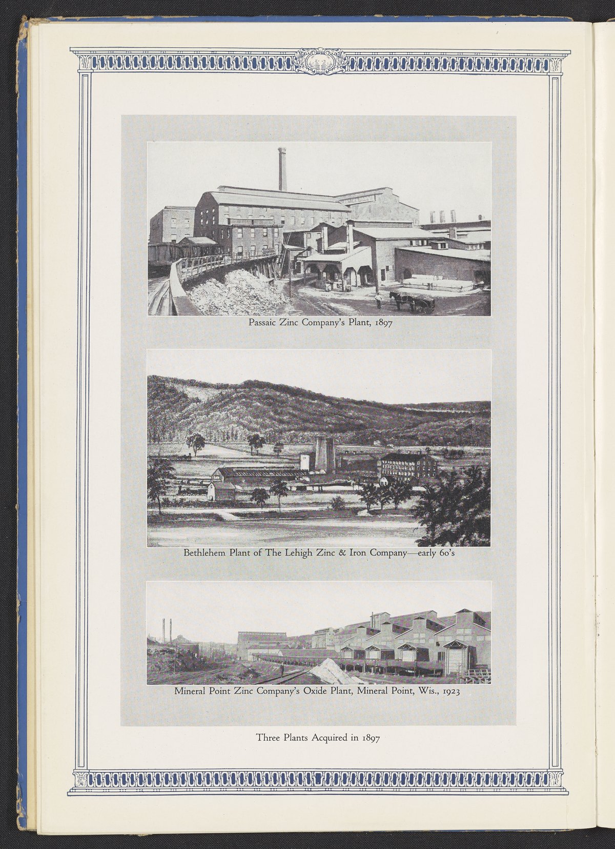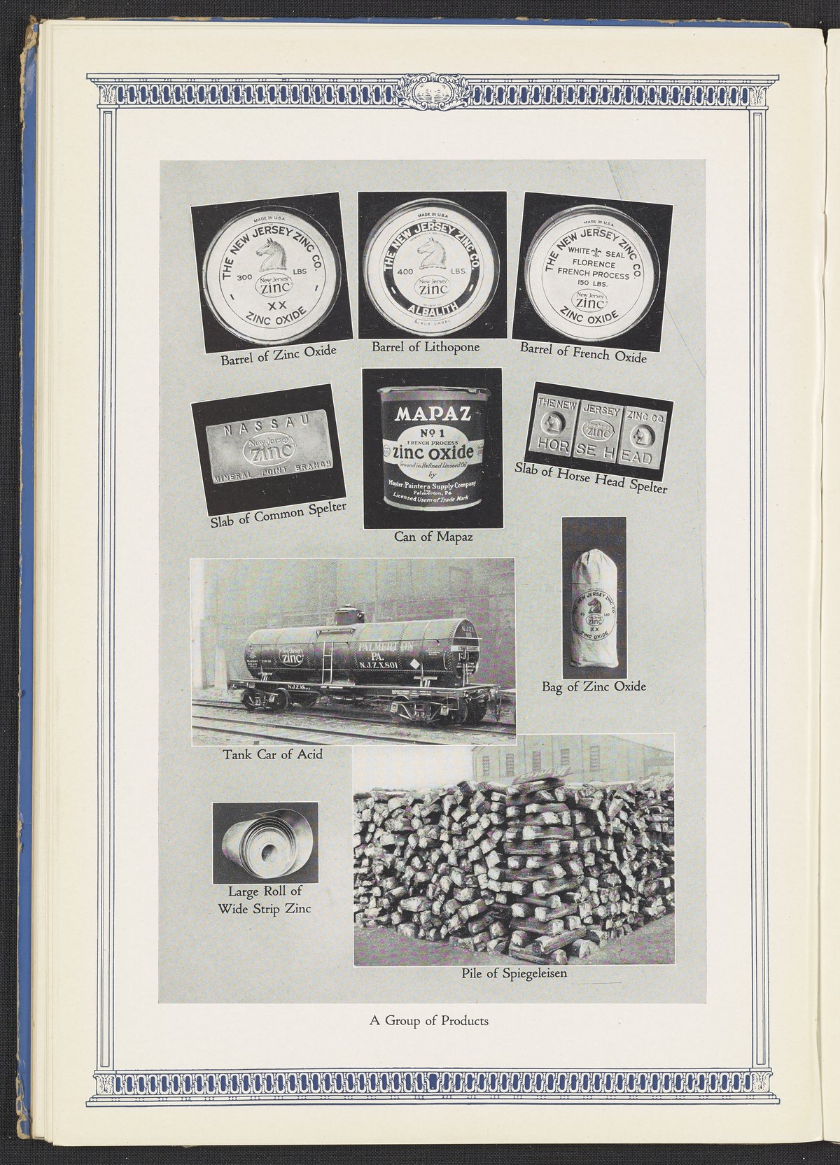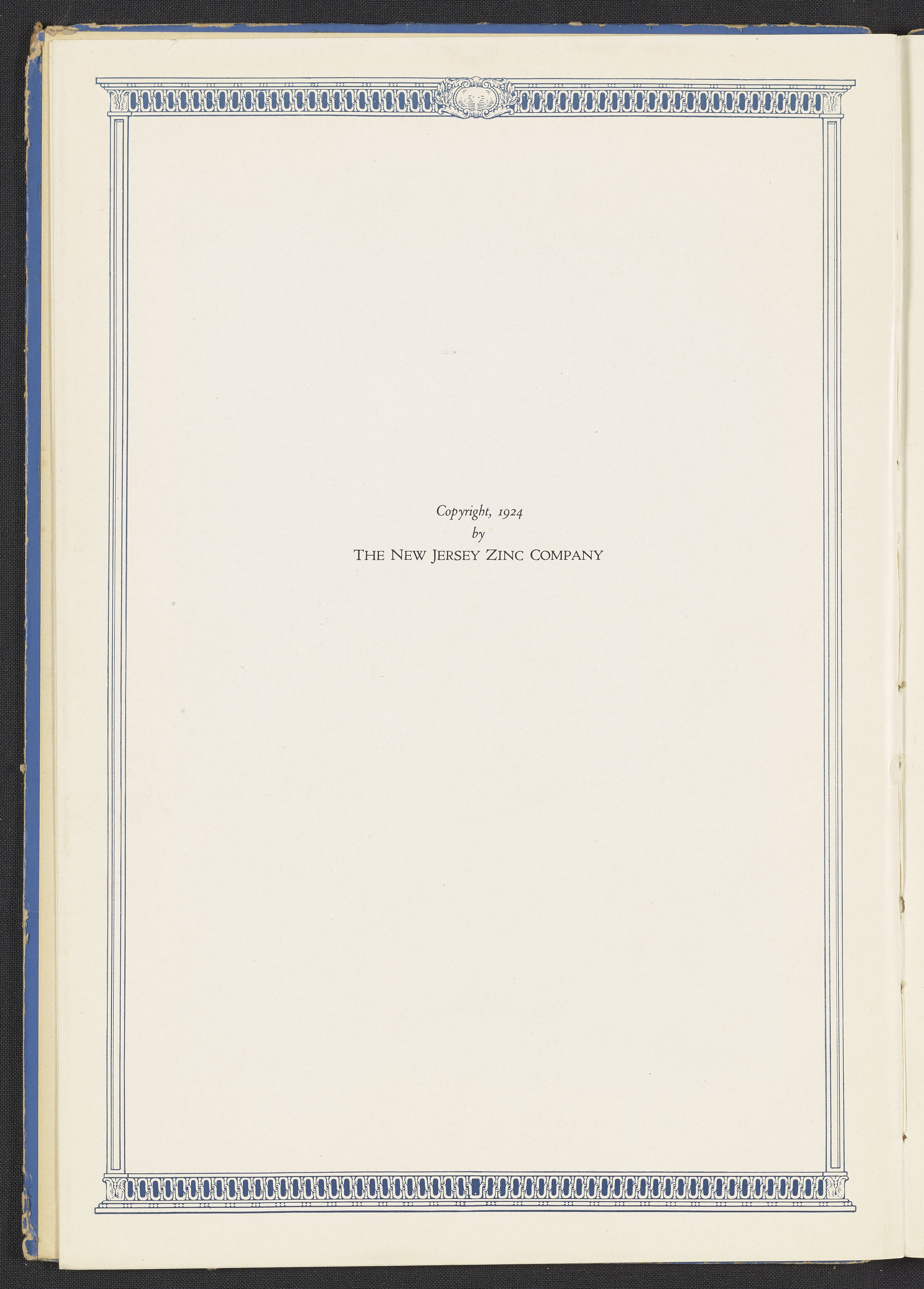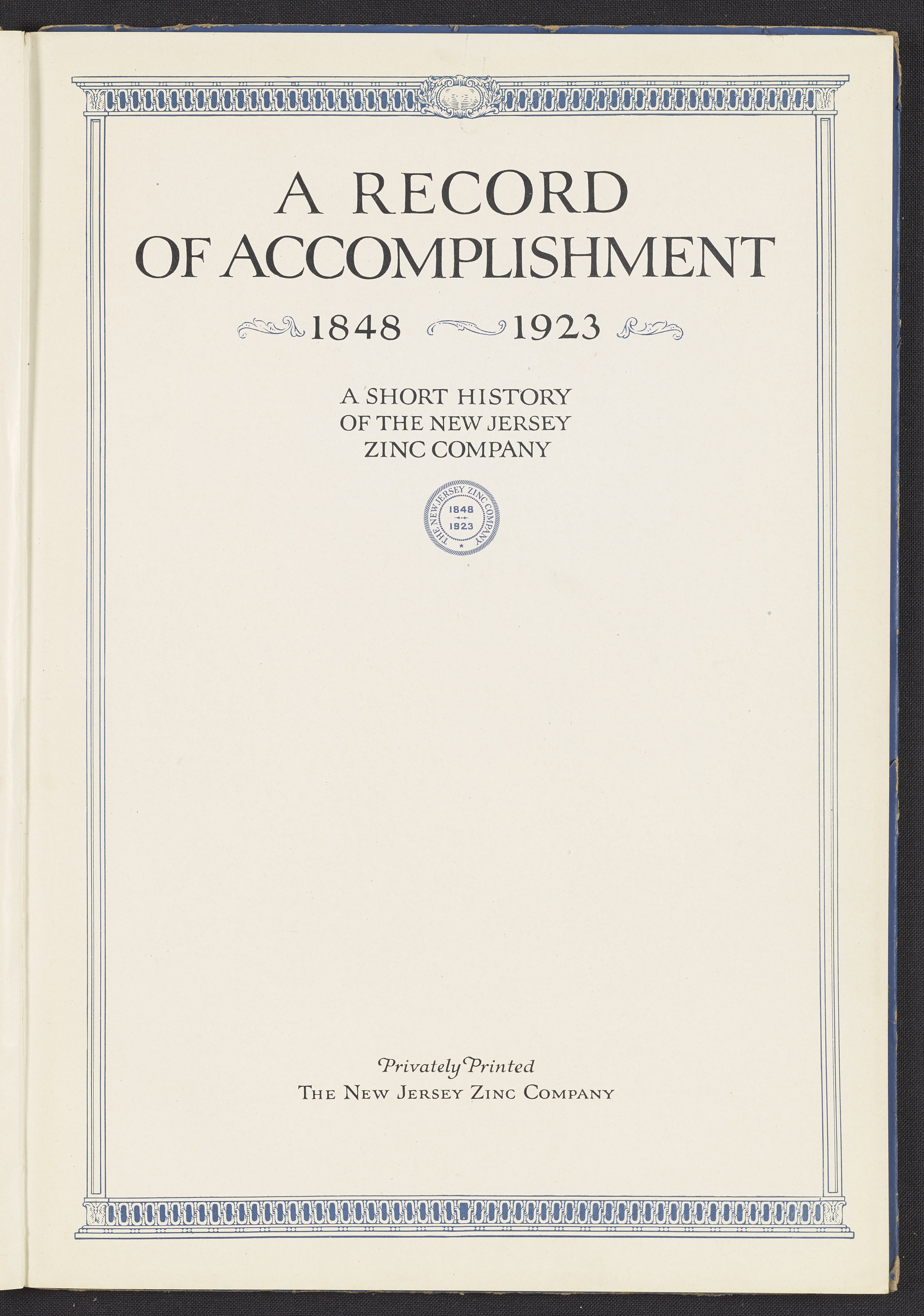 New Jersey Zinc Company. “A Record of Accomplishment, 1848-1923: a Short History of the New Jersey Zinc Company.” New Jersey Zinc Company, circa 1924. TN483.Z6 N43 1924. Science History Institute. Philadelphia. https://digital.sciencehistory.org/works/joj5gje.