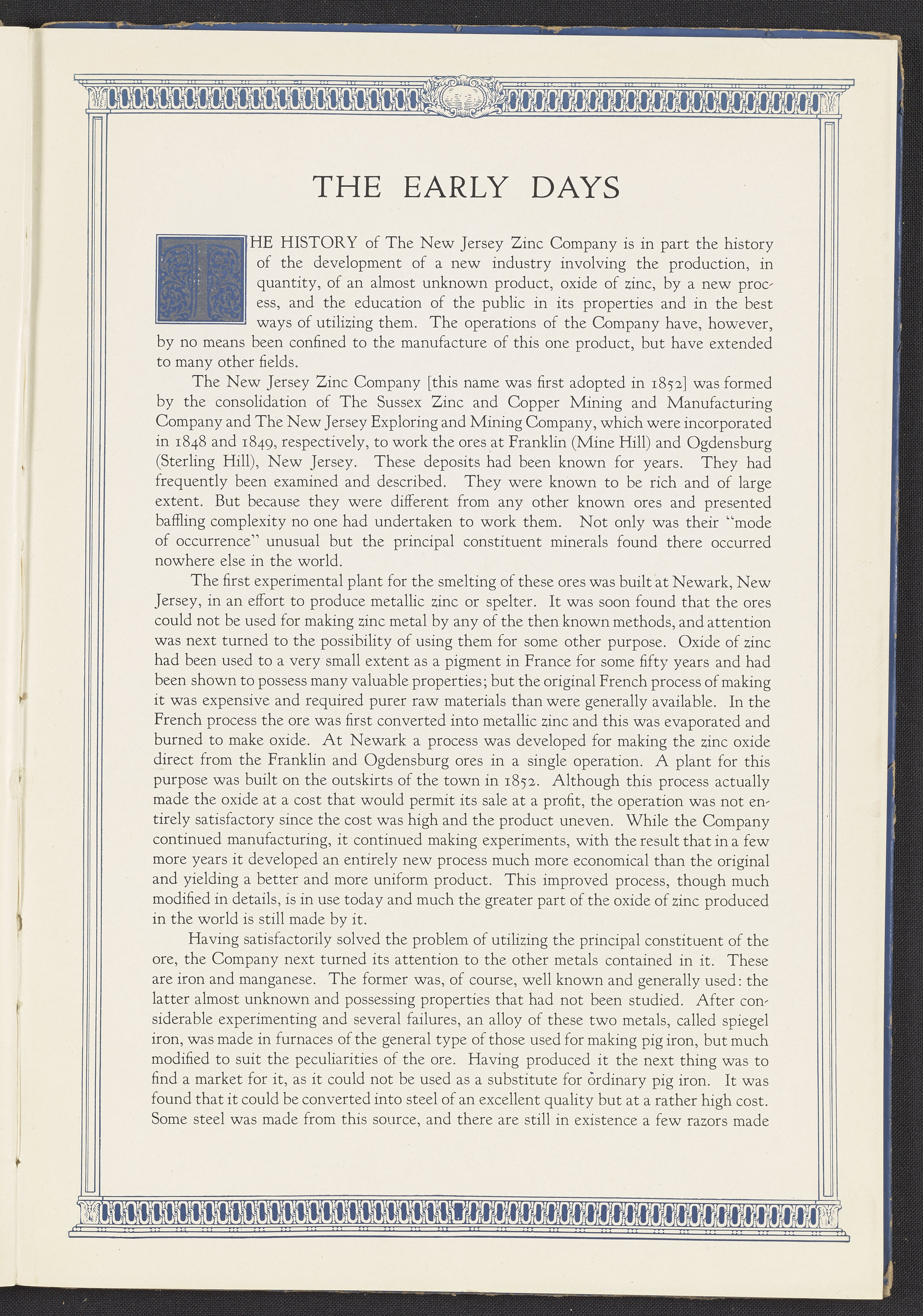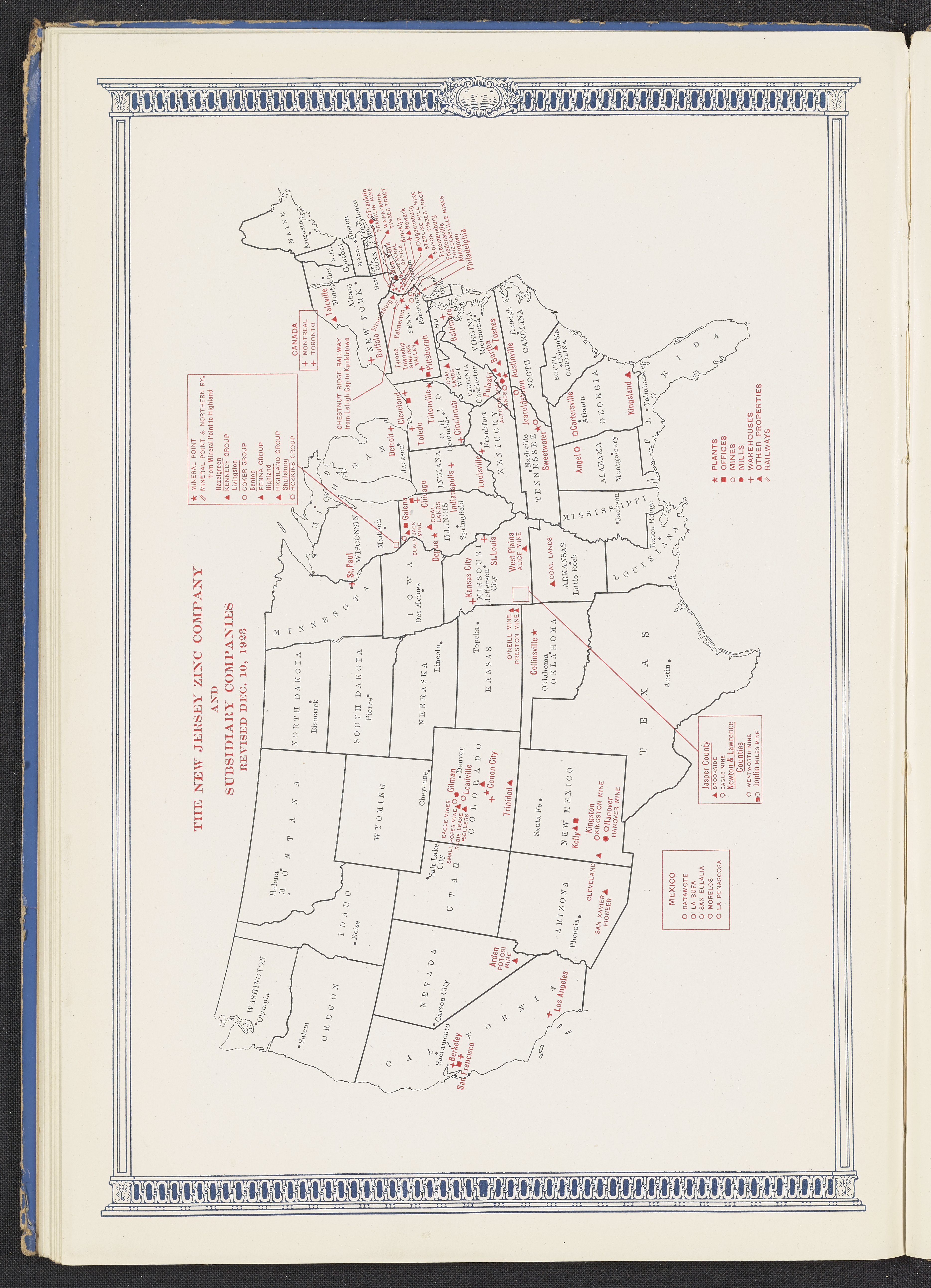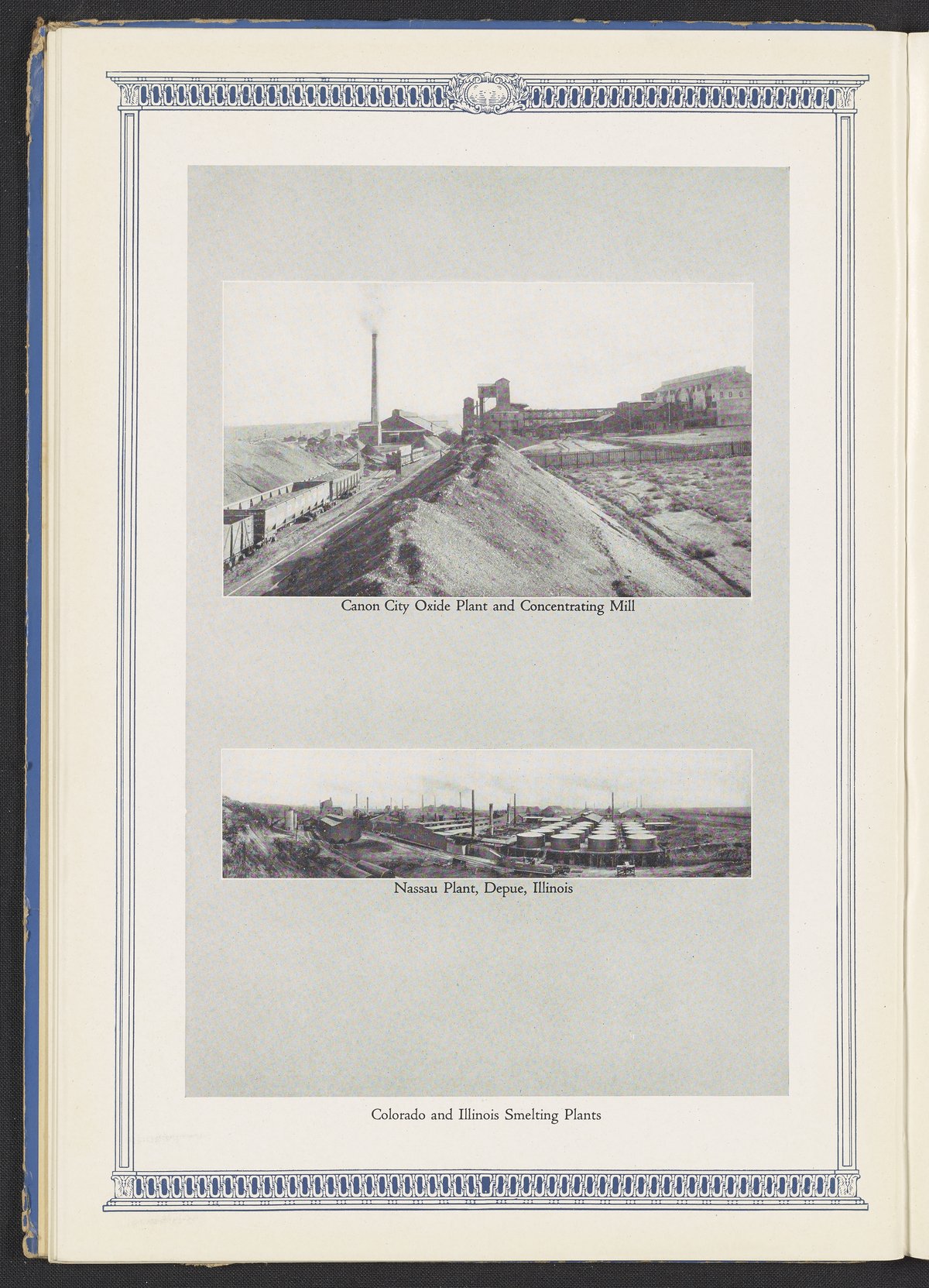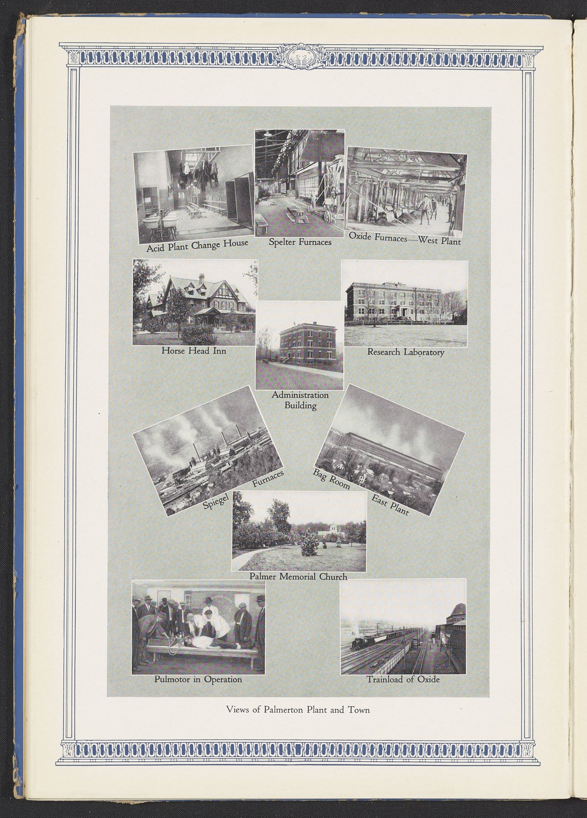 Small JPG1200 x 1652px — 278 KBLarge JPG2880 x 3966px — 1.6 MBFull-sized JPG3740 x 5150px — 2.5 MBOriginal fileTIFF — 3740 x 5150px — 55.2 MBA corporate history of the New Jersey Zinc Company, thoroughly illustrated with black and white photographic prints. The New Jersey Zinc Company (now the Horsehead Holding Corporation), founded in 1848 in Pittsburgh Pennsylvania, was the largest producer of Zinc in the United States from 1897 to 1966. The work is digitized in its entirety.