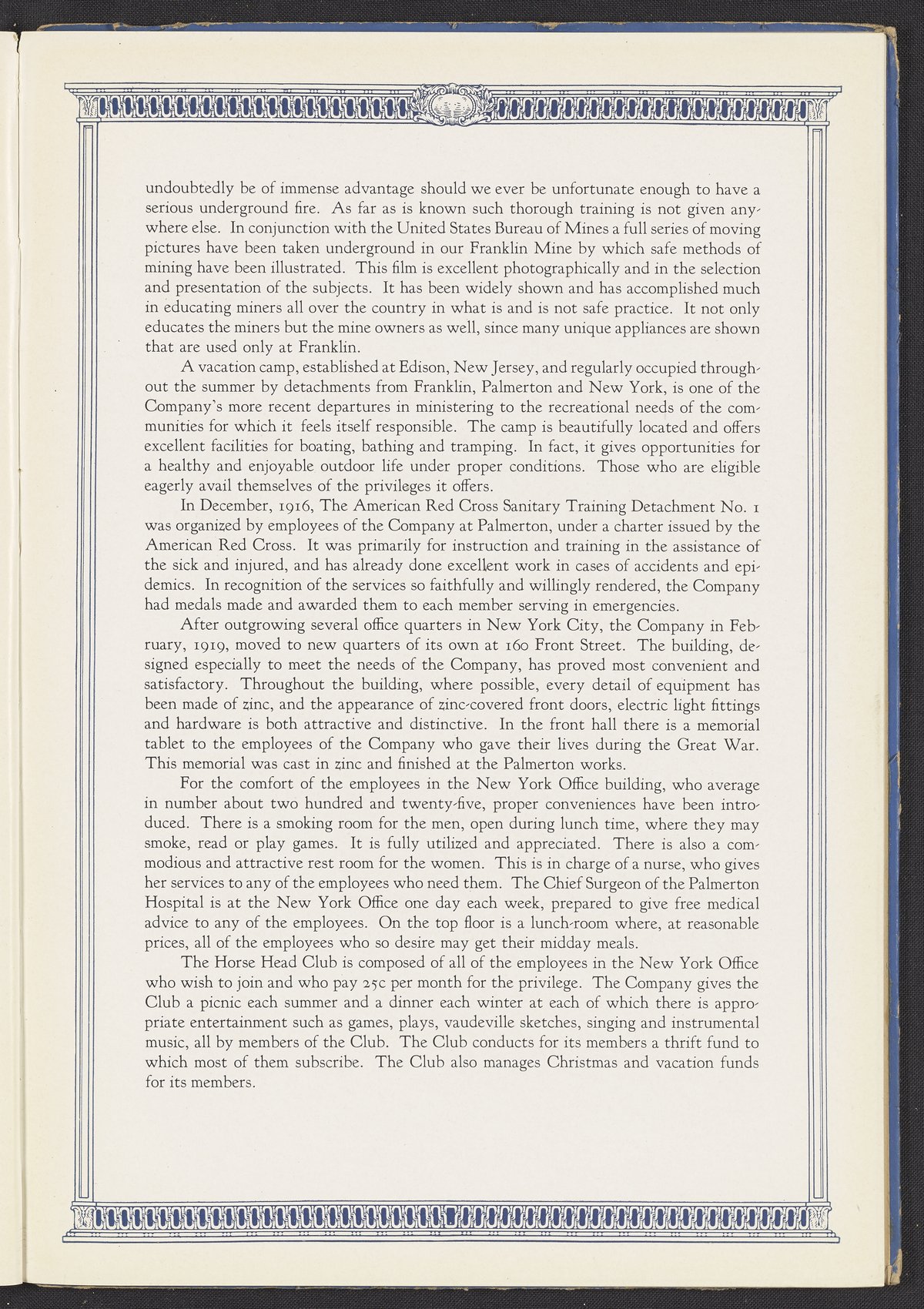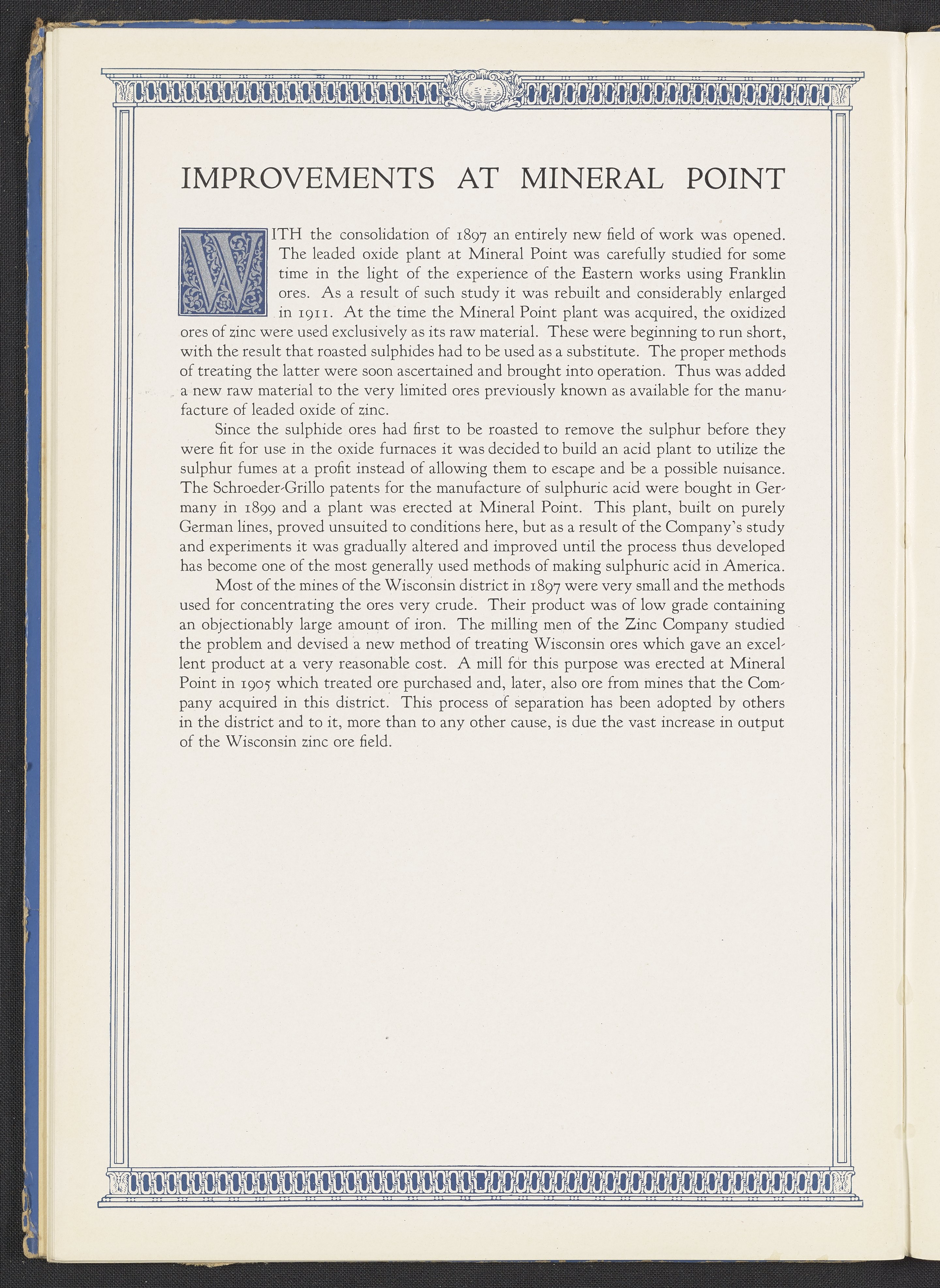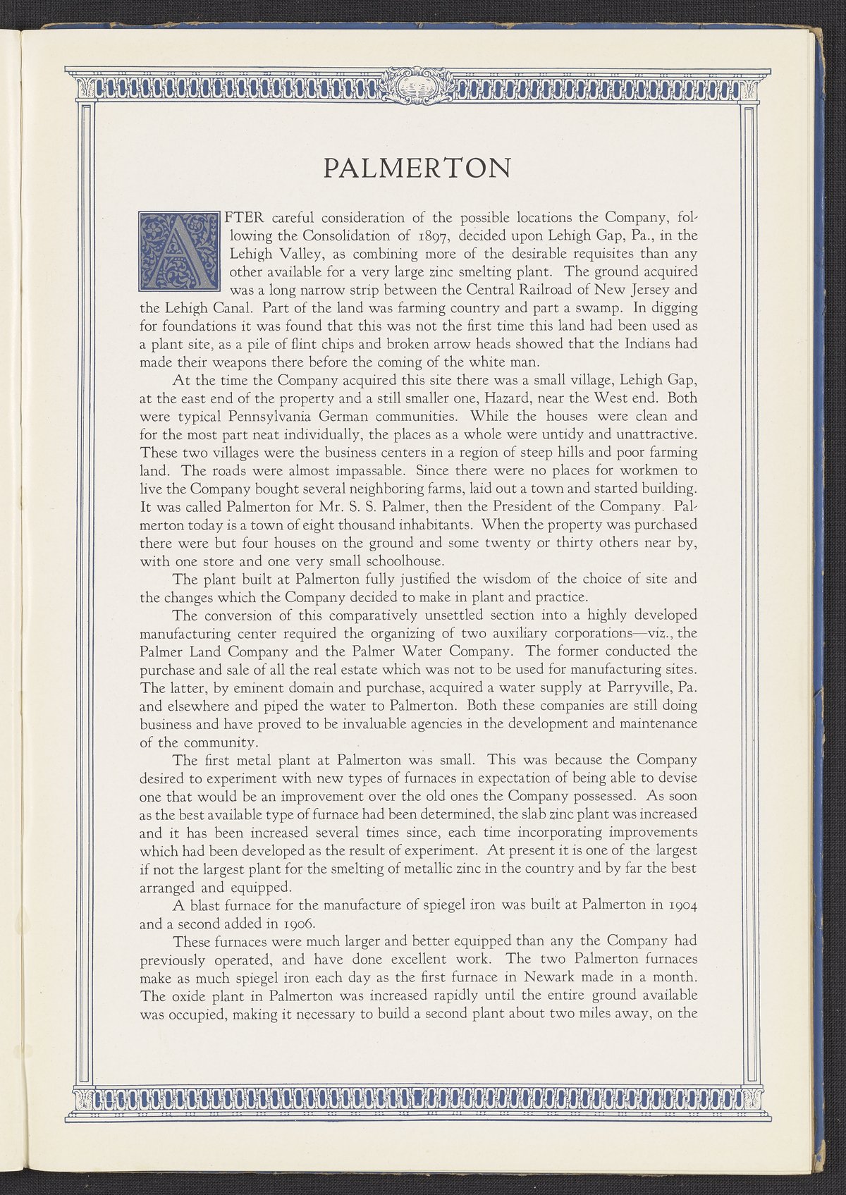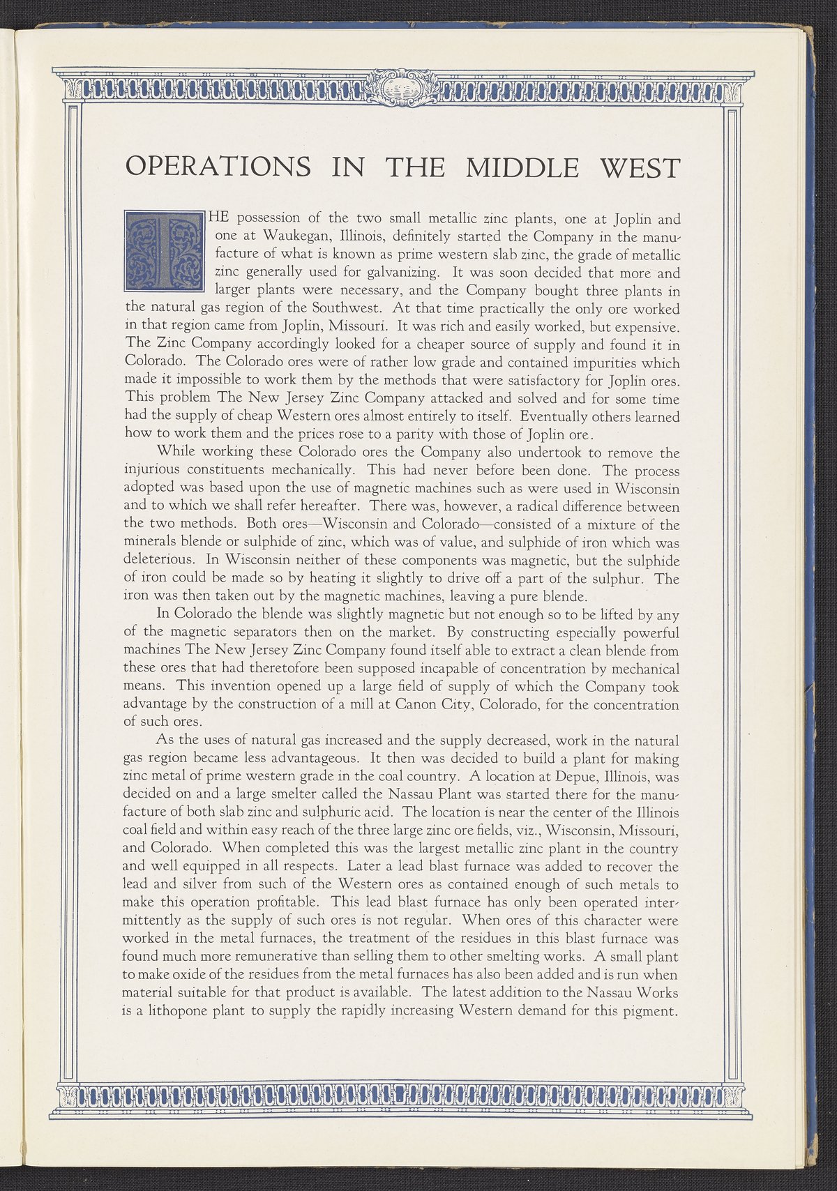 Small JPG1200 x 1652px — 278 KBLarge JPG2880 x 3966px — 1.6 MBFull-sized JPG3740 x 5150px — 2.5 MBOriginal fileTIFF — 3740 x 5150px — 55.2 MBA corporate history of the New Jersey Zinc Company, thoroughly illustrated with black and white photographic prints. The New Jersey Zinc Company (now the Horsehead Holding Corporation), founded in 1848 in Pittsburgh Pennsylvania, was the largest producer of Zinc in the United States from 1897 to 1966. The work is digitized in its entirety.
