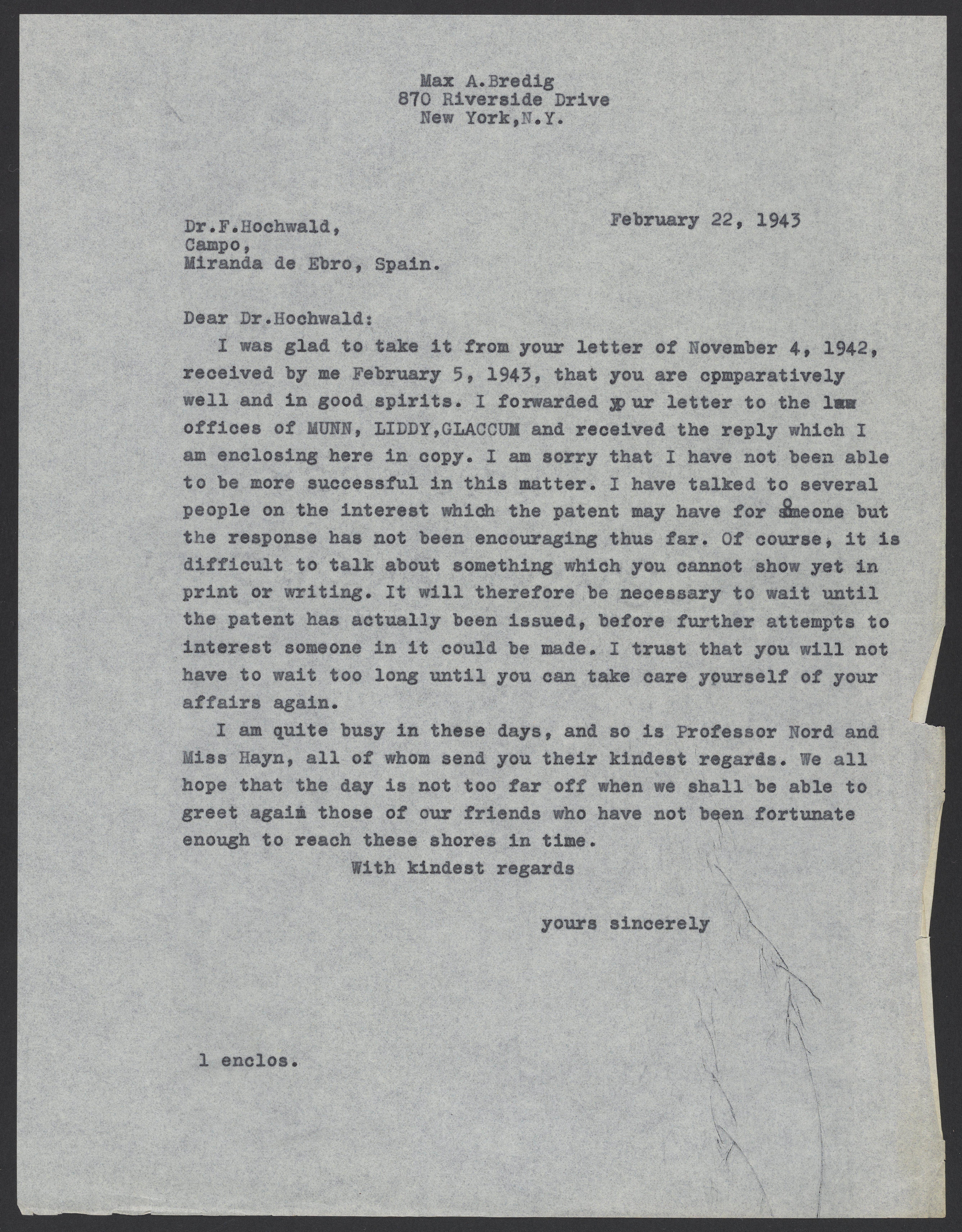 Bredig, Max Albert. “Unsigned Letter from Max Bredig to Fritz Hochwald, February 22, 1943,” February 22, 1943. Papers of Georg and Max Bredig, Box 7, Folder 26. Science History Institute. Philadelphia. https://digital.sciencehistory.org/works/jpfxs1u.