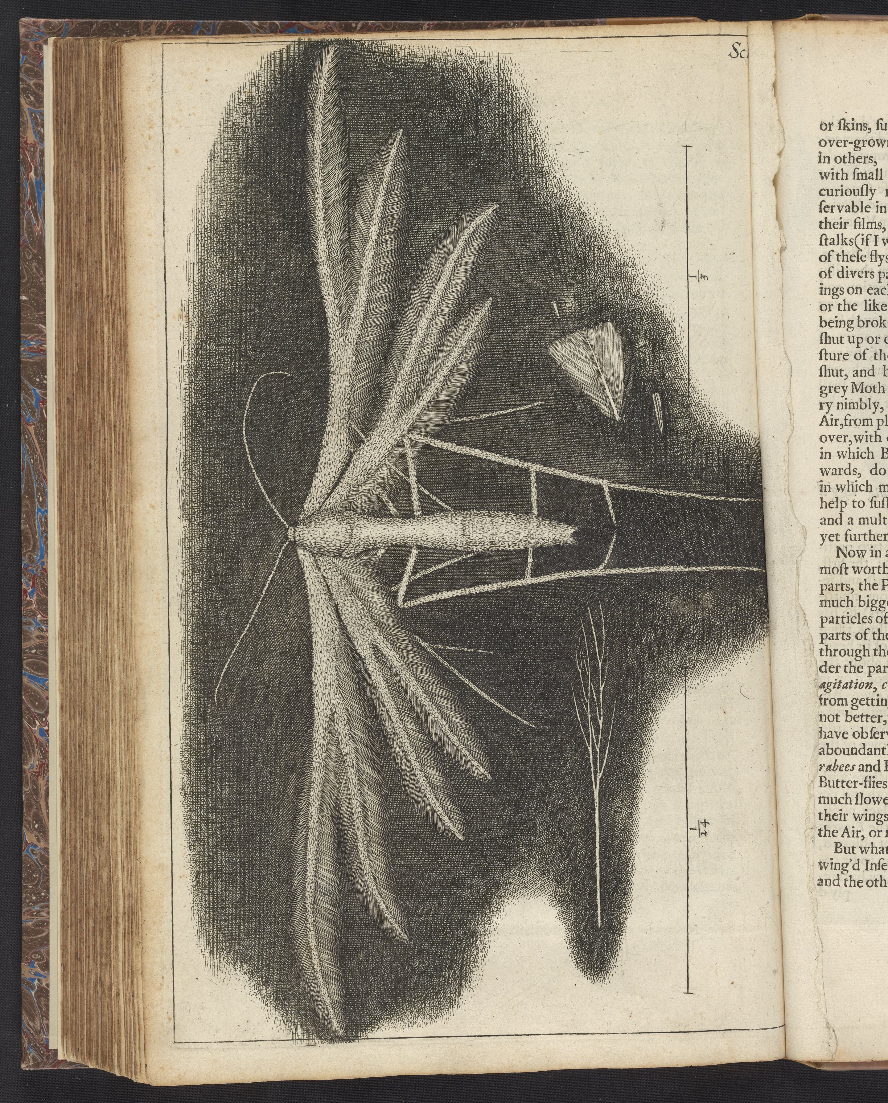 Hooke, Robert. “Microscopic View of a White Featherwing'd [Feather-Winged] Moth.” In Micrographia : or, Some Physiological Descriptions of Minute Bodies Made by Magnifying Glasses. With Observations and Inquiries Thereupon. London, England: J. Allestry, 1665. https://digital.sciencehistory.org/works/jq085m08w.