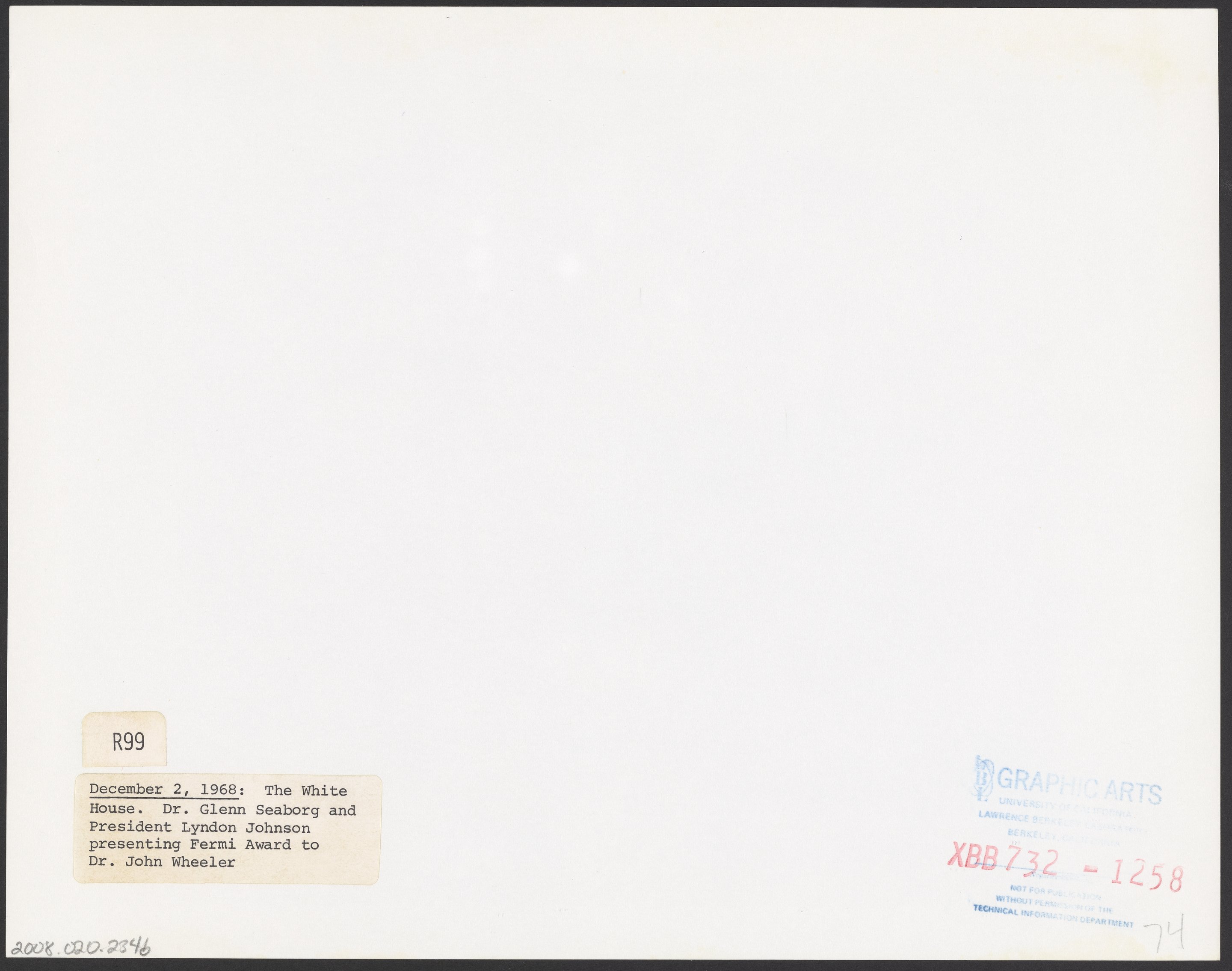 Small JPG1200 x 943px — 164 KBLarge JPG2880 x 2262px — 871 KBFull-sized JPG6847 x 5378px — 4.0 MBOriginal fileTIFF — 6847 x 5378px — 105 MBBlack and white photograph depicting Glenn Seaborg (1912-1999) and President Lyndon B. Johnson (1908-1973) presenting the Fermi Award to Dr. John Wheeler (1911-2008) at the White House. Wheeler was an American theoretical physicist who is known for his work in general relativity, the development of the Breit-Wheeler process, and for coining the term "black hole."