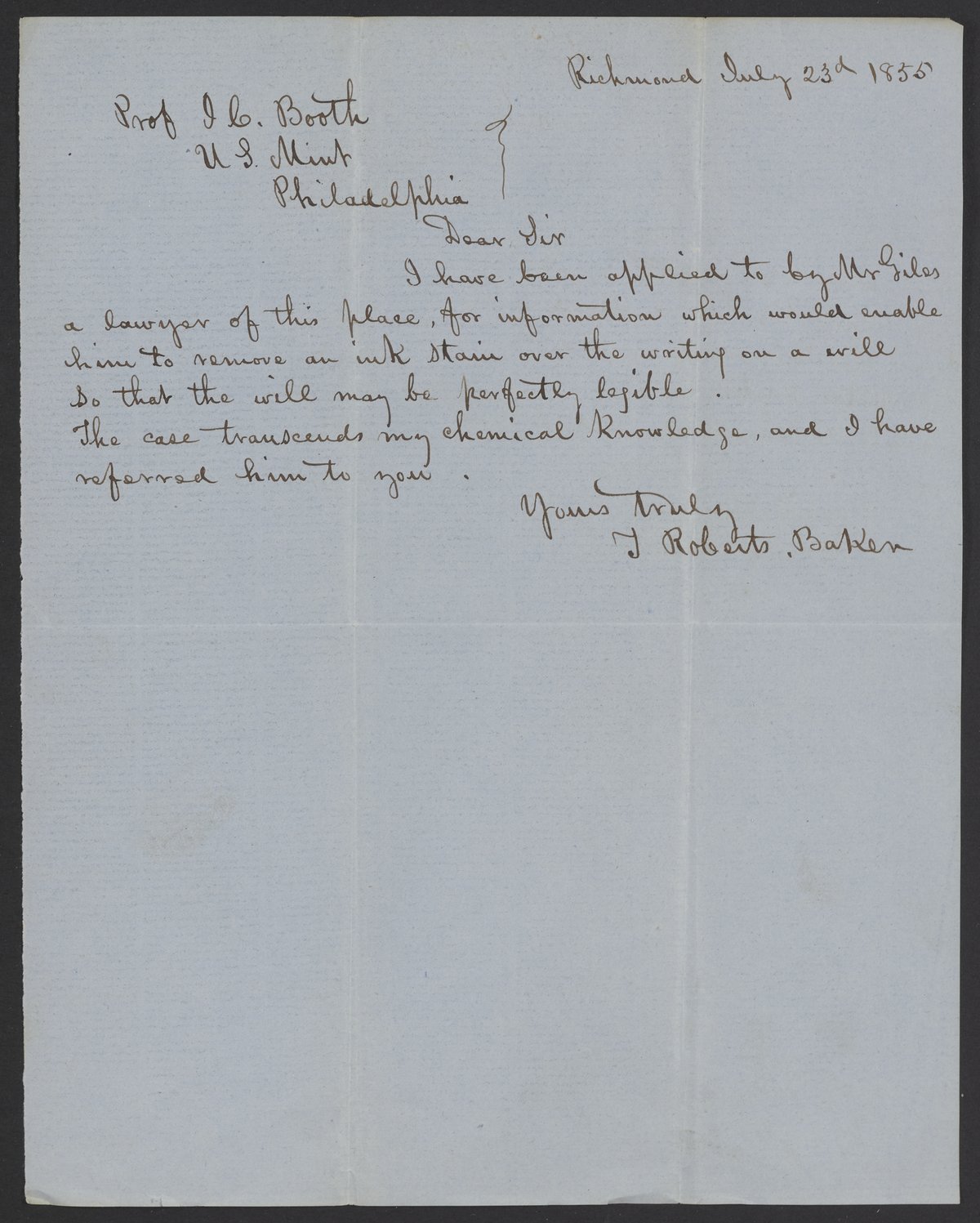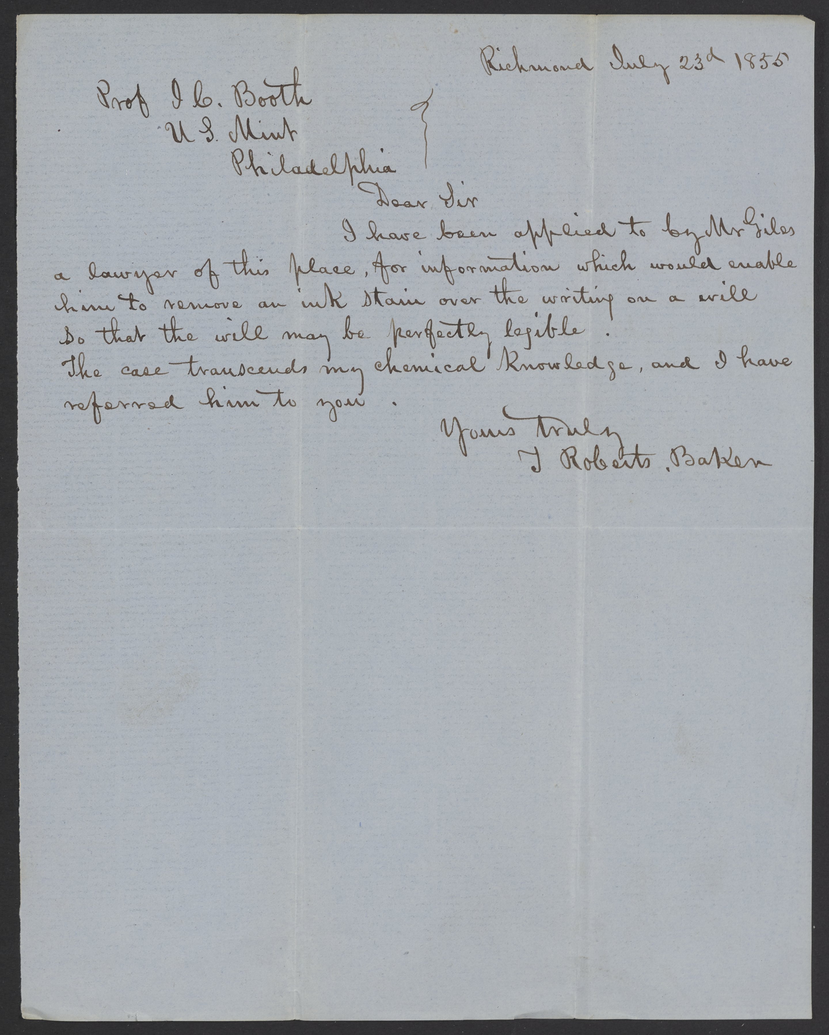 Baker, T. Roberts. “Letter from T. Roberts Baker to James Curtis Booth, July 23, 1855,” July 23, 1855. Papers of James Curtis Booth, Box 1, Folder 7. Science History Institute. Philadelphia. https://digital.sciencehistory.org/works/jrh0aqs.