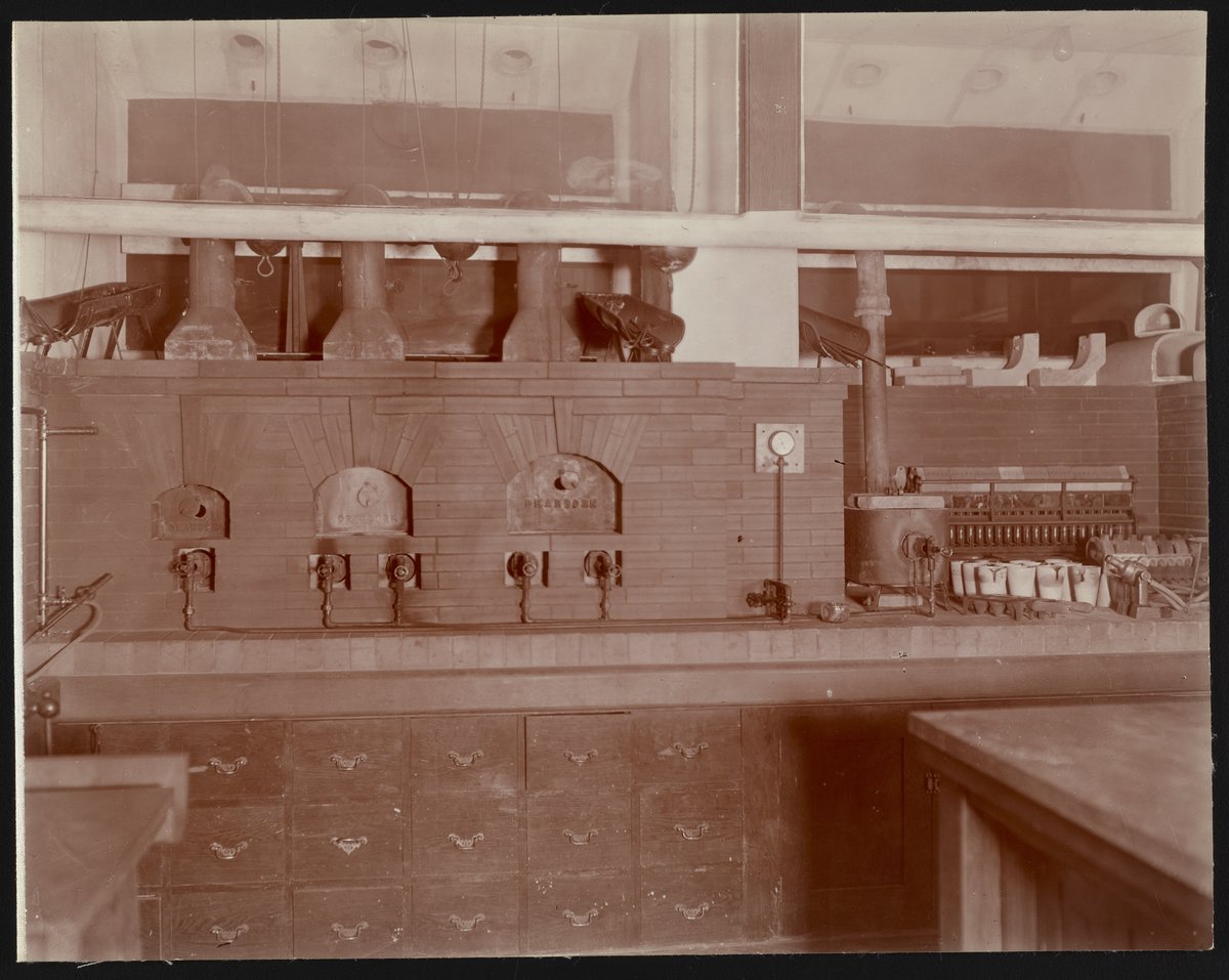 Close-up view of the assay and combustion furnaces in the laboratory back room at the Dearborn Drug and Chemical Works (later Dearborn Chemical Company) 35th Street laboratory facilities located in Chicago, Illinois. Founded in 1887, the Dearborn Chemical Company was a corporate ancestor of BetzDearborn, Incorporated best known for manufacturing water treatment chemicals for use in boilers, cooling towers, and steam locomotives.