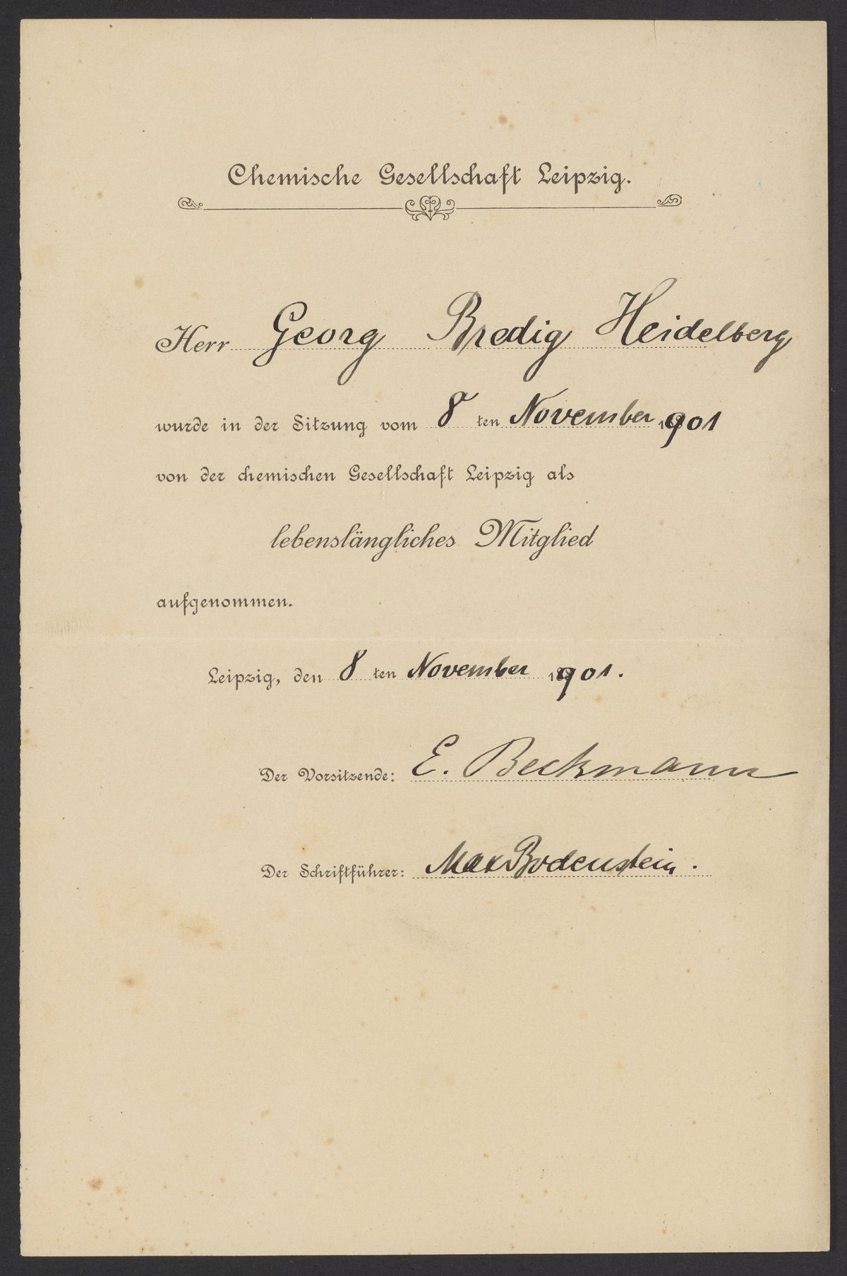 Mr. Georg Bredig of Heidelberg was accepted as a lifelong member of the Leipzig Chemical Society during the meeting on 8 November 1901.