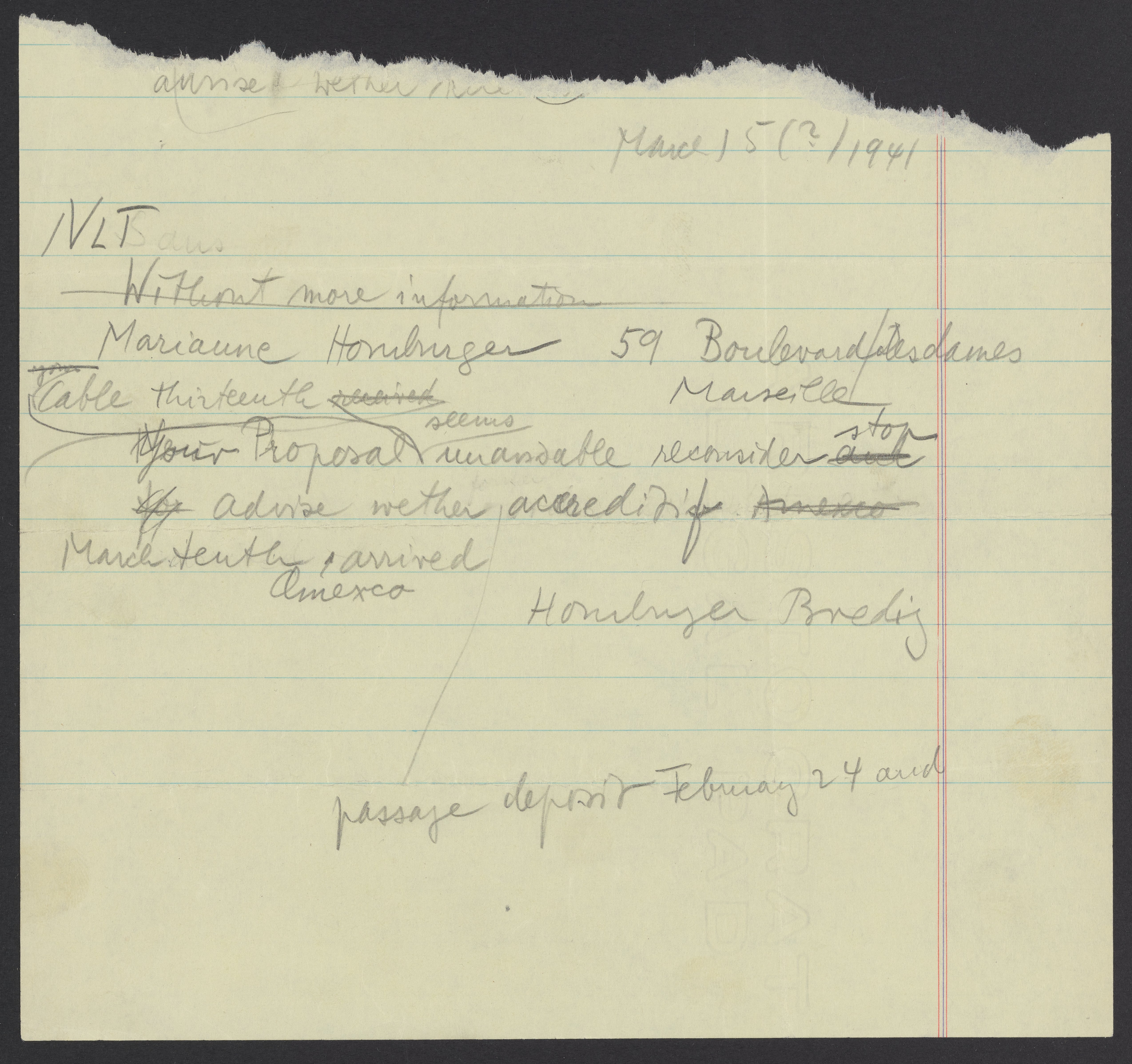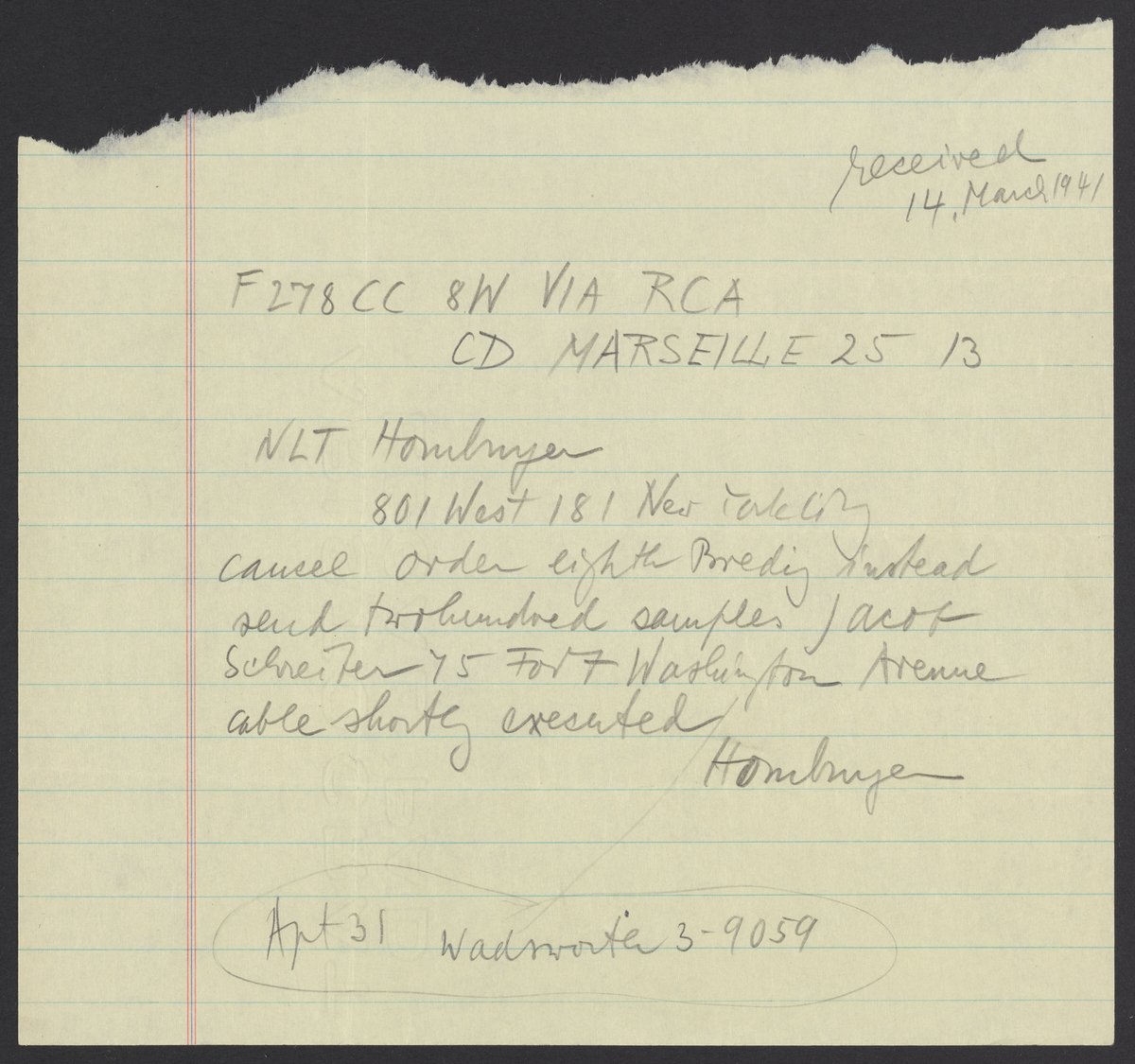 Copy of a telegram from Marianne and Viktor Homburger, March 14, 1941