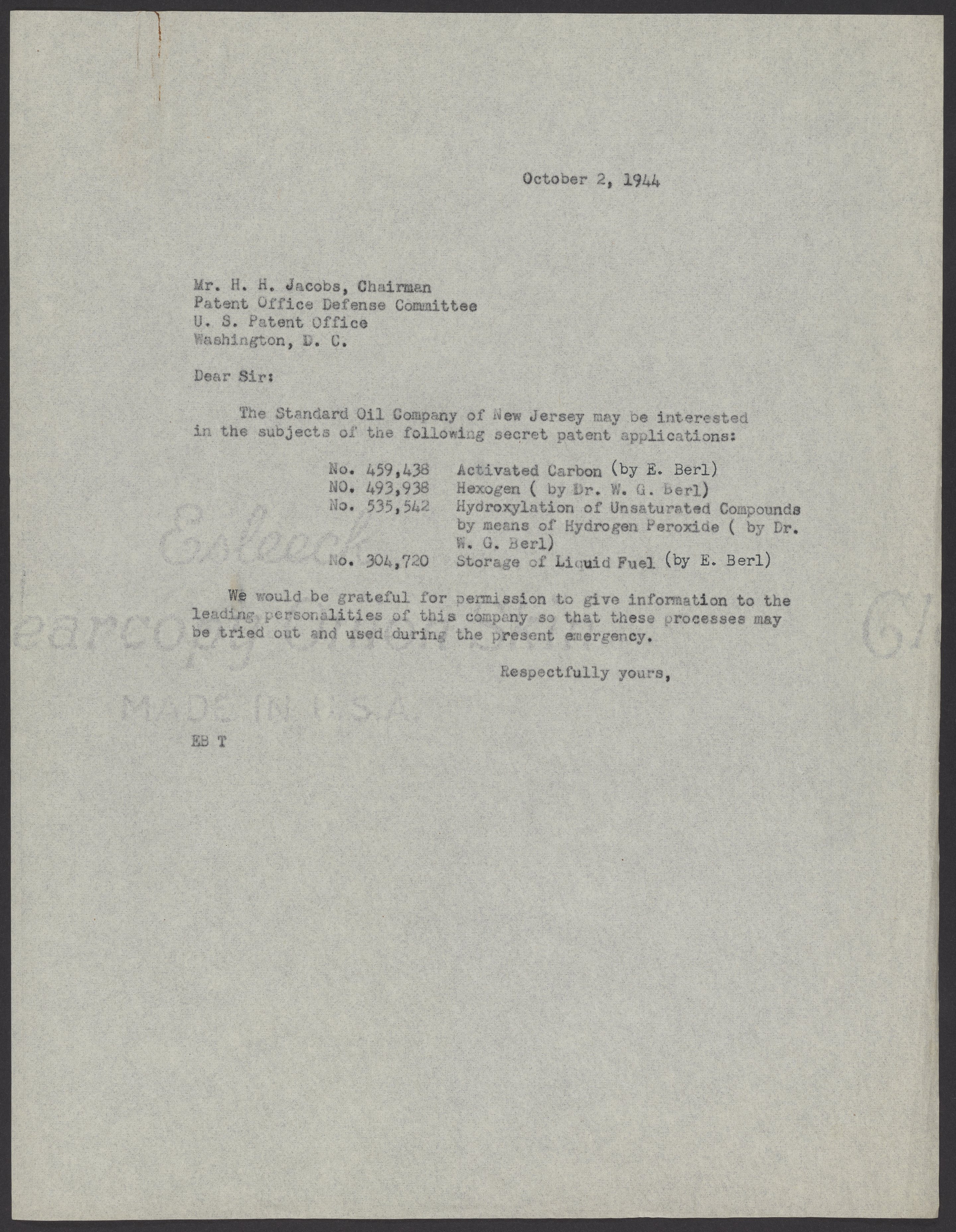 Letter from Ernst Berl to H. H. Jacobs, October 2, 1944