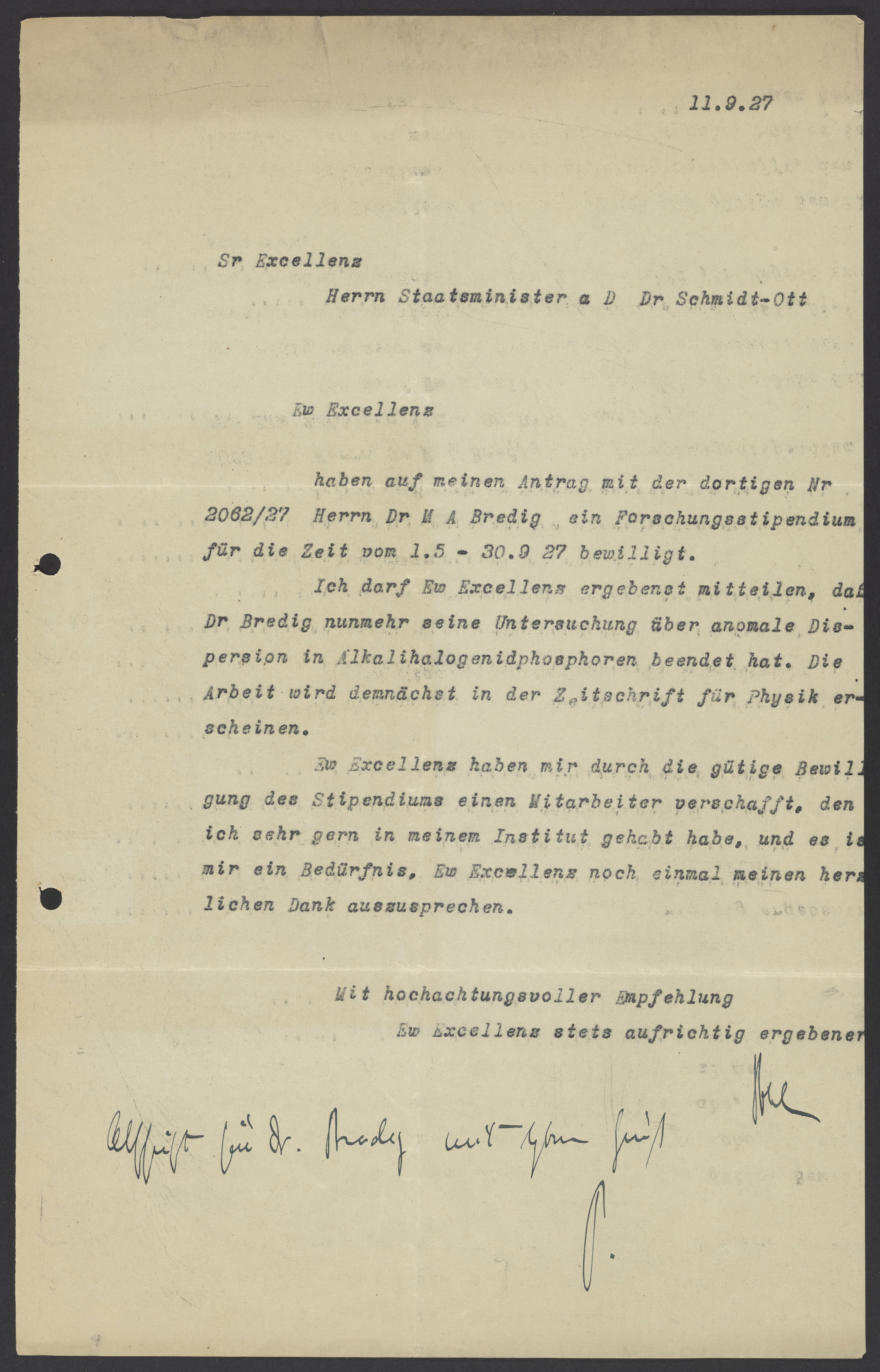 Letter to Dr. Schmidt-Ott from Robert Wichard Pohl, November 11, 1927