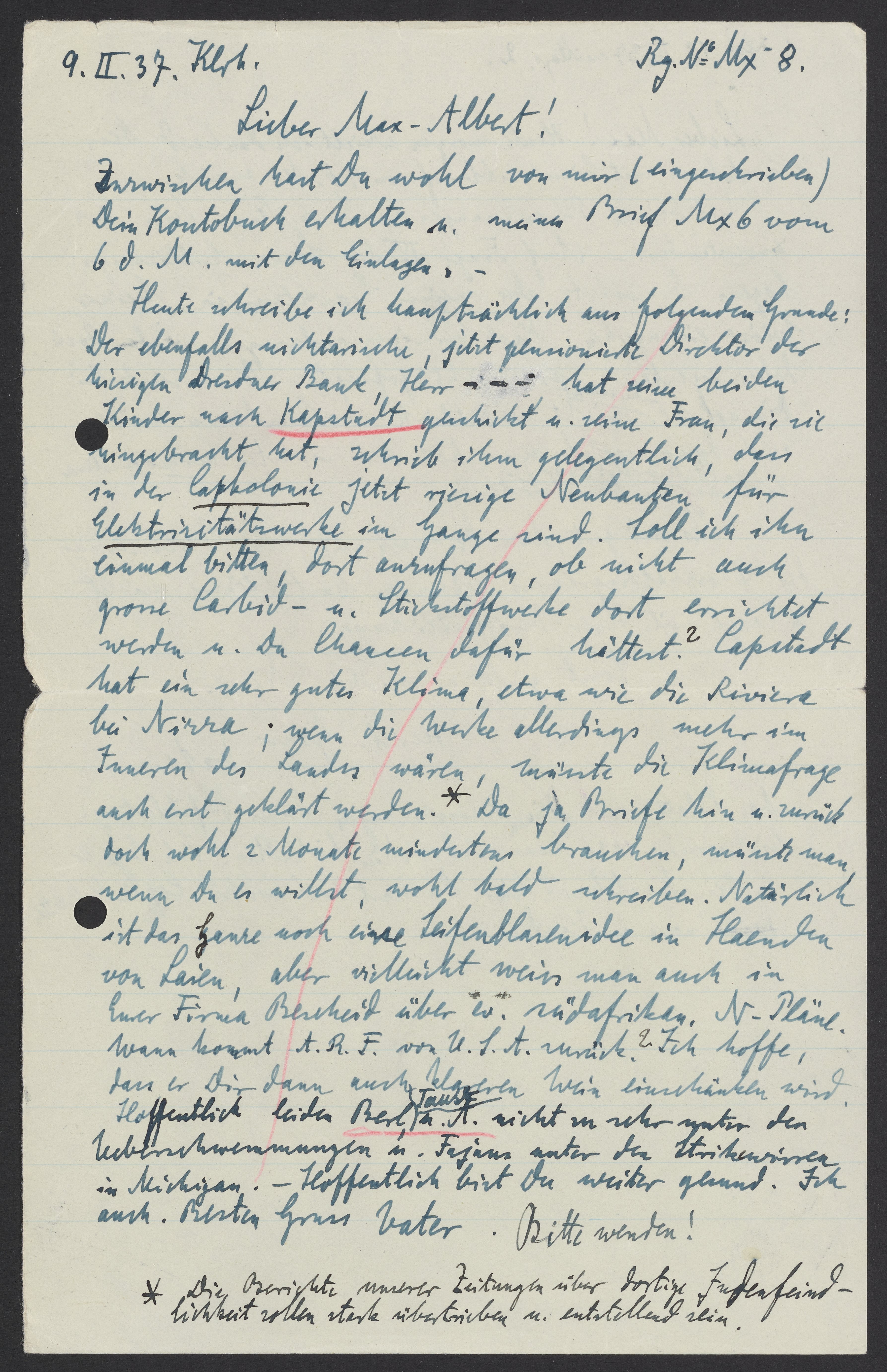 Heute schreibe ich hauptsächlich aus folgendem Grunde: Der ebenfalls nichtarische, jetzt plunionische Direktor der hiesigen Dresdner Bank, Herr ---, hat seine beiden Kinder nach Kapstadt geschickt u. seine Frau, die sie hingebracht hat, schrieb ihm gelegentlich, dass in den Capkolonie jetzt riesige Neubauten für Elektrizitätswerke im Gange sind. Soll ich ihn einmal bitten, dort anzufragen, ob nicht auch grosse Cardbid – u. Stickstoffwerke dort errichtet werden u. Du Chance dafür hättest? Capstadt hat ein sehr gutes Klima, etwa wie die Riviera bei Nirra; wenn die Werke allerdings mehr im Inneren des Landes wären, müsste die Klimafrage auch erst geklärt werden.* Da ja Briefe hin u. zurück doch wohl 2 Monate brauchen, müsste man, wenn Du willst, wohl bald schreiben. Natürlich ist das Ganze noch eine Seifenblase in Händen von Laien, aber vielleicht muss man auch in Eurer Firma Bescheid über eu. Südafrika N-Pläne. Wann kommt A.R.F von U.S.A zurück? Ich hoffe, dass er Dir dann auch klareren Wein einschenken wird. Hoffentlich leiden Berl u. Tausz u.A. nicht zu sehr unter den Überschwemmungen u. Fajans unter Strikewirren in Michigan. – Hoffentlich bist du weiter gesund. Ich auch. Besten Gruss Vater. Bitte wenden!