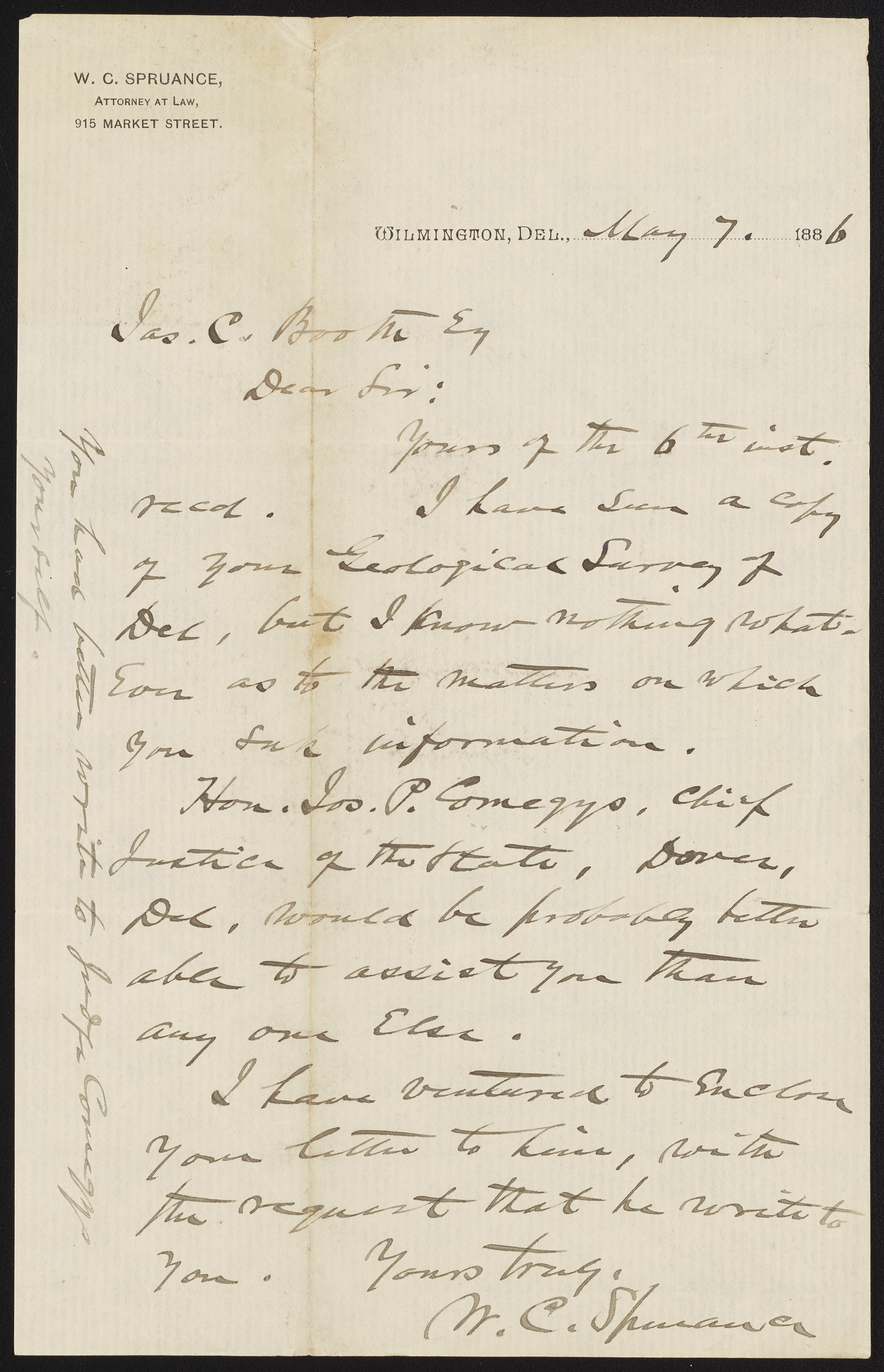 Small JPG1200 x 1863px — 306 KBLarge JPG2880 x 4471px — 1.7 MBFull-sized JPG3726 x 5784px — 2.7 MBOriginal fileTIFF — 3726 x 5784px — 61.7 MBWilliam C. Spruance (1831-1913) Attorney at Law, suggests James Curtis Booth (1810-1888) write to Joseph P. Comegys (1813-1893) for geological information.