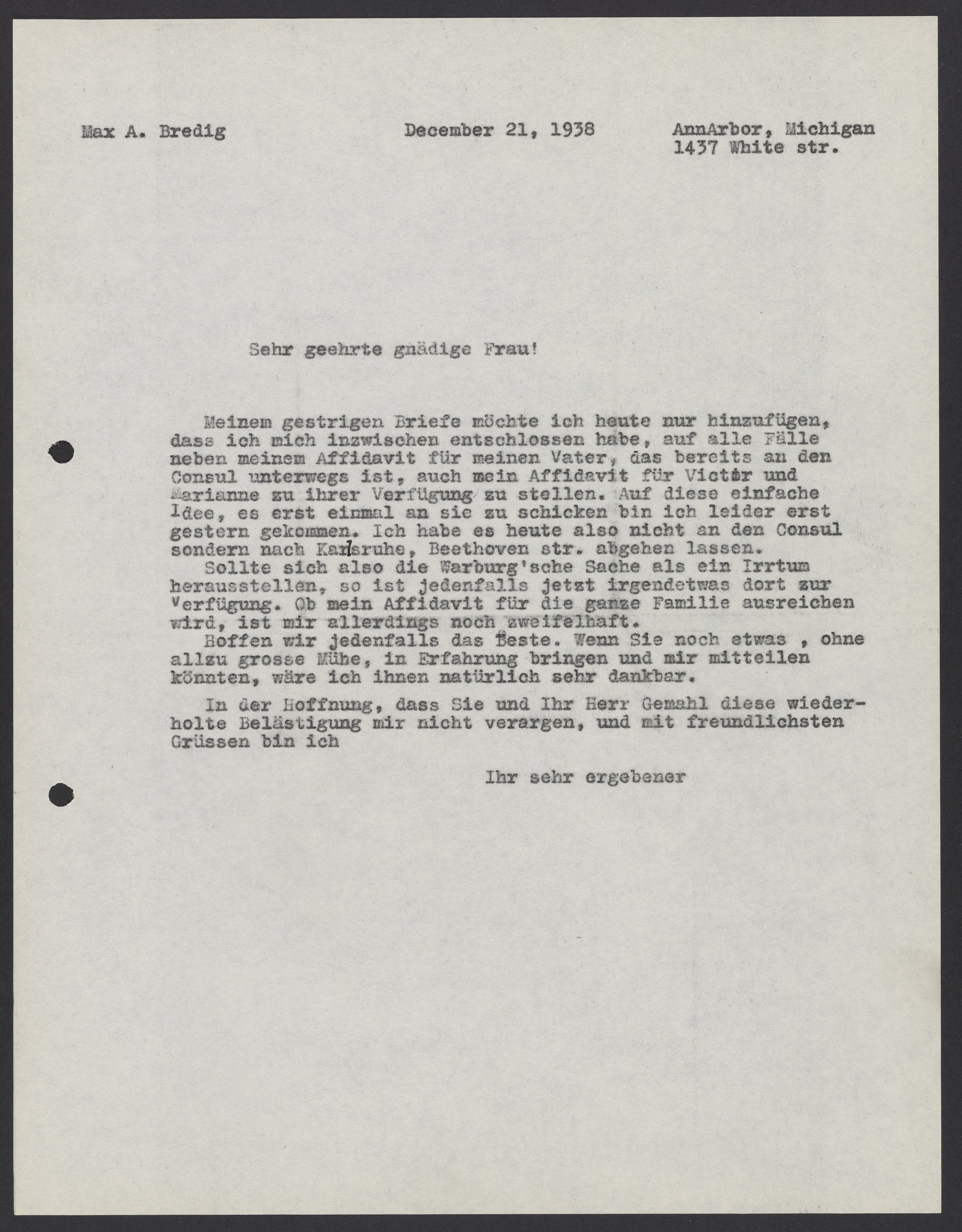Letter from Max Bredig to Fridel G. Halstead, December 21, 1938