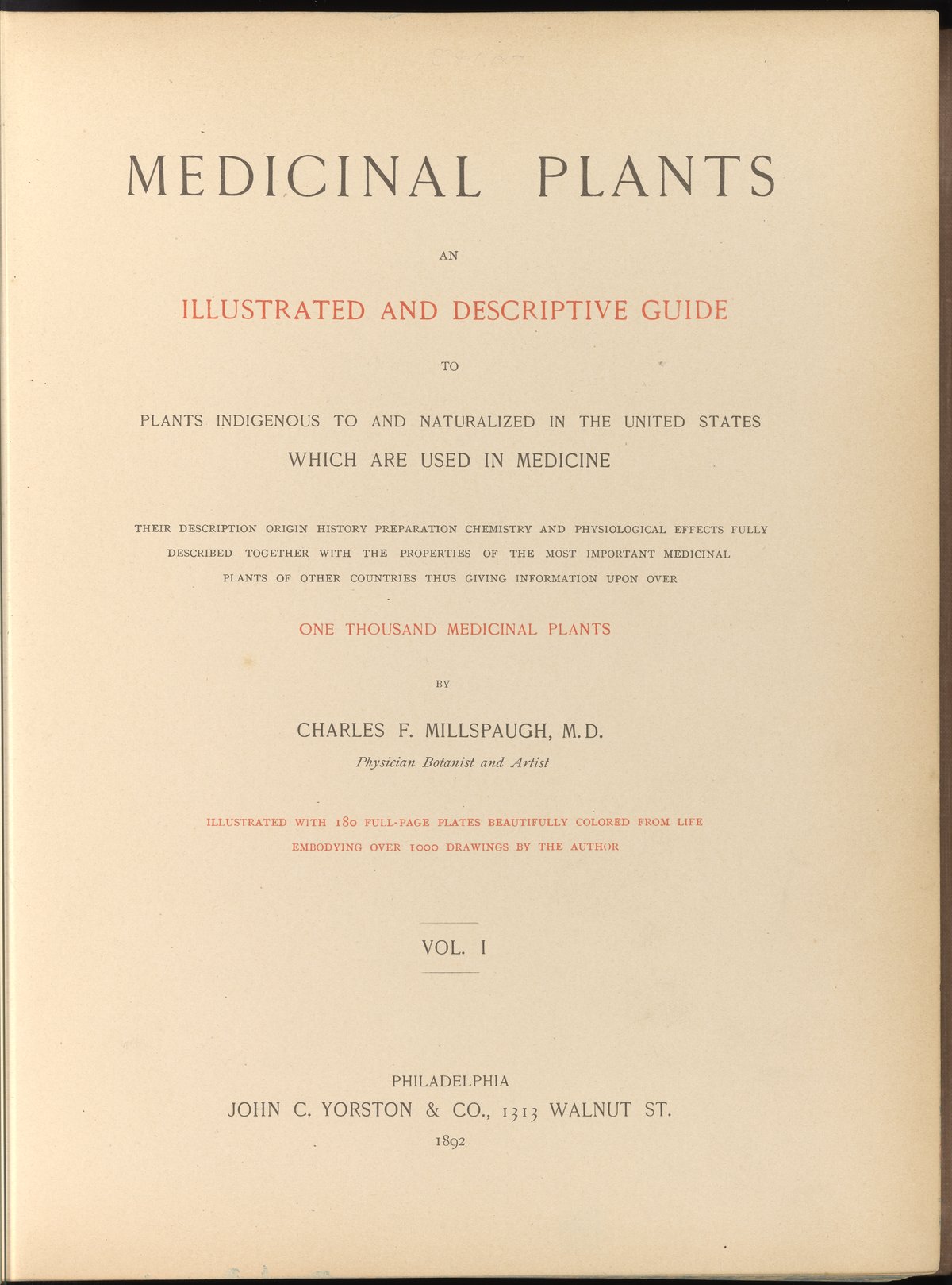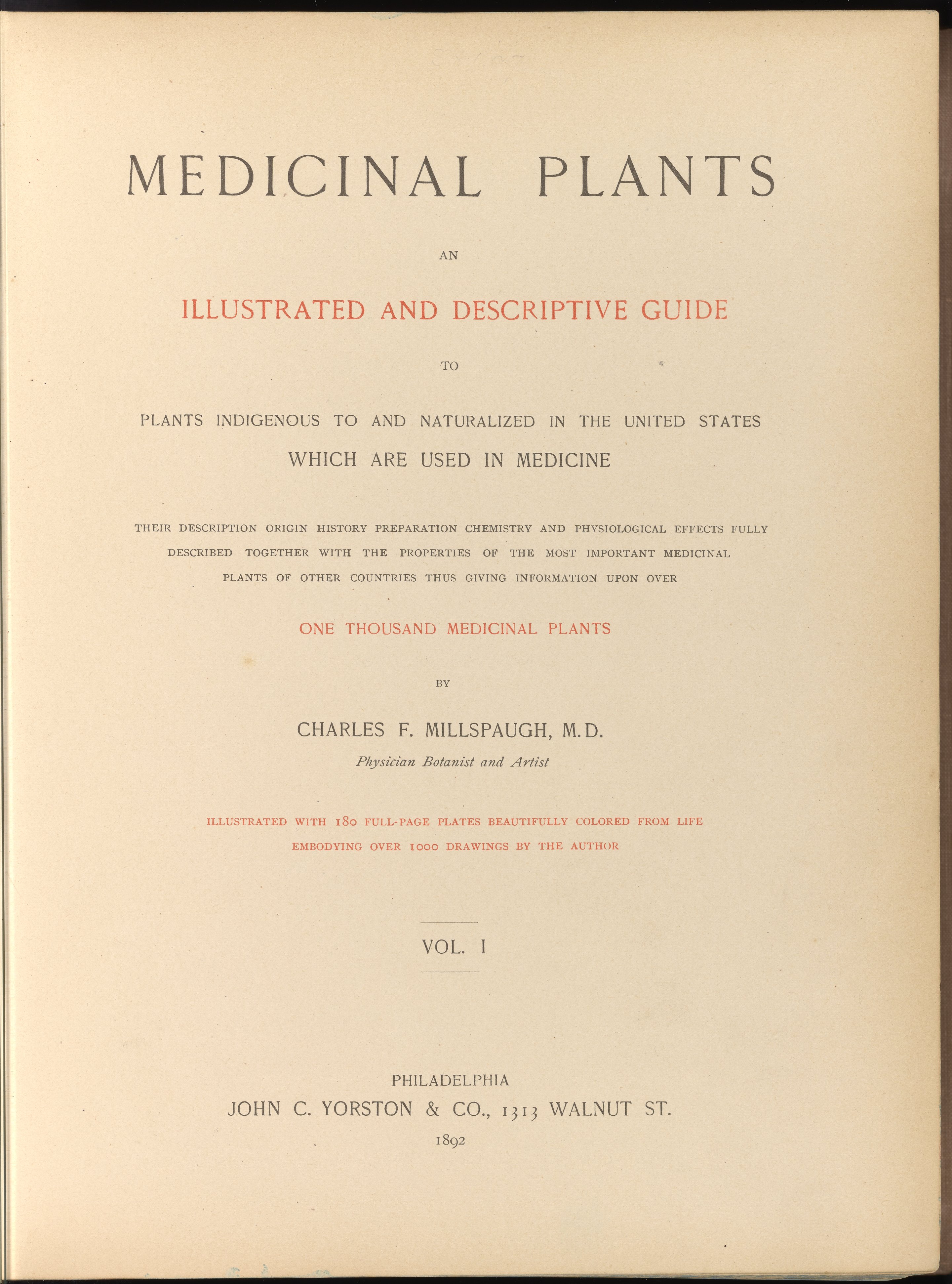 Millspaugh, Charles Frederick. Medicinal Plants: An Illustrated and Descriptive Guide to Plants Indigenous to and Naturalized in the United States, Volume I. Philadelphia, Pennsylvania: John C. Yorston & Co., 1892. https://digital.sciencehistory.org/works/k1682dm.