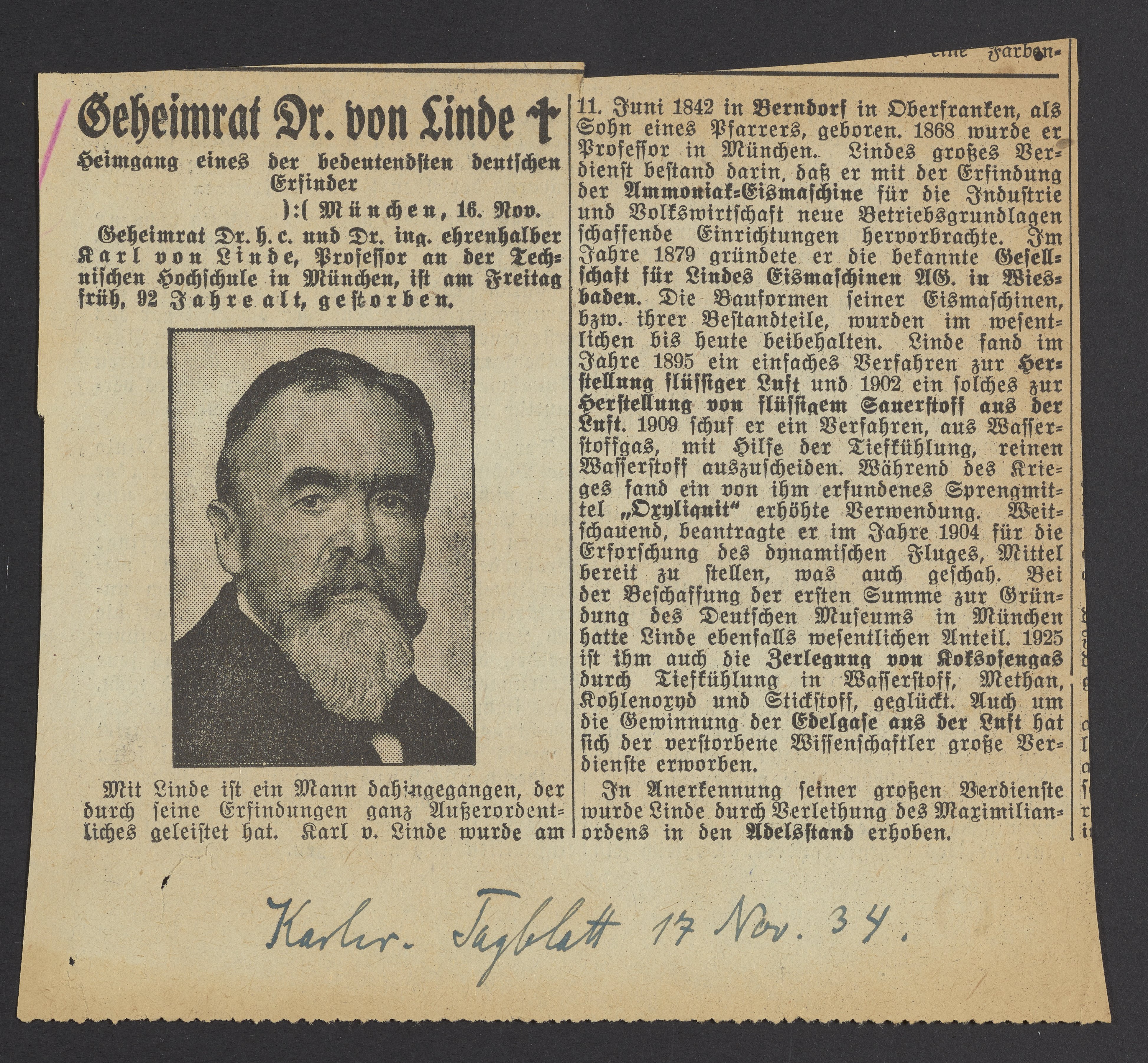 “Obituary for Carl Von Linde,” November 17, 1934. Papers of Georg and Max Bredig, Box 4, Folder 13. Science History Institute. Philadelphia. https://digital.sciencehistory.org/works/k1f4osu.