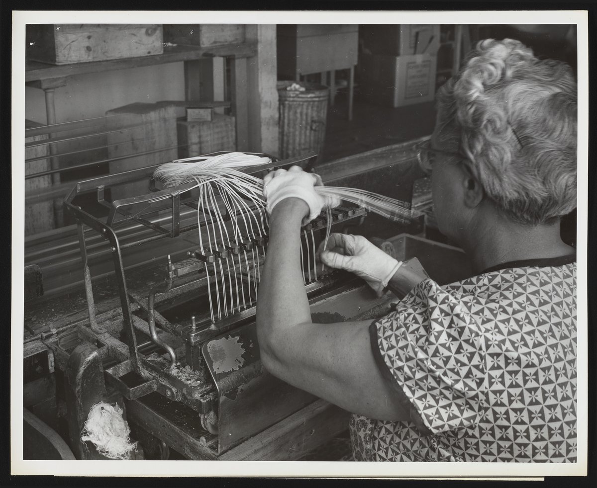 General view of employee Jane Kaminski inserting plugs and bridge wires into the shells of electric blasting caps manufactured at the Hercules Powder Company plant in Port Ewen, New York. Formed in 1912 as part of an anti-trust settlement with DuPont, the Hercules Powder Company (later Hercules Inc.) specialized in the manufacture of explosives and smokeless powders. The company's Port Ewen plant produced a range of special detonators designed for military use, as well as construction jobs that required blasts of dynamite, such as the clearing of quarries, mines, and tunnels.