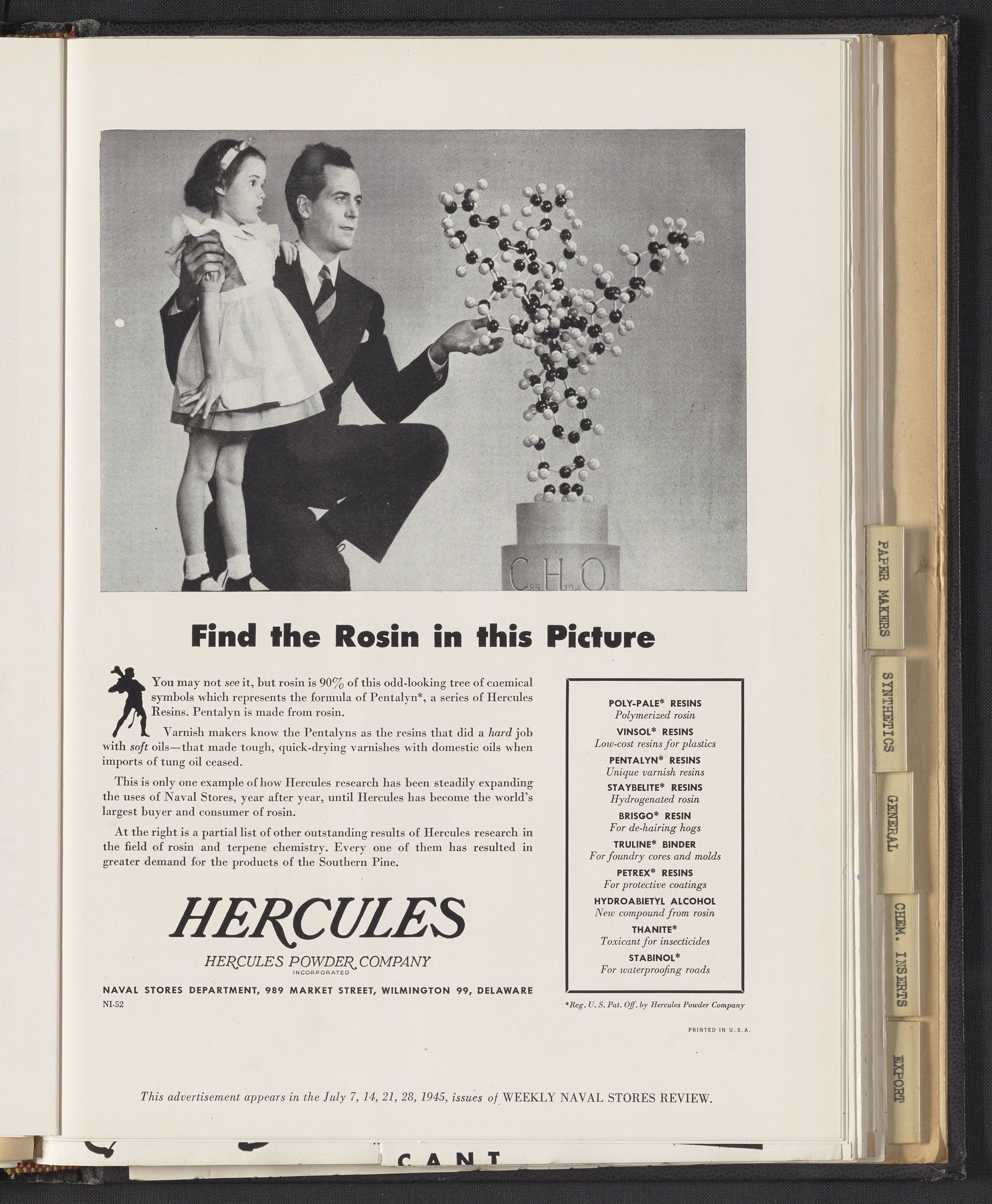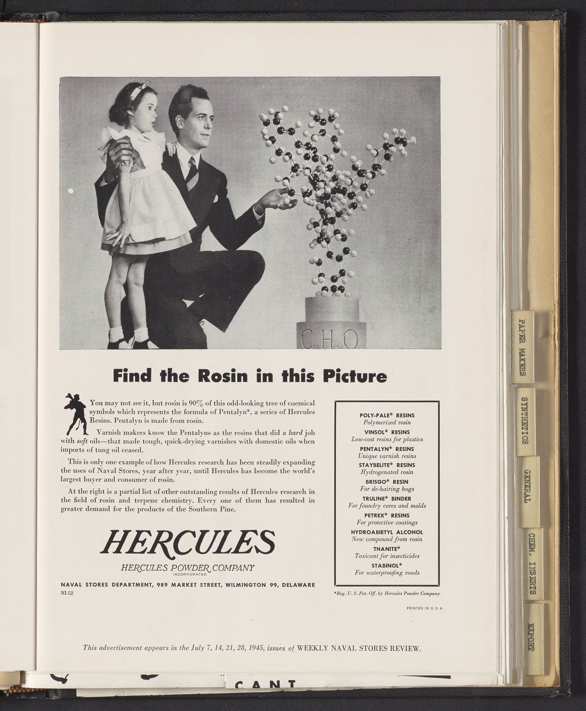 Hercules Incorporated. “Find the Rosin in This Picture.” 1945 Hercules Advertisements, 1945. Records of Hercules Incorporated, Volume 1945. Science History Institute. Philadelphia. https://digital.sciencehistory.org/works/k35695053.