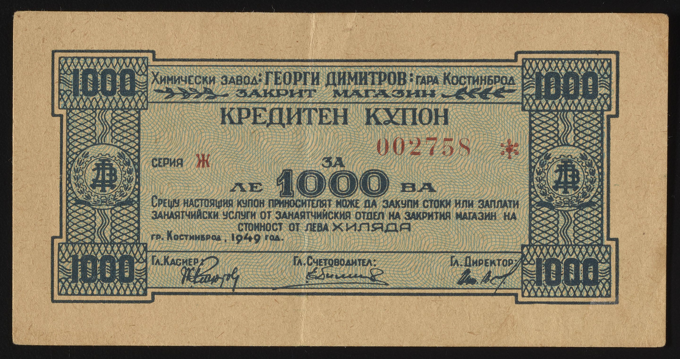 Small JPG1200 x 635px — 234 KBLarge JPG2880 x 1524px — 1.1 MBFull-sized JPG3262 x 1726px — 1.4 MBOriginal fileTIFF — 3262 x 1726px — 16.2 MBIn the amount of one thousand, this company scrip issued by Georgi Dimitrov Chemical Company is printed to look like a banknote. Verso of scrip has an illustration of the chemical complex, which is bustling with workers. Georgi Dimitrov Chemical Company, founded in the 1920s, was the first chemical company in Bulgaria.