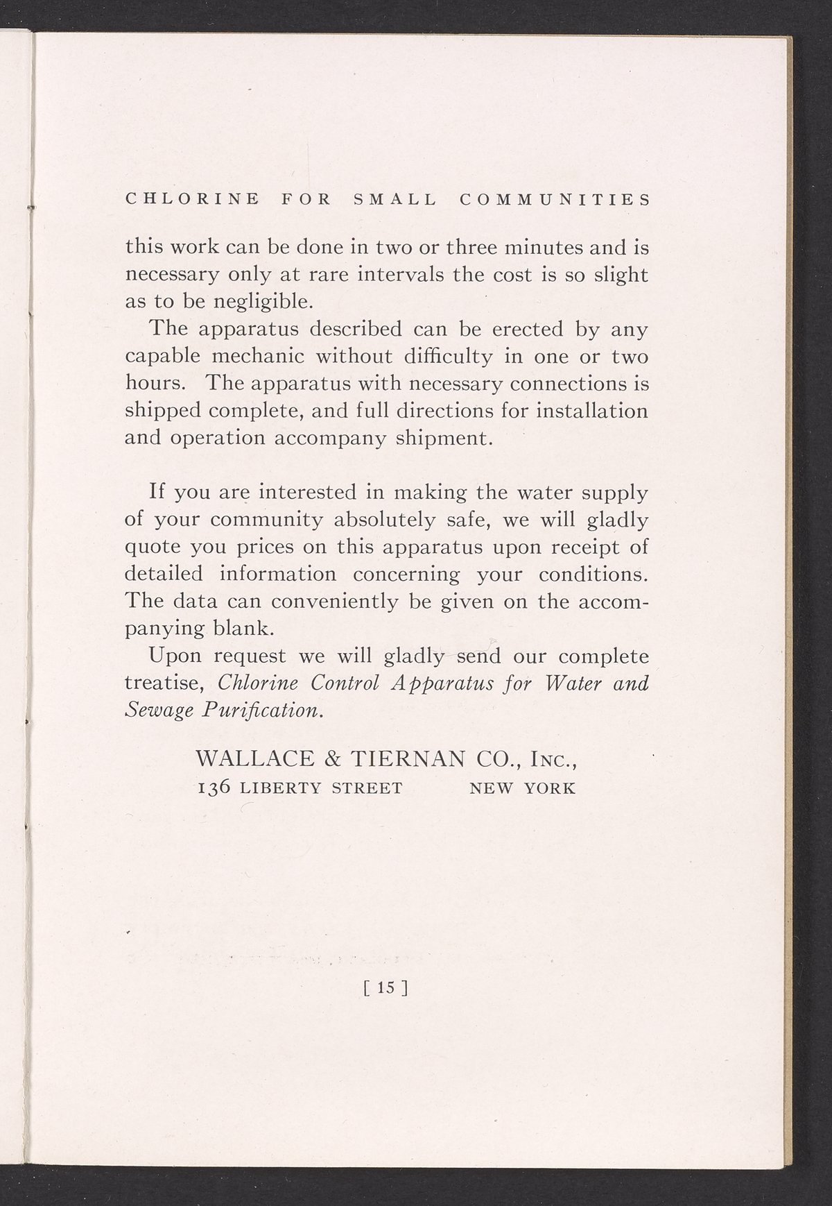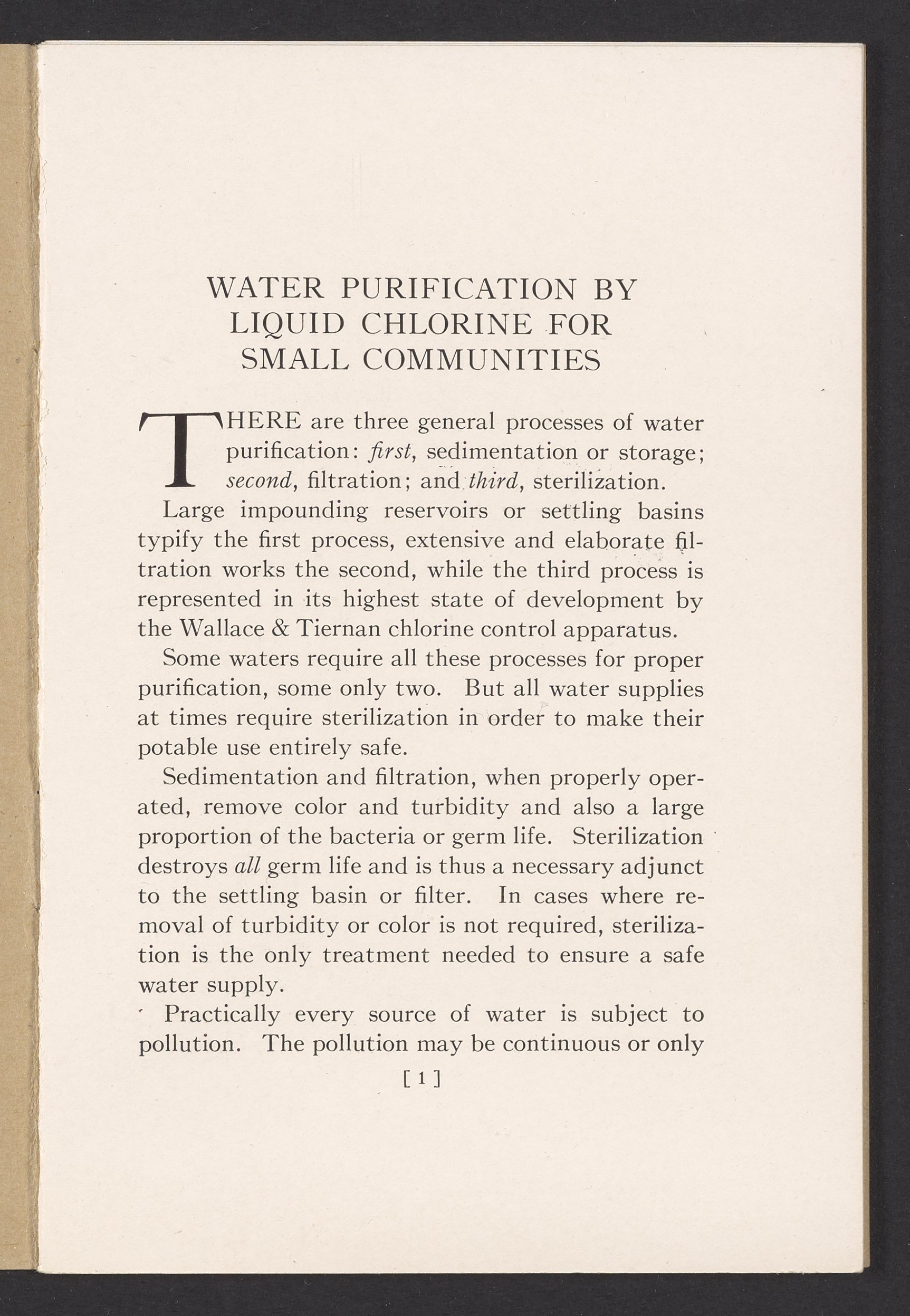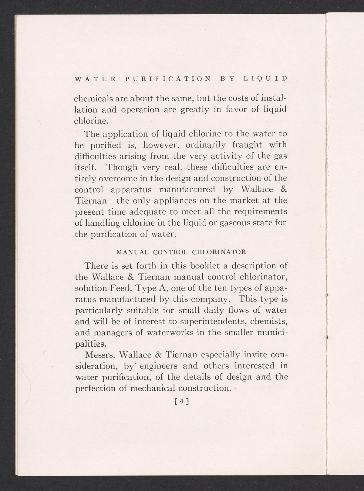 Small JPG1200 x 1731px — 362 KBFull-sized JPG1725 x 2488px — 711 KBOriginal fileTIFF — 1725 x 2488px — 12.3 MBTechnical publication pamphlet providing information regarding the Wallace & Tiernan Co., Inc. manual control chlorinator apparatus. Discusses the sterilization of water by chlorination and the advantages of using liquid chlorine for this purpose. The majority of the publication describes the mechanical construction and technical specifications of the control chlorinator apparatus. Includes diagrams of the apparatus and a photographic print. The work is digitized in its entirety.