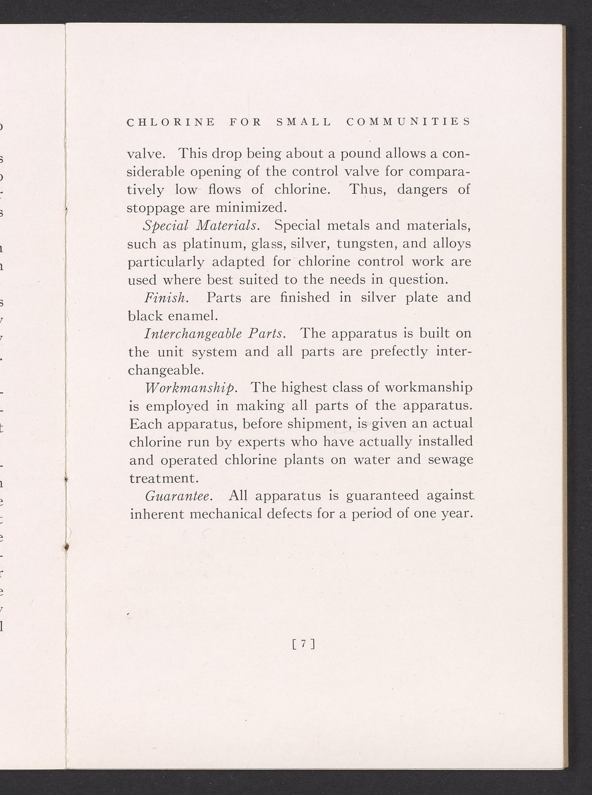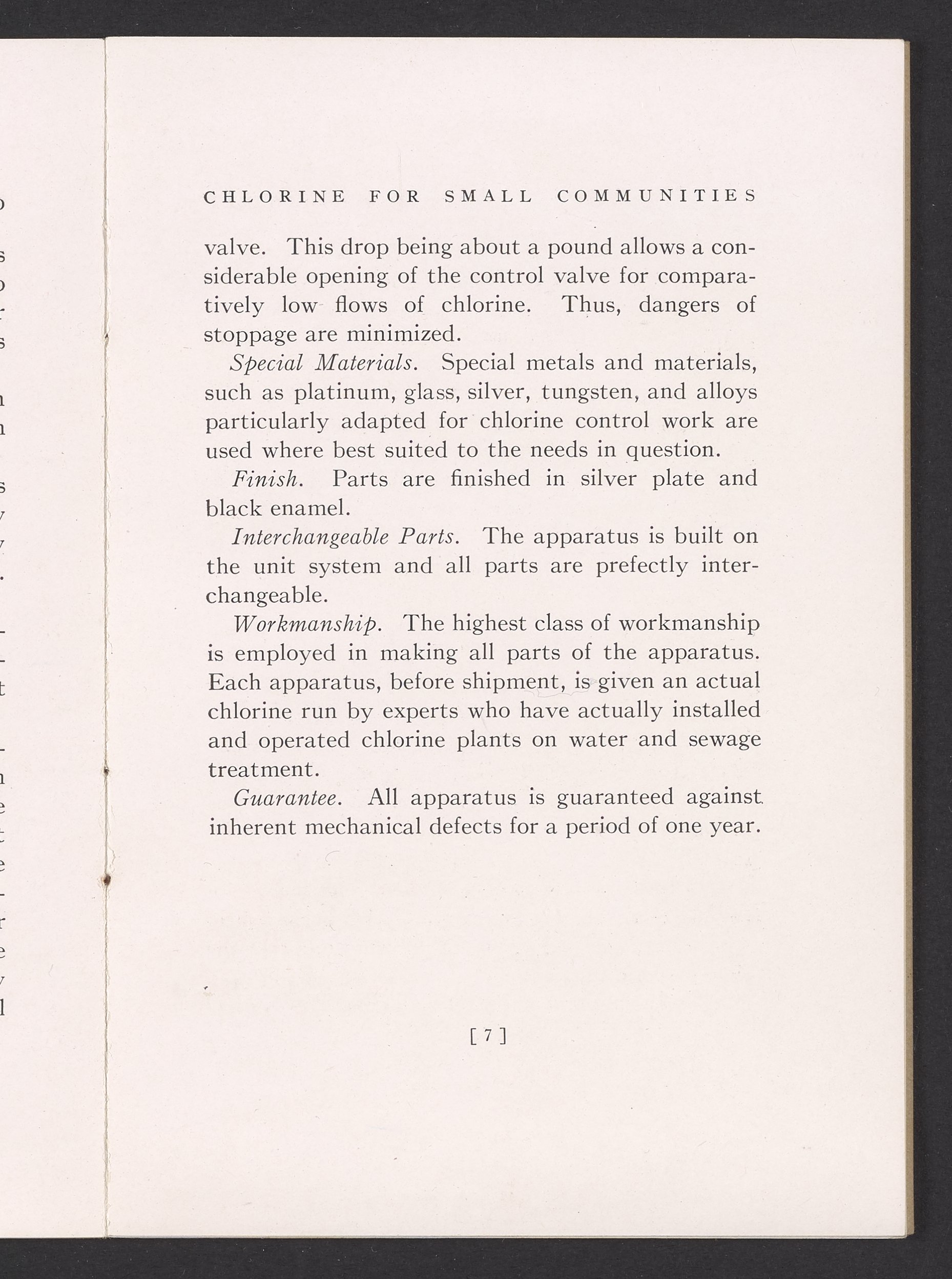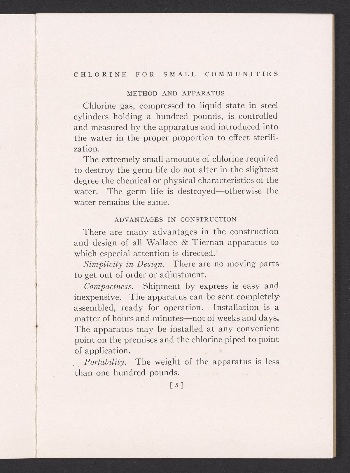 Small JPG1200 x 1731px — 362 KBFull-sized JPG1725 x 2488px — 711 KBOriginal fileTIFF — 1725 x 2488px — 12.3 MBTechnical publication pamphlet providing information regarding the Wallace & Tiernan Co., Inc. manual control chlorinator apparatus. Discusses the sterilization of water by chlorination and the advantages of using liquid chlorine for this purpose. The majority of the publication describes the mechanical construction and technical specifications of the control chlorinator apparatus. Includes diagrams of the apparatus and a photographic print. The work is digitized in its entirety.