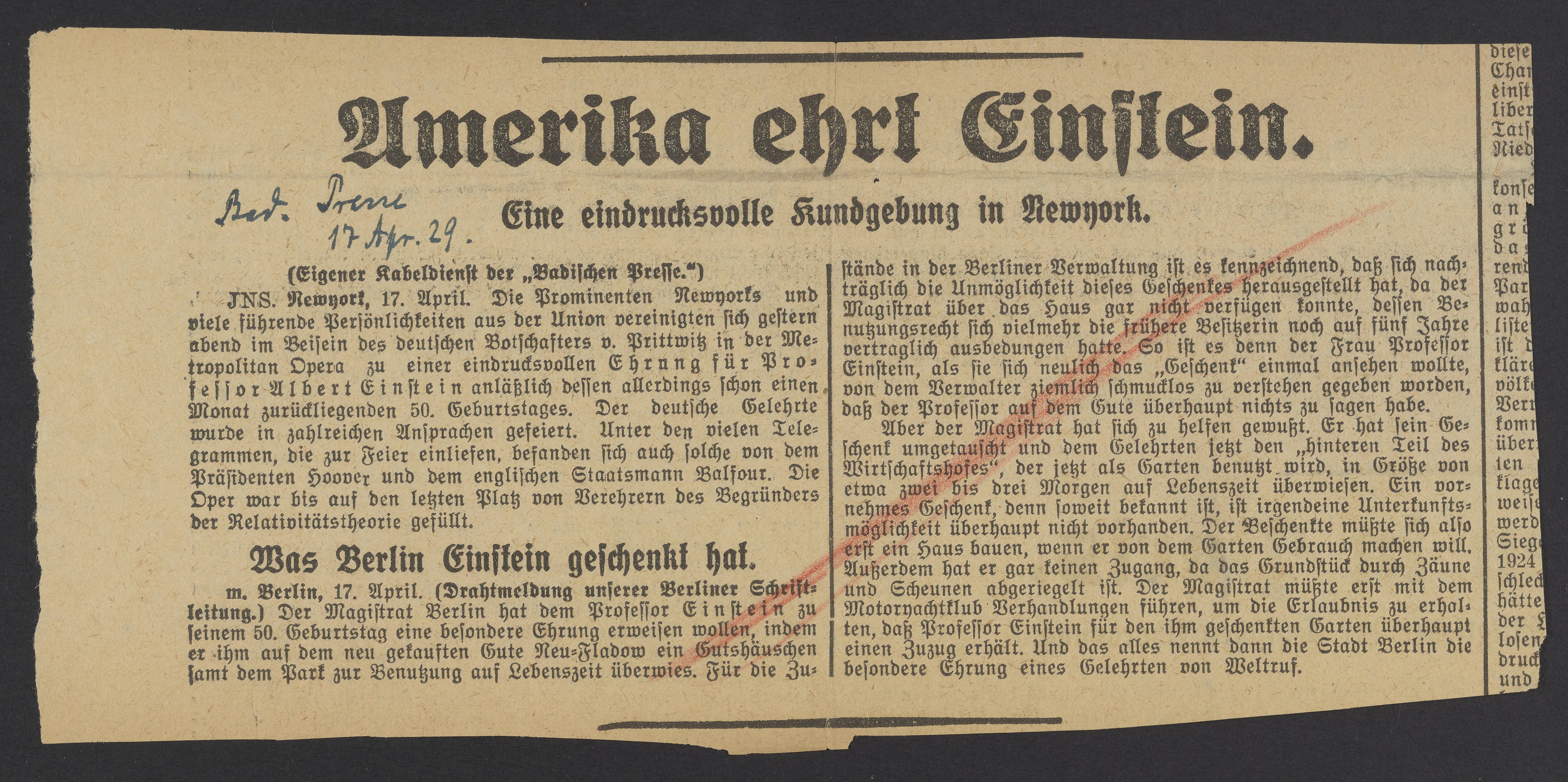 “Amerika Ehrt Einstein. Eine Eindrucksvolle Kundgebung in New York,” April 17, 1929. Papers of Georg and Max Bredig, Box 5, Folder 2. Science History Institute. Philadelphia. https://digital.sciencehistory.org/works/k6e35ud.