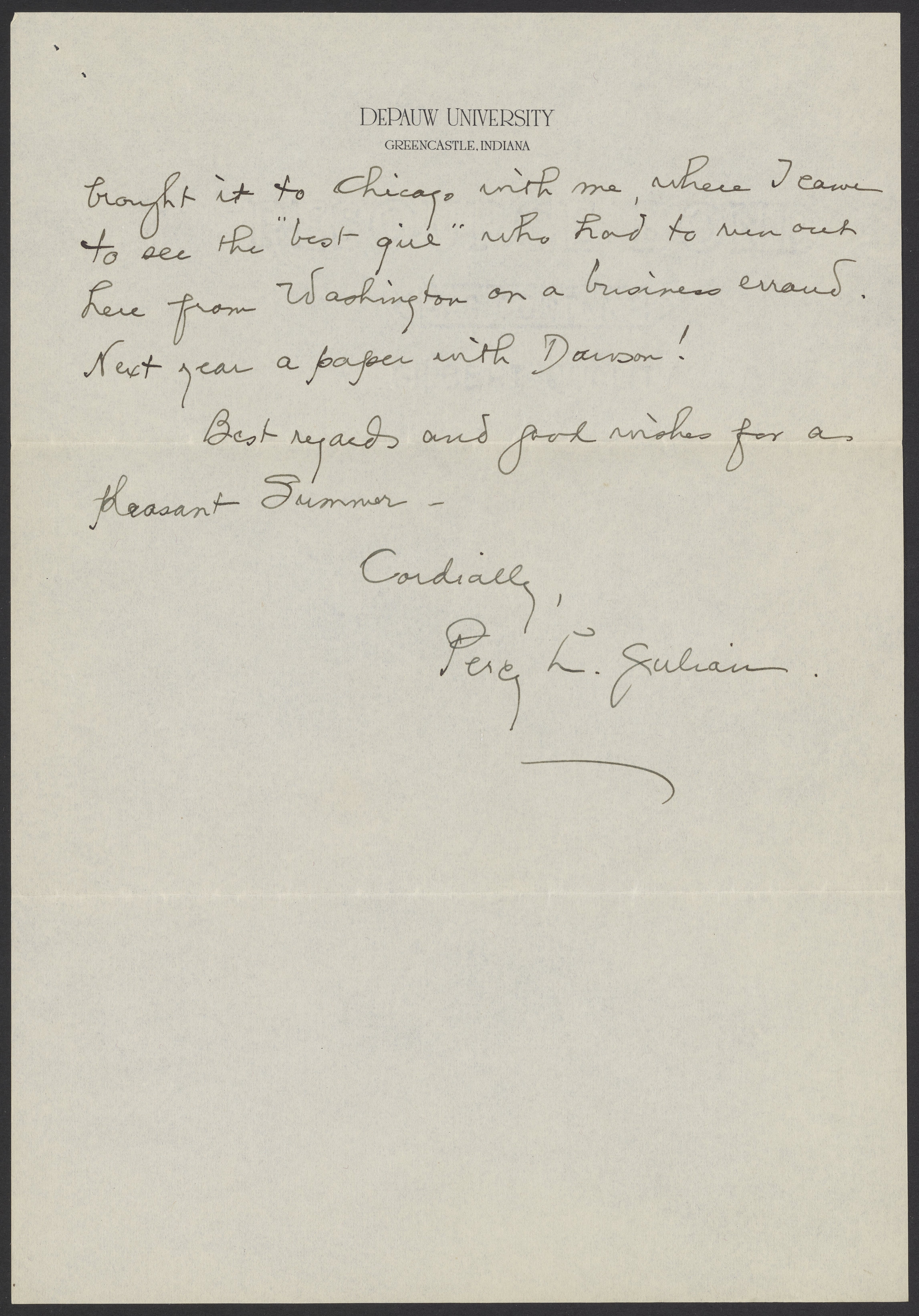Small JPG1200 x 1709px — 303 KBLarge JPG2880 x 4101px — 1.9 MBFull-sized JPG4598 x 6548px — 4.7 MBOriginal fileTIFF — 4598 x 6548px — 86.2 MBPercy Julian (1899-1975) writes to his student, Ray Fields Dawson (1911-2012) to express his pleasure at Dawson's excellent performance in organic chemistry. He notes upcoming student publications and hopes that next year he and Dawson can co-author a paper.