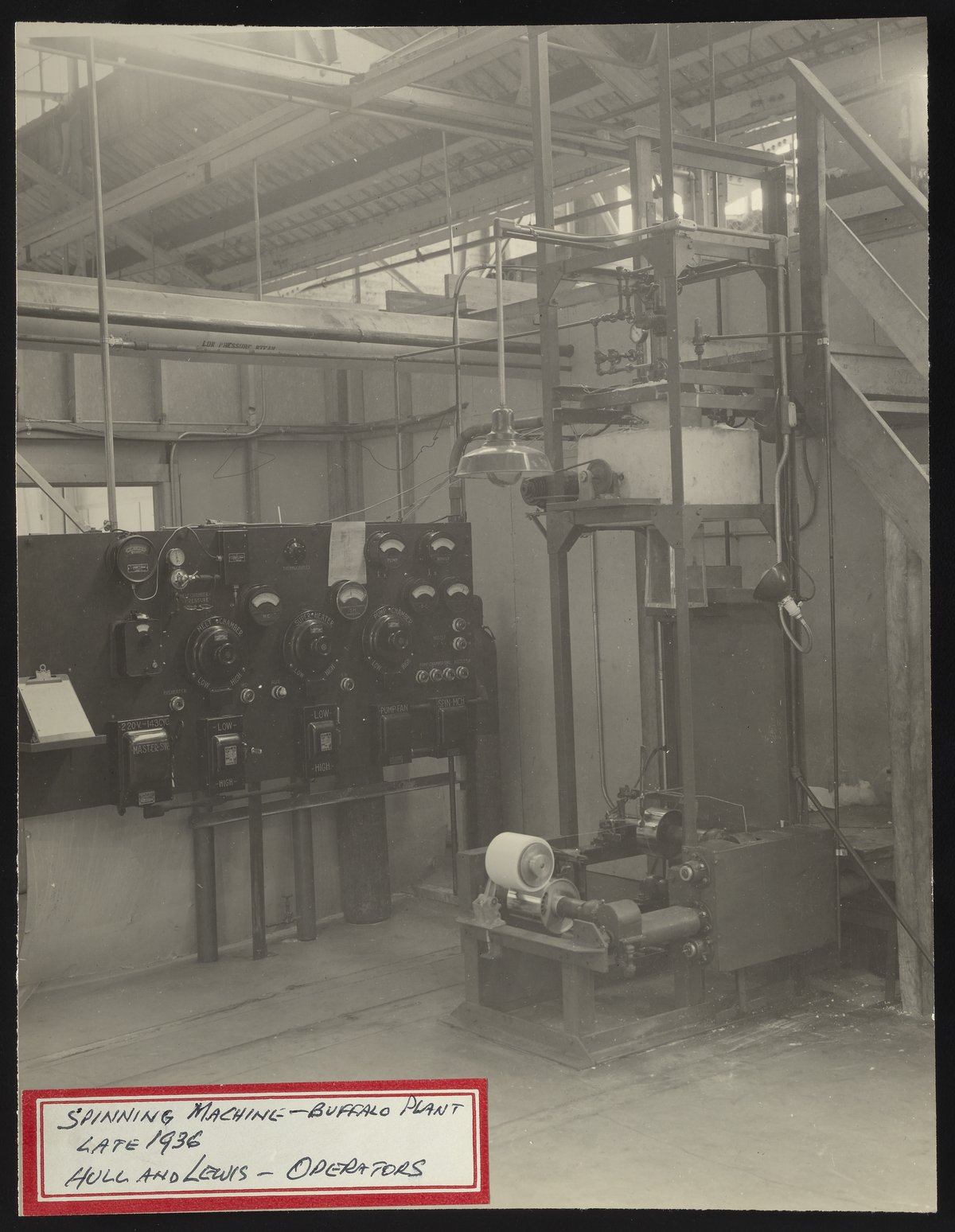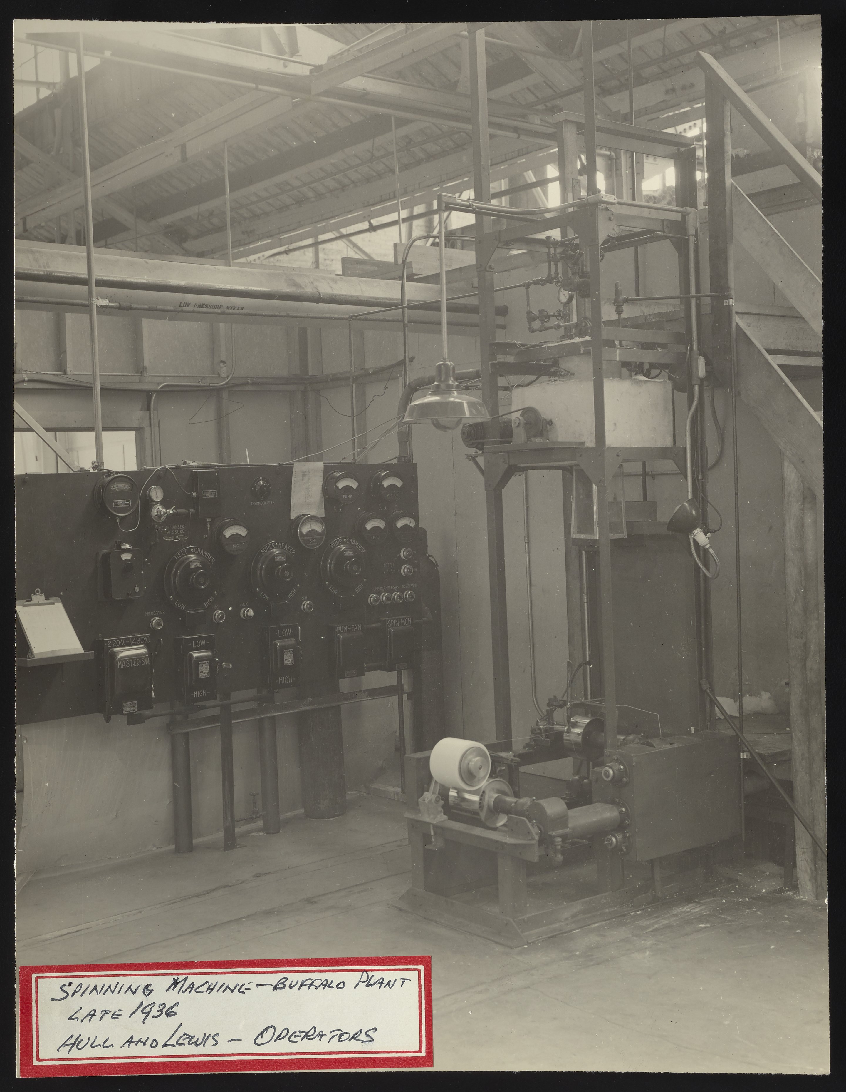 General view of the spinning machine used at DuPont's Buffalo plant during the early stages of nylon production and research. This spinning machine, which was operated by Don Hull and George Lewis, was subsequently transferred to the DuPont Experimental Station in Wilmington, Delaware in early 1937.