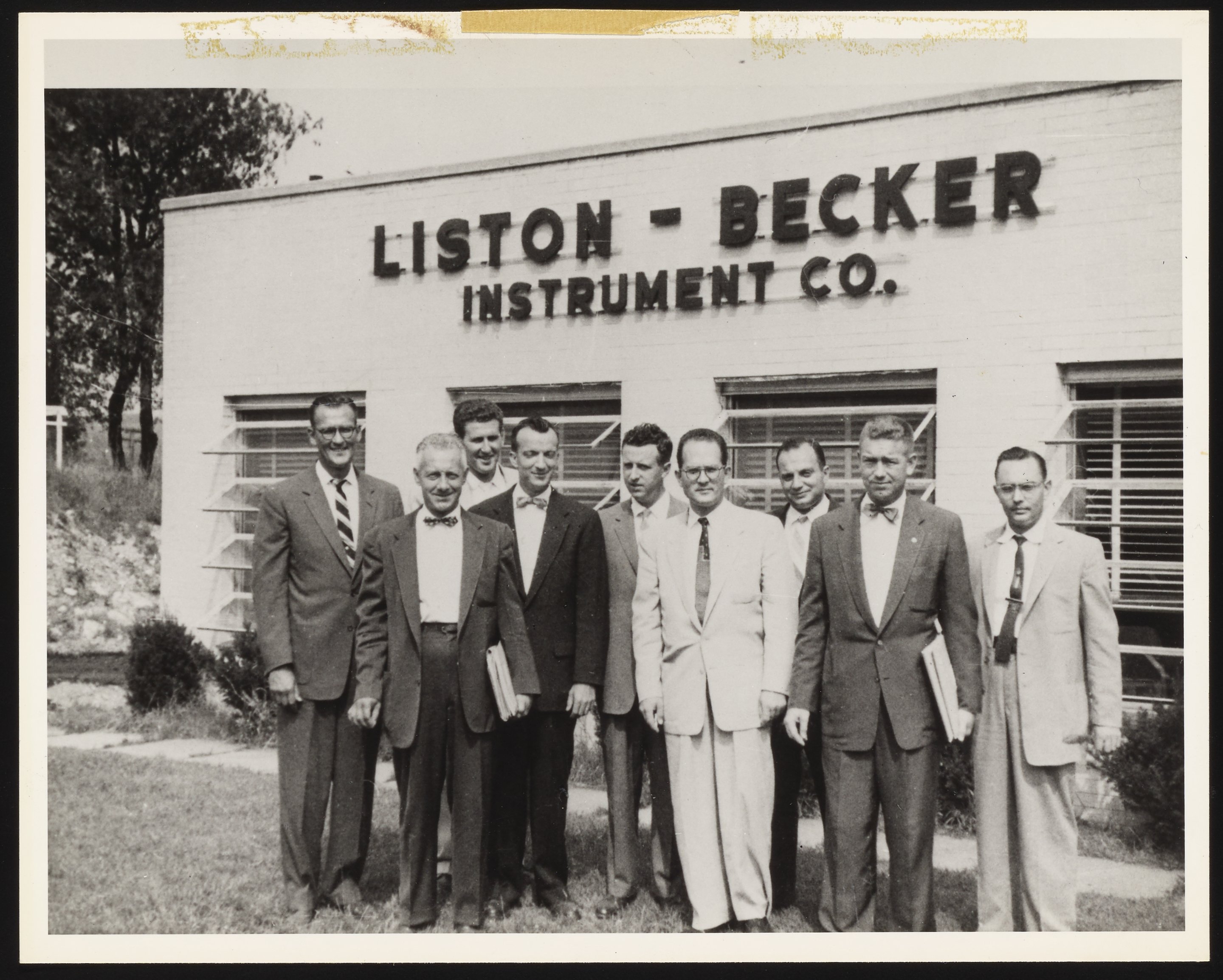 This photo was taken the same year that Beckman Instruments acquired Liston-Becker. This acquisition brought Liston-Becker's emissions testers and analyzers to Beckman, which continued to produce those instruments along with other pollution-reducing products. All of the men in this photo are unidentified.