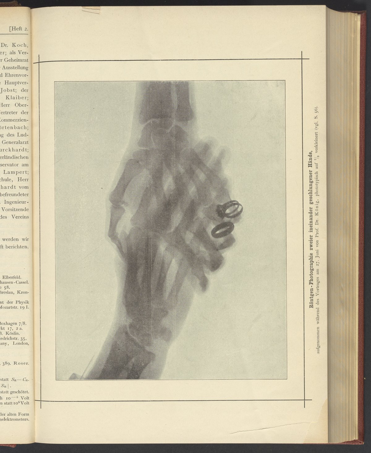 “Röntgen-Photographie Zweier Ineinander Geschlungener Hände.” Halle an der Saale, Germany: Wilhelm Knapp Verlag (Düsseldorf), 1896–1897. Science History Institute. Philadelphia. https://digital.sciencehistory.org/works/k930bx74m.