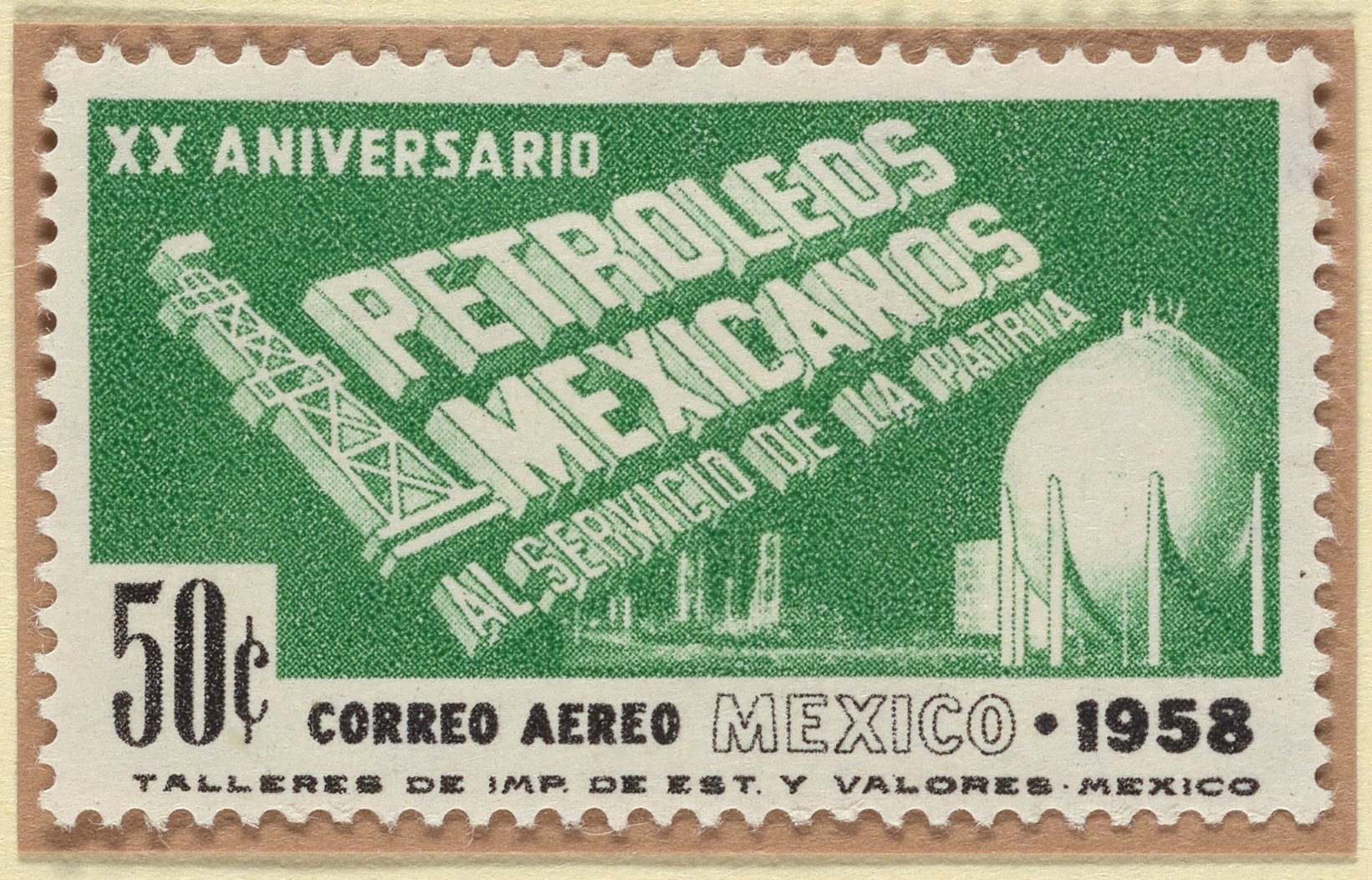 Mexico. Dirección General de Talleres de Impresión de Estampillas y Valores. “Mexican Postage Stamp Commemorating Petróleos Mexicanos (20th Anniversary),” 1958. Witco Stamp Collection, Box 7. Science History Institute. Philadelphia. https://digital.sciencehistory.org/works/kalyfix.