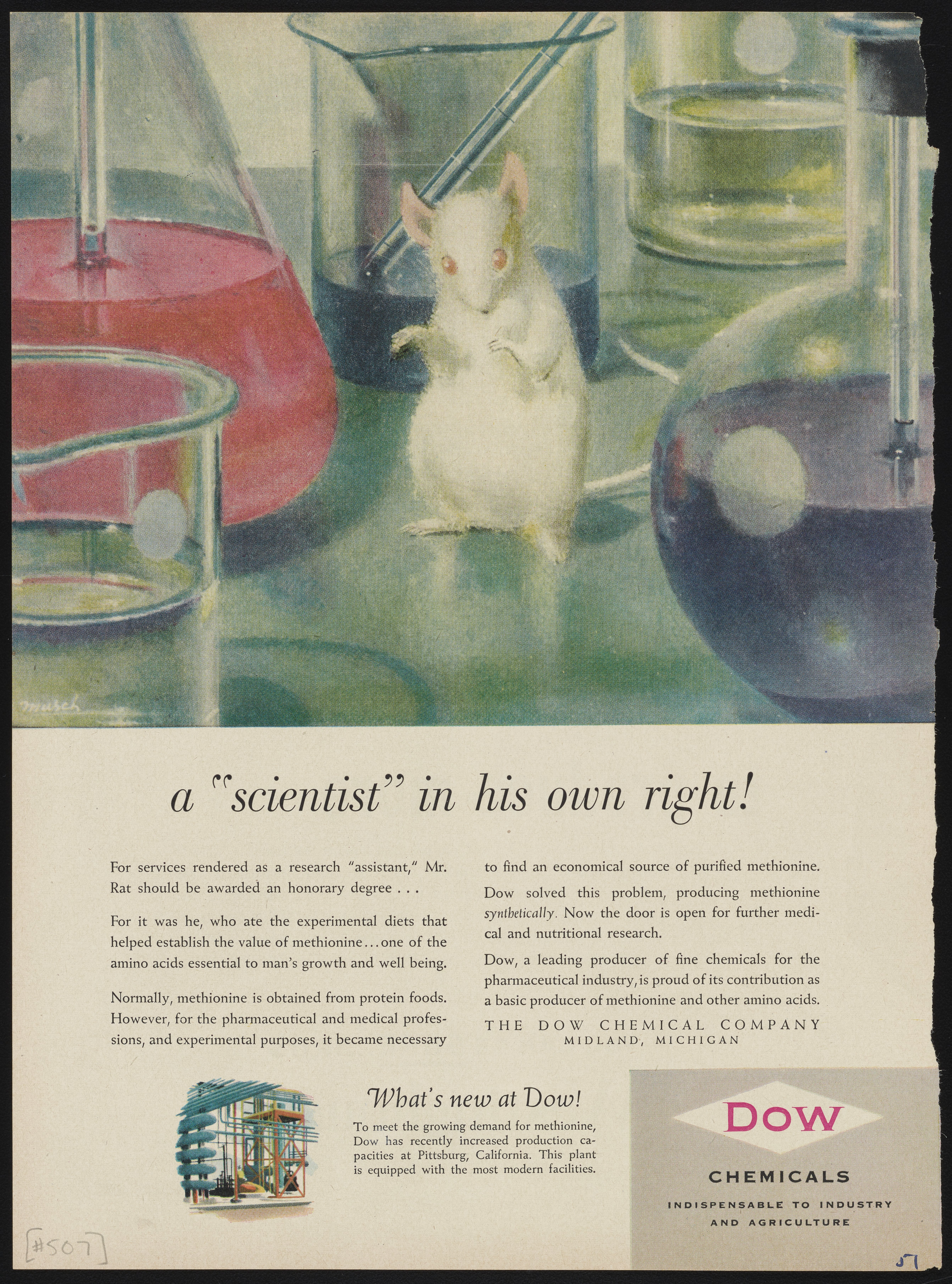 Color print advertisement for synthetic methionine and other amino acids manufactured and sold by the Dow Chemical Company for use in pharmaceuticals and medical and nutritional research. The advertisement features an illustration of a white lab rat standing amongst several beakers and pieces of laboratory glassware, with accompanying text detailing the use of lab rats in experimental research to establish the nutritional value of methionine. The text goes on to discuss Dow's efforts to meet the growing demand for methionine and other amino acids from pharmaceutical and medical professionals.