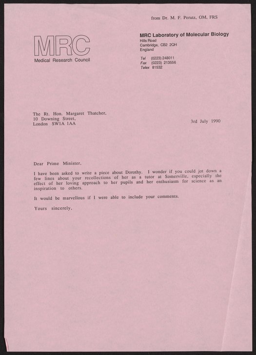 Perutz, Max F. “Letter from Max Perutz to Margaret Thatcher, July 3, 1990,” July 3, 1990. History of Molecular Biology Collection, Box 74, Folder 3. Science History Institute. Philadelphia. https://digital.sciencehistory.org/works/kcpp2wu.