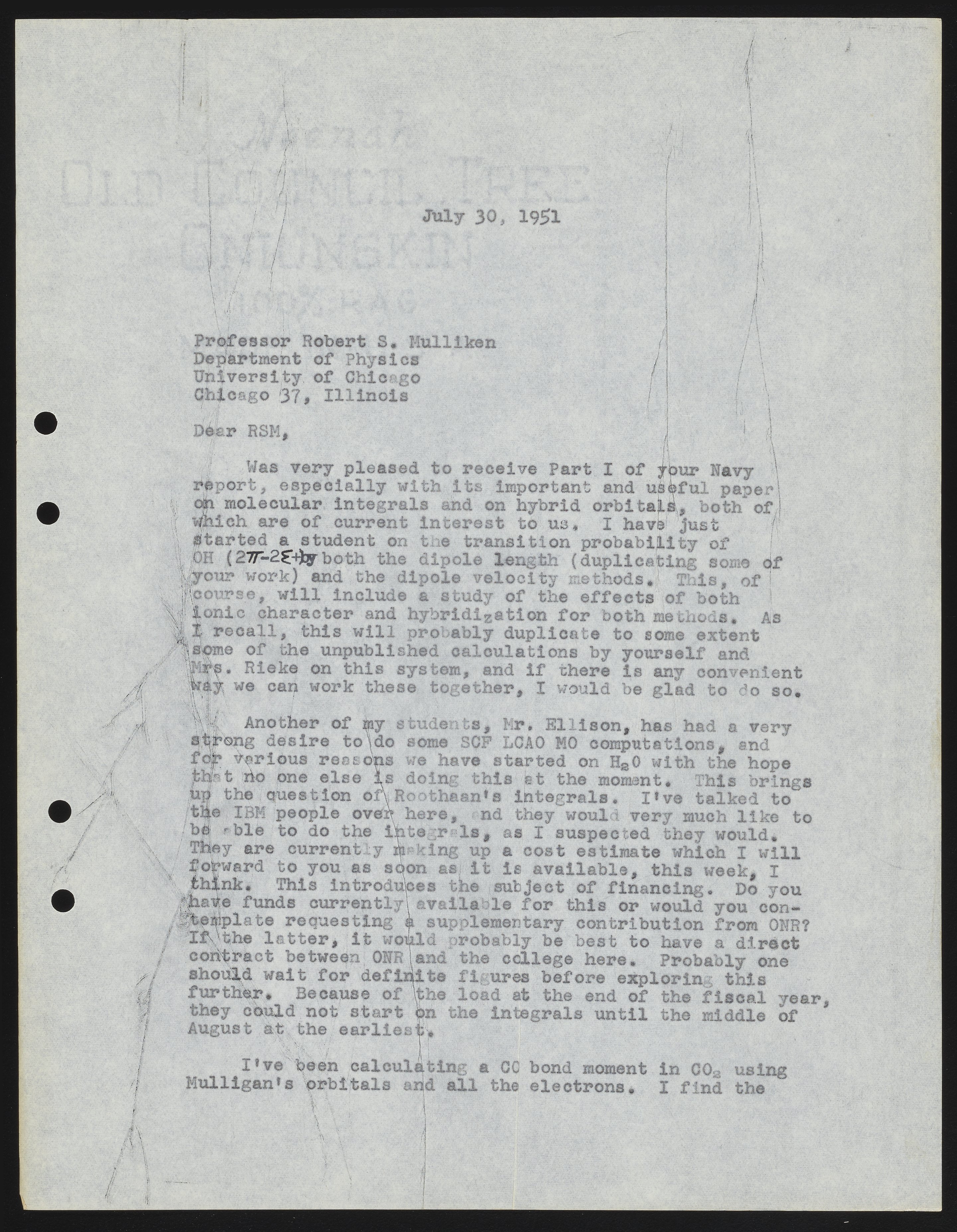 Shull, Harrison. “Letter from Harrison Shull to Robert S. Mulliken, 1951,” July 30, 1951. Robert S. Mulliken & Harrison Shull Correspondence, Box 1, Folder 2. Science History Institute. Philadelphia. https://digital.sciencehistory.org/works/kd17cs909.